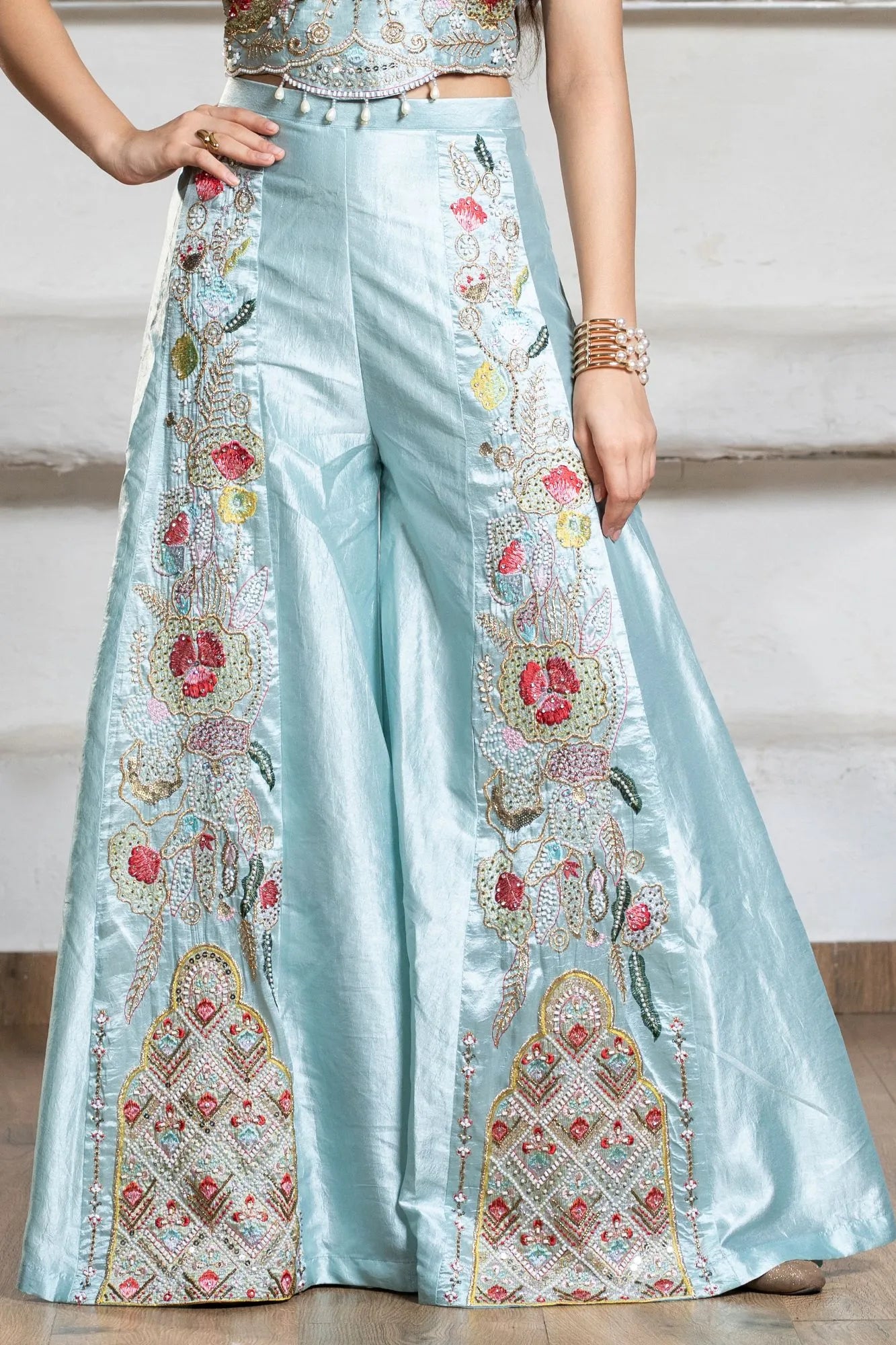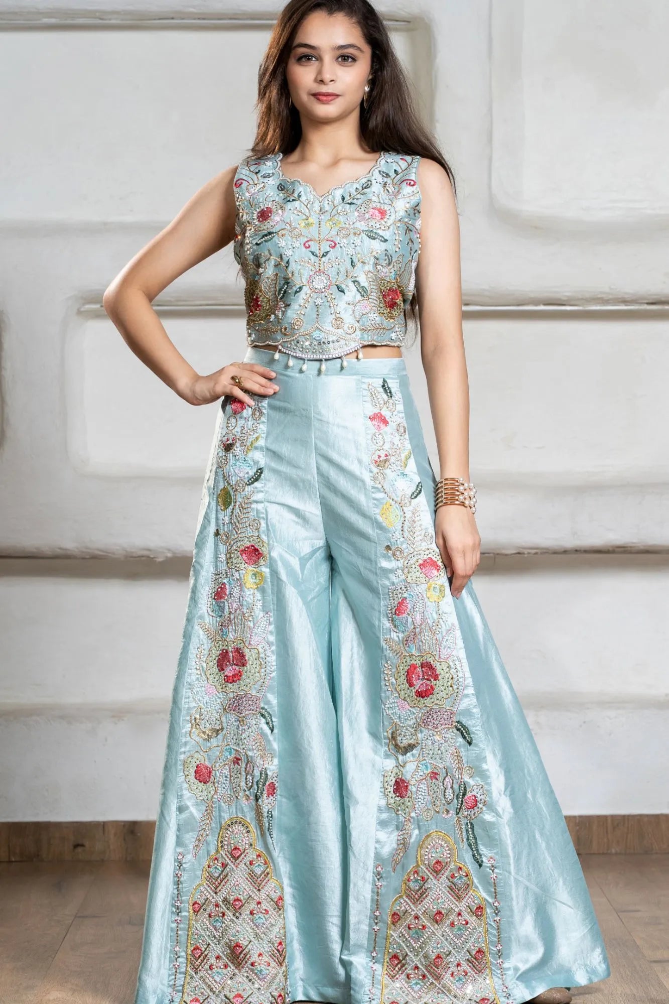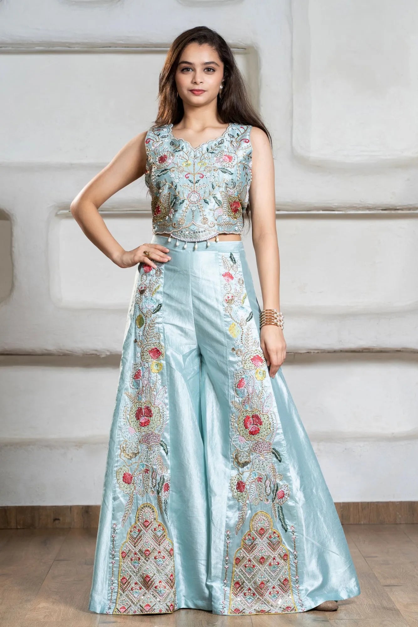 Aqua Blue Heavy Embroidered Crop Top with Flowing Palazzo For Girls