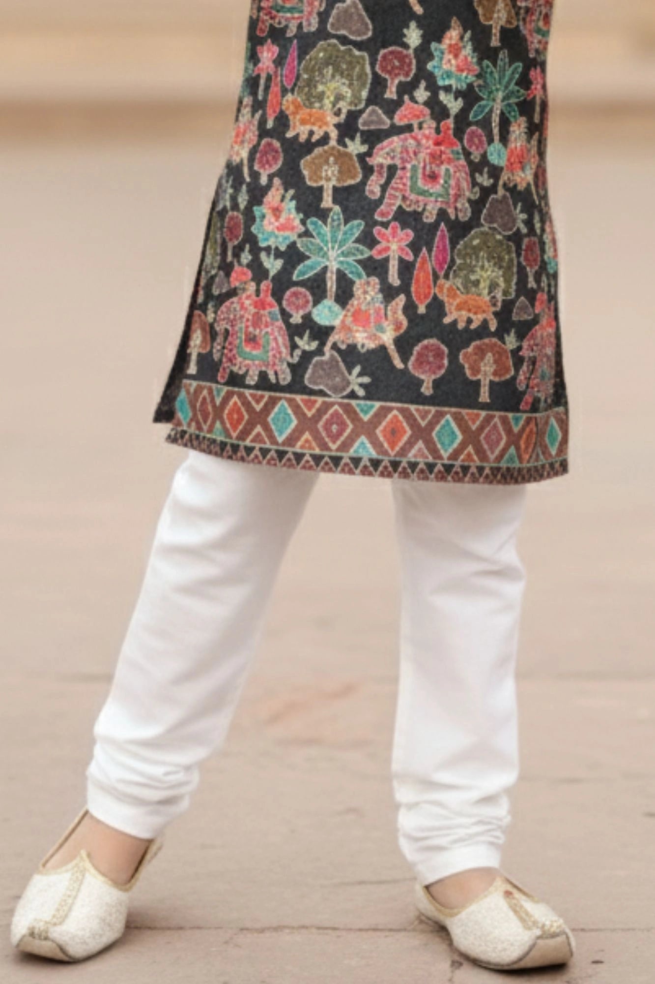 Black Printed Ethnic Kurta with White Pyjama Set For Boys