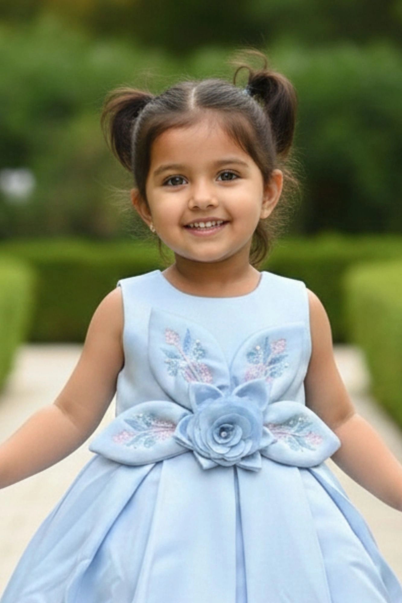 Blue 3D Floral Appliqué With Embroidery Party Wear Frock For Girls