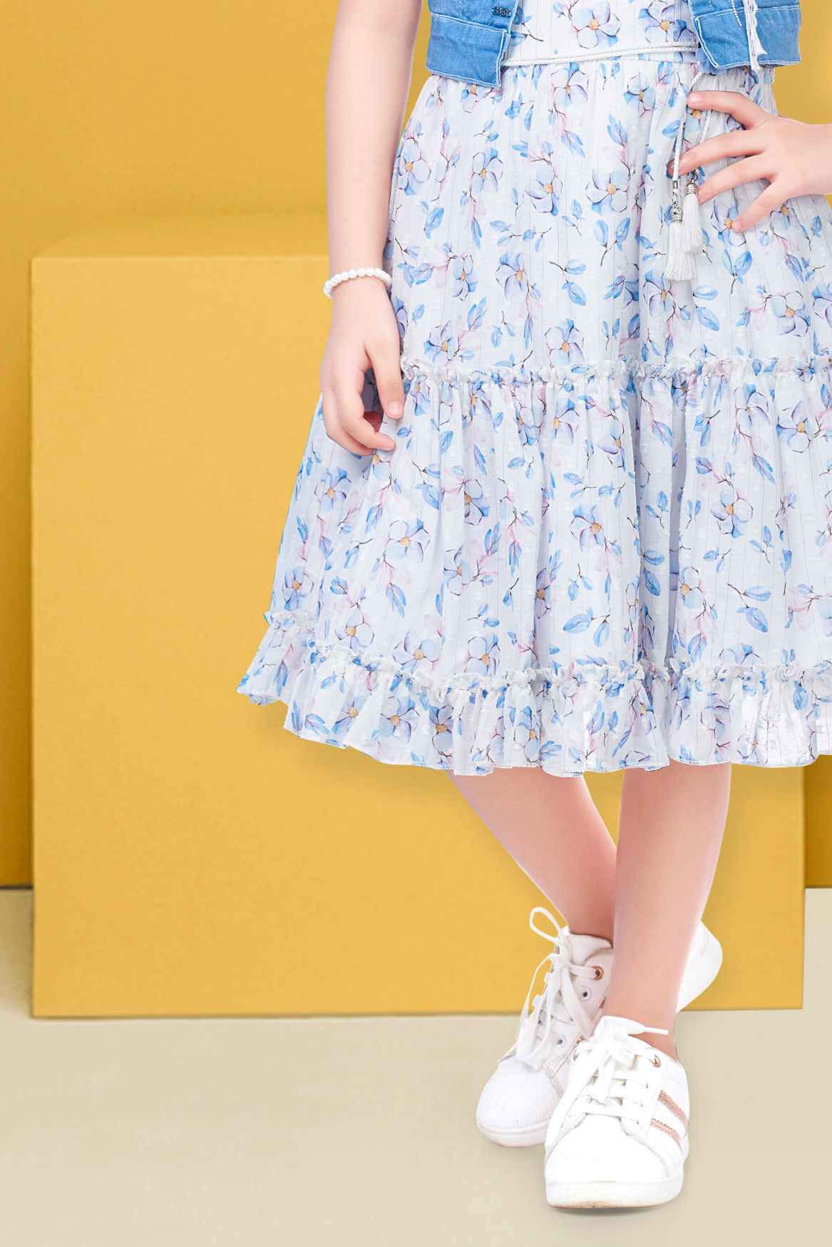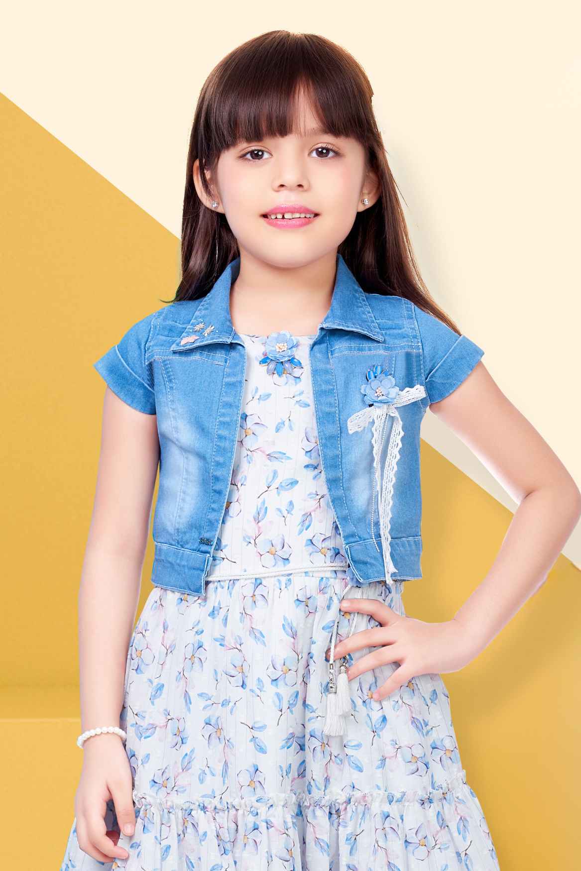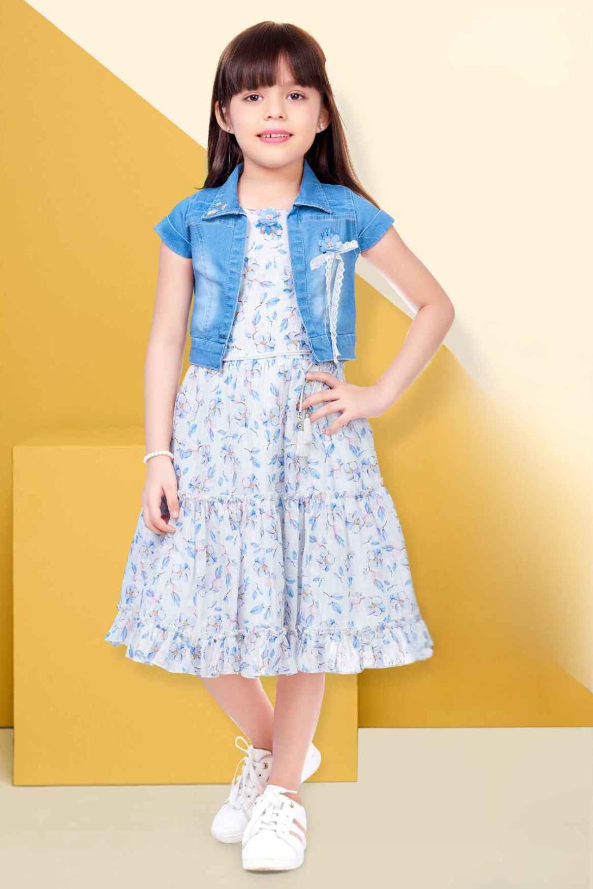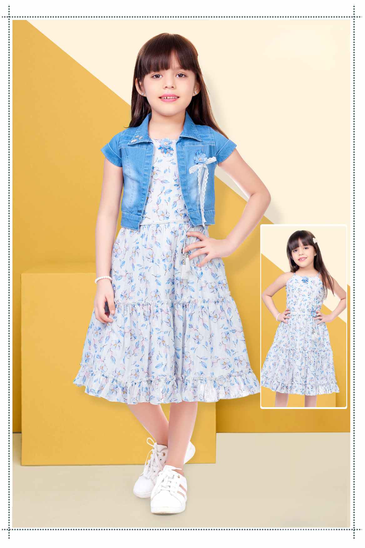 هذا الفستان الأزرق الرائع المزين بالزهور يأتي مع معطف جينز أنيق، مثالي لطفلتكِ الصغيرة. تصميمه بدون أكمام وطبعته الزهرية تجعله مثاليًا لقضاء يوم مميز، بينما يضيف معطف الجينز لمسة من الأناقة. ستعشق طفلتكِ هذا الزي العصري متعدد الاستخدامات!