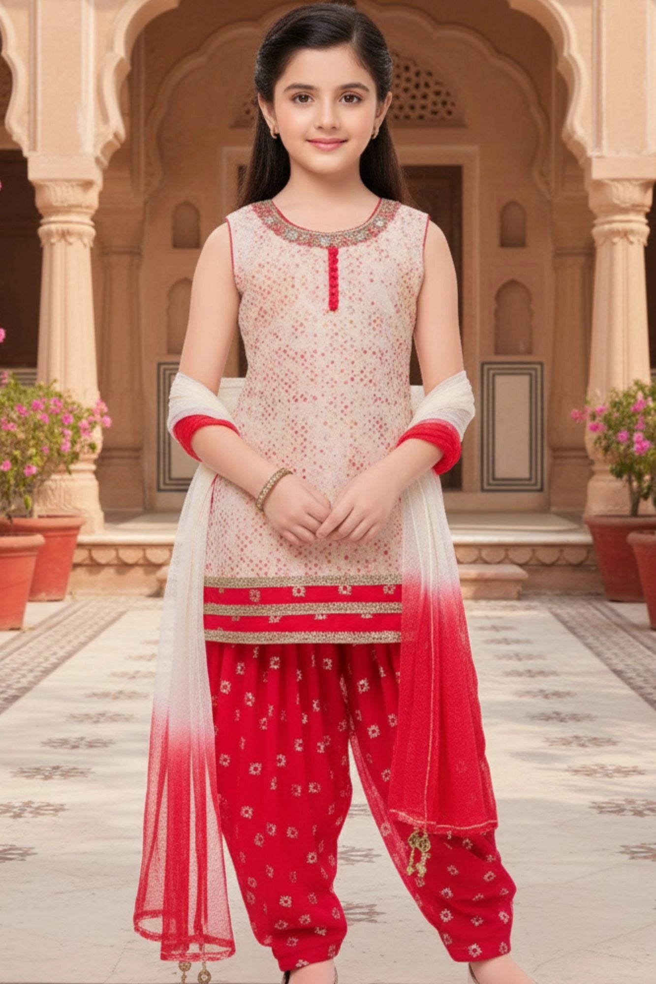 Cream and Red Printed Patiala Suit with Dupatta For Girls
