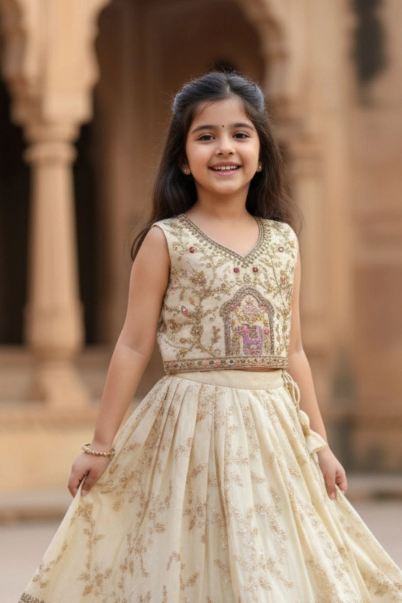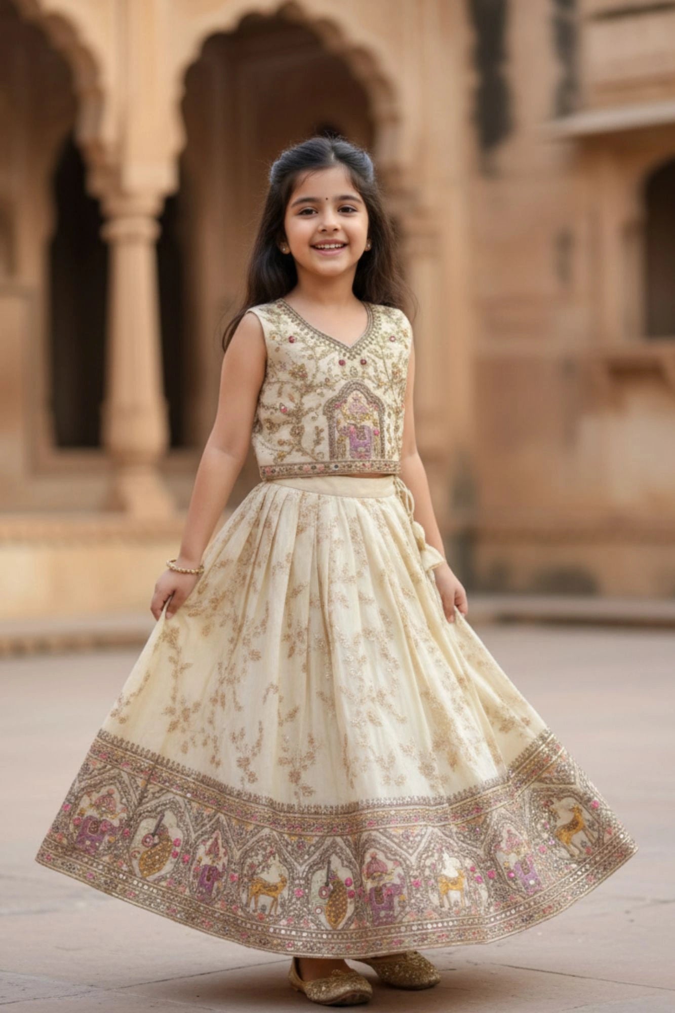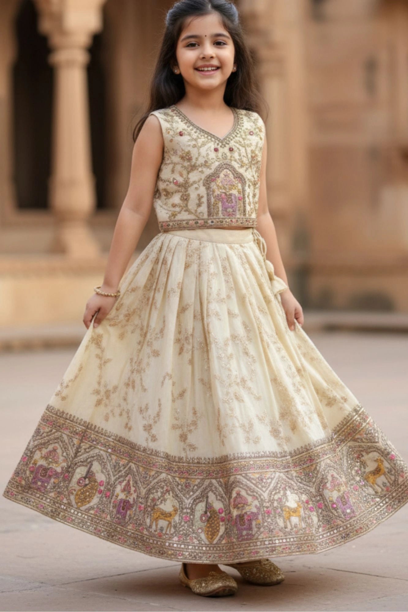 Cream Embroidered Lehenga Choli with Royal Elephant & Peacock Motif Border For Girls