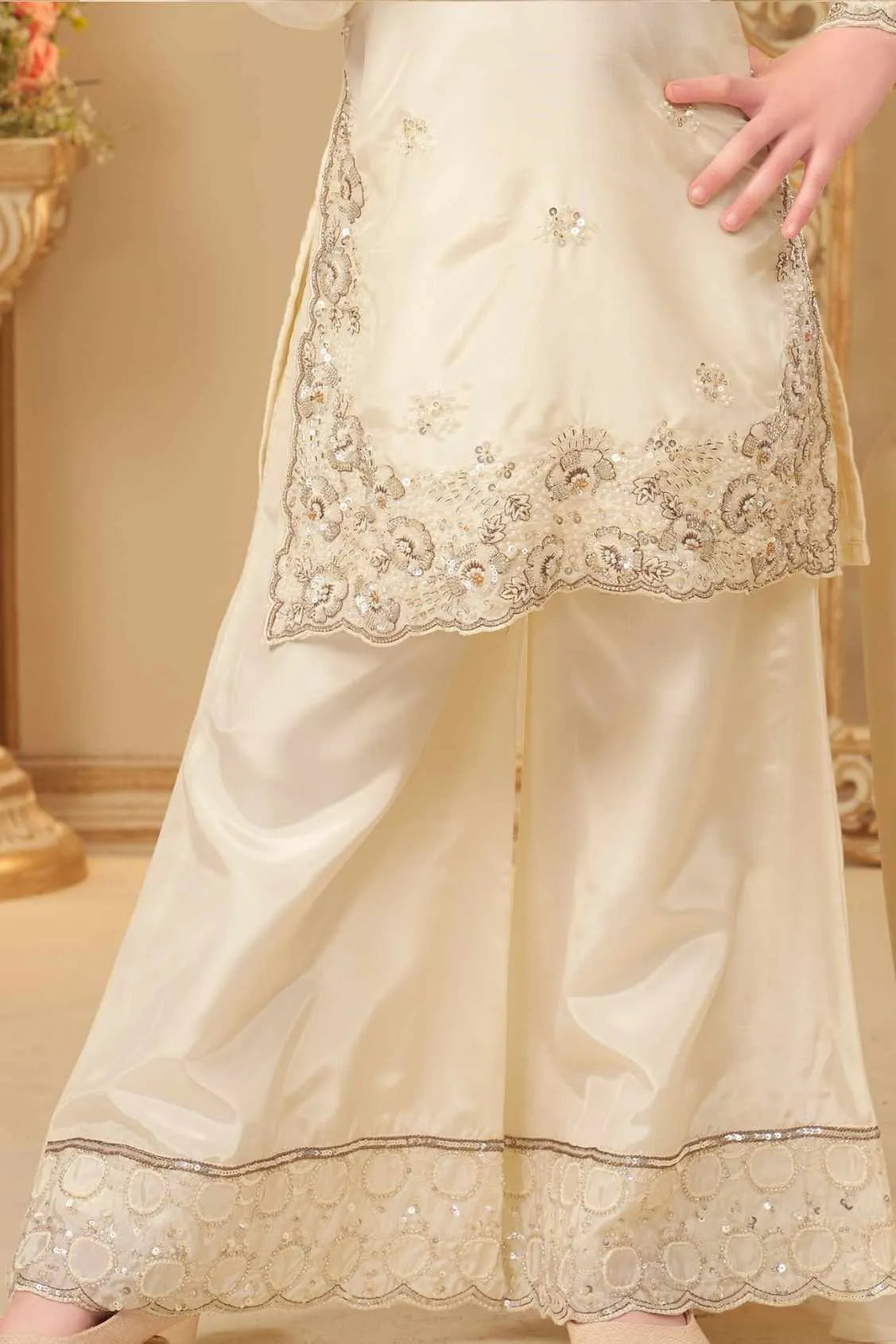 Cream Embroidered Palazzo Set with Dupatta for Girls