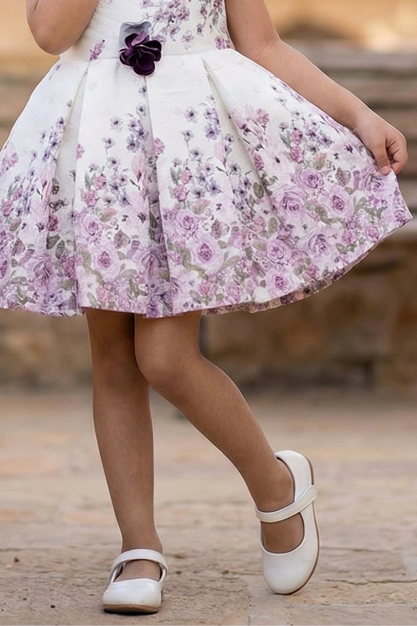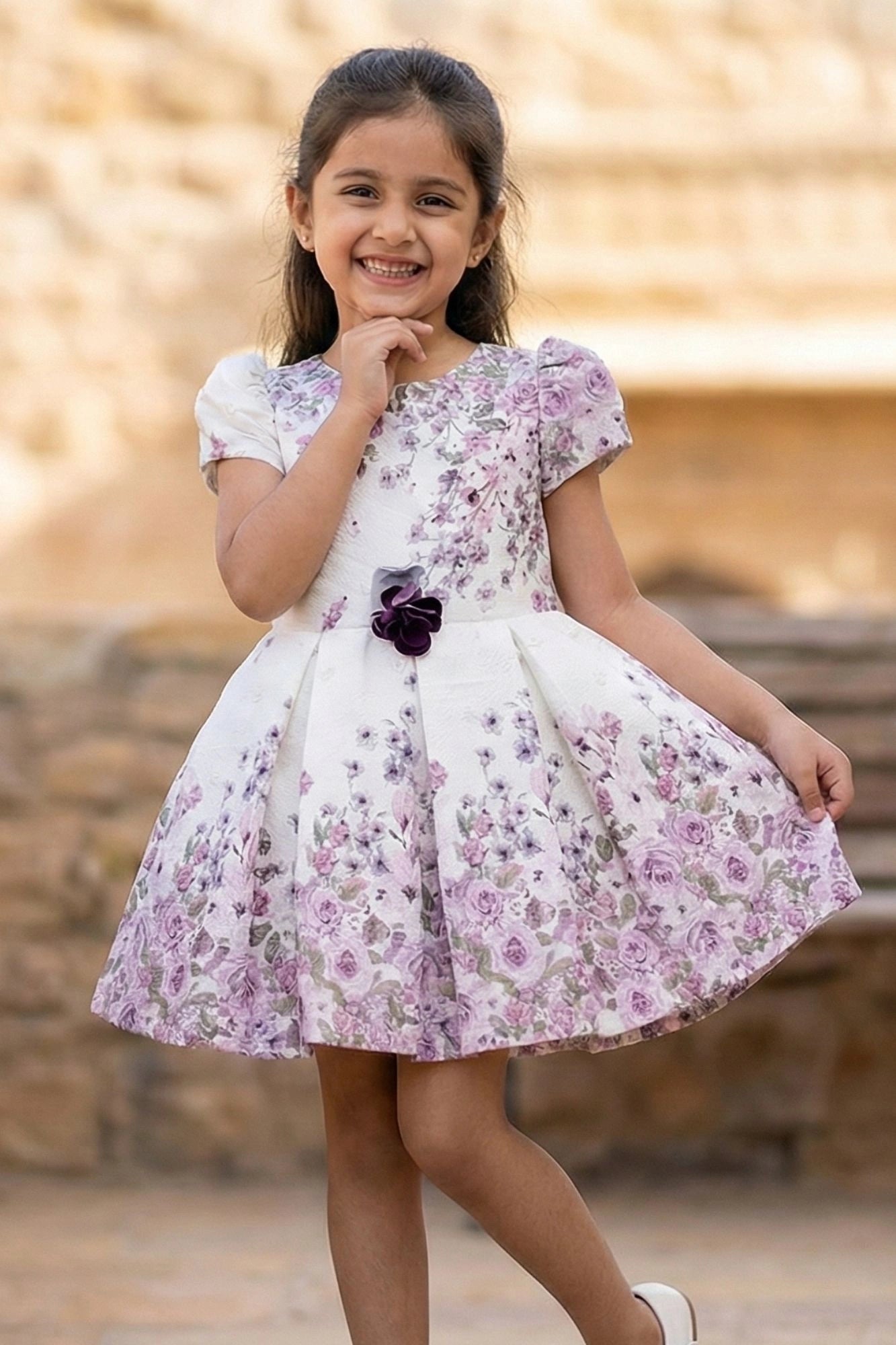 Cream Floral Party Frock with Pink Rose Print & Puff Sleeves For Girls