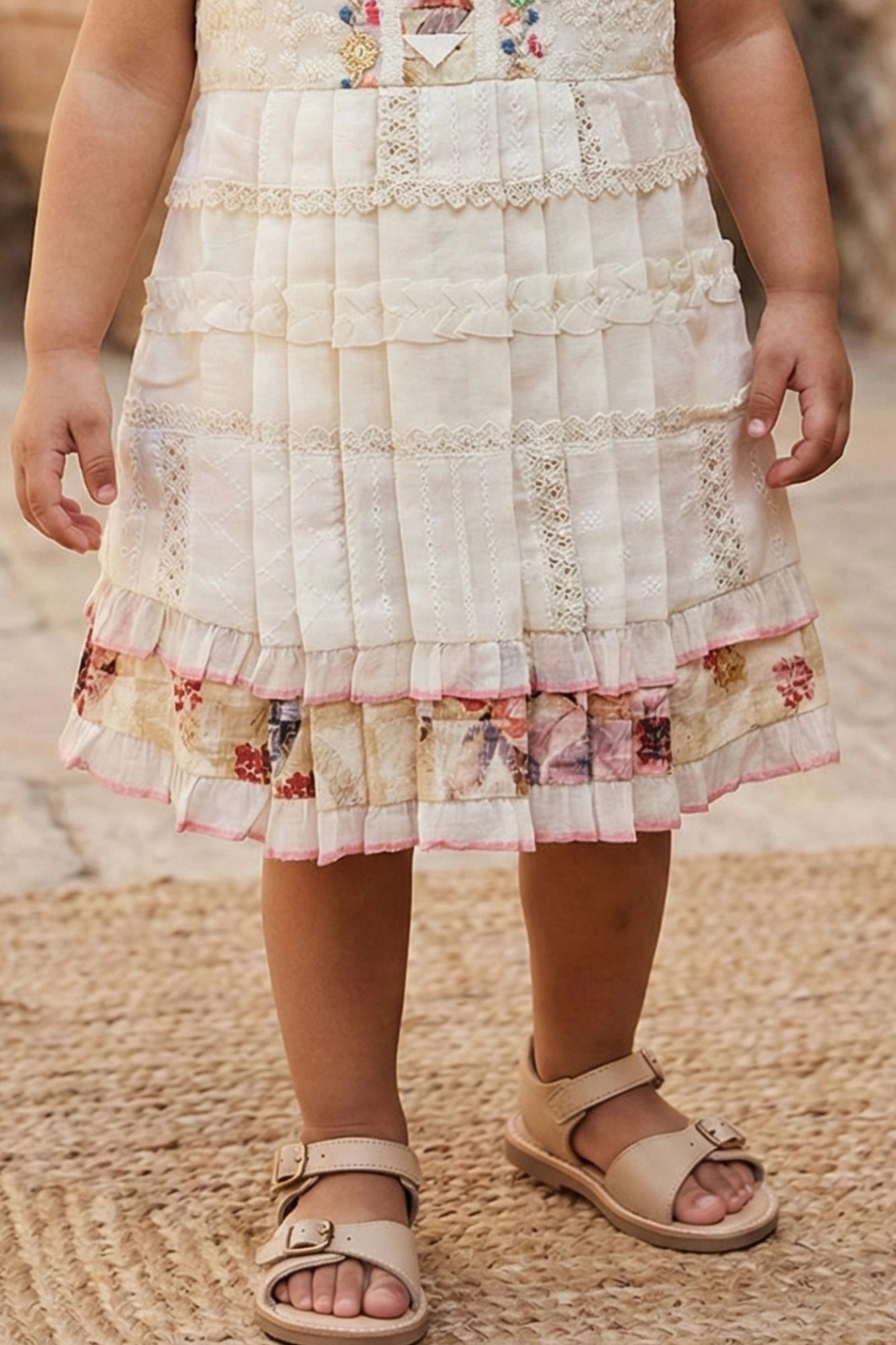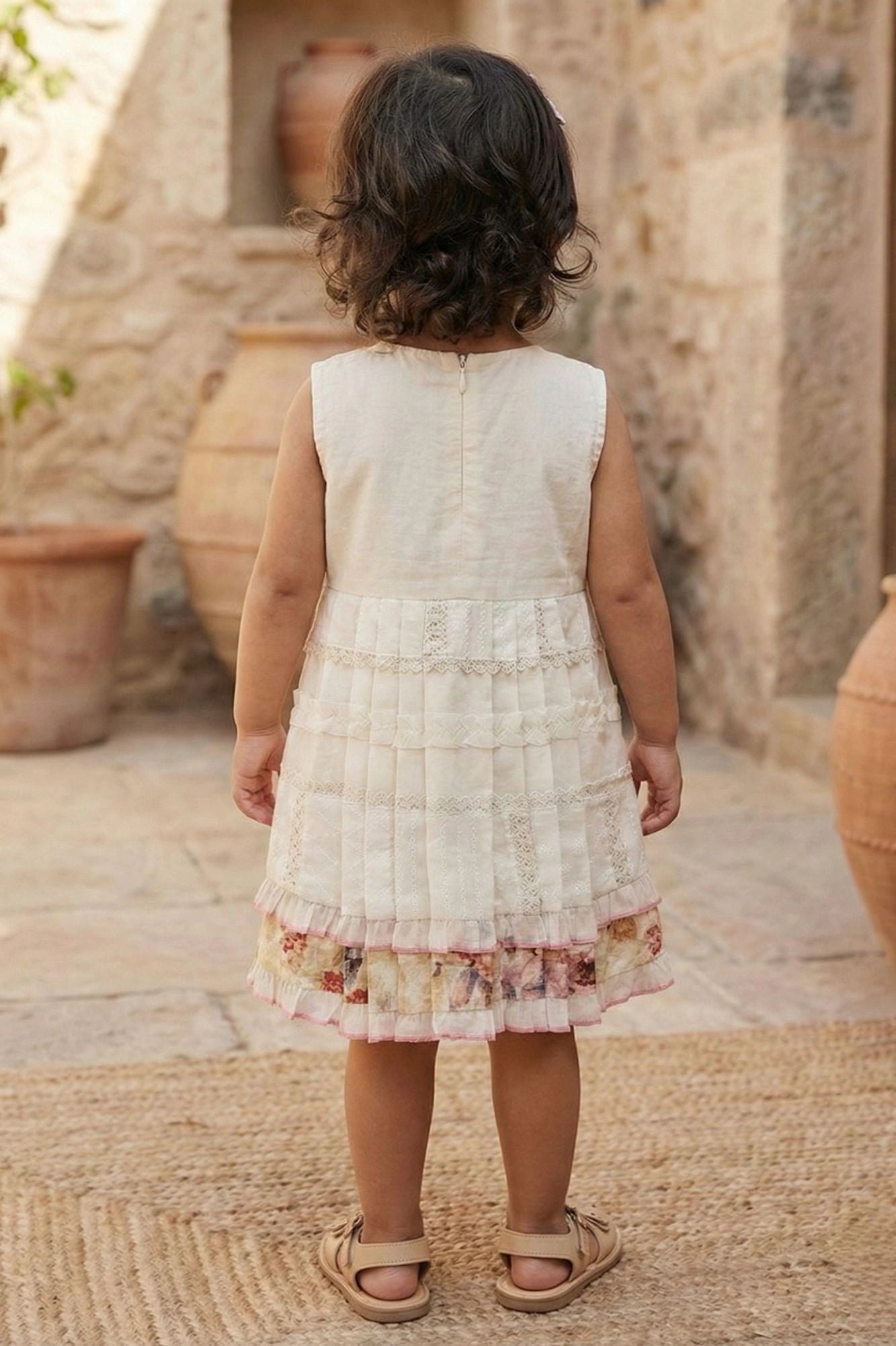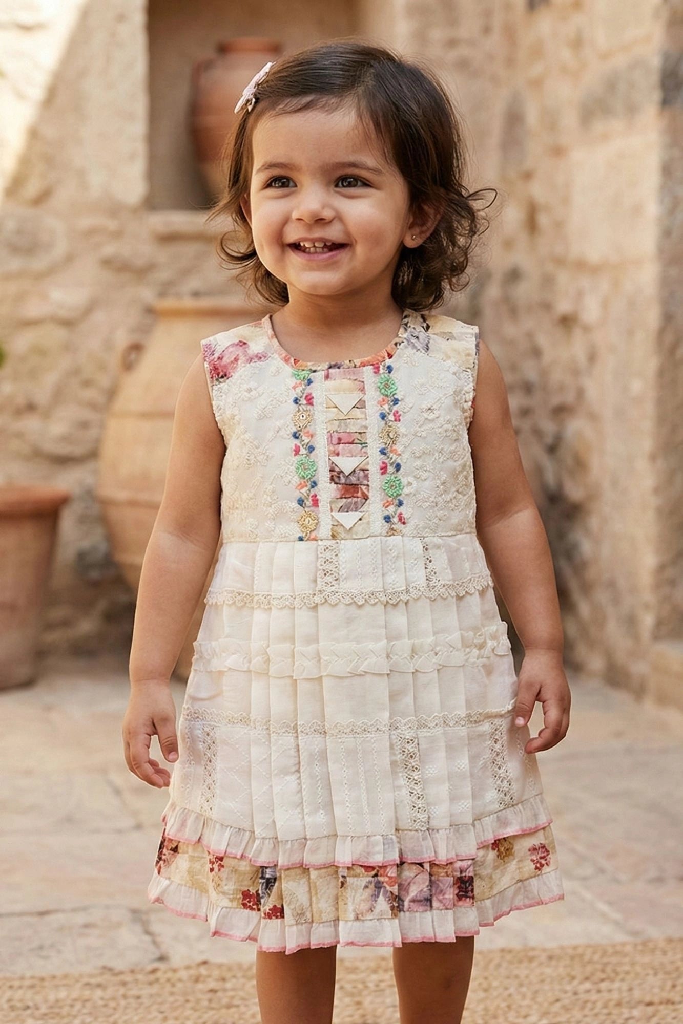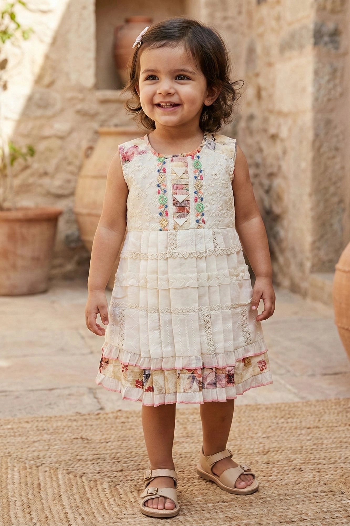 Cream Pleated Lace & Patch Floral Frock for Girls