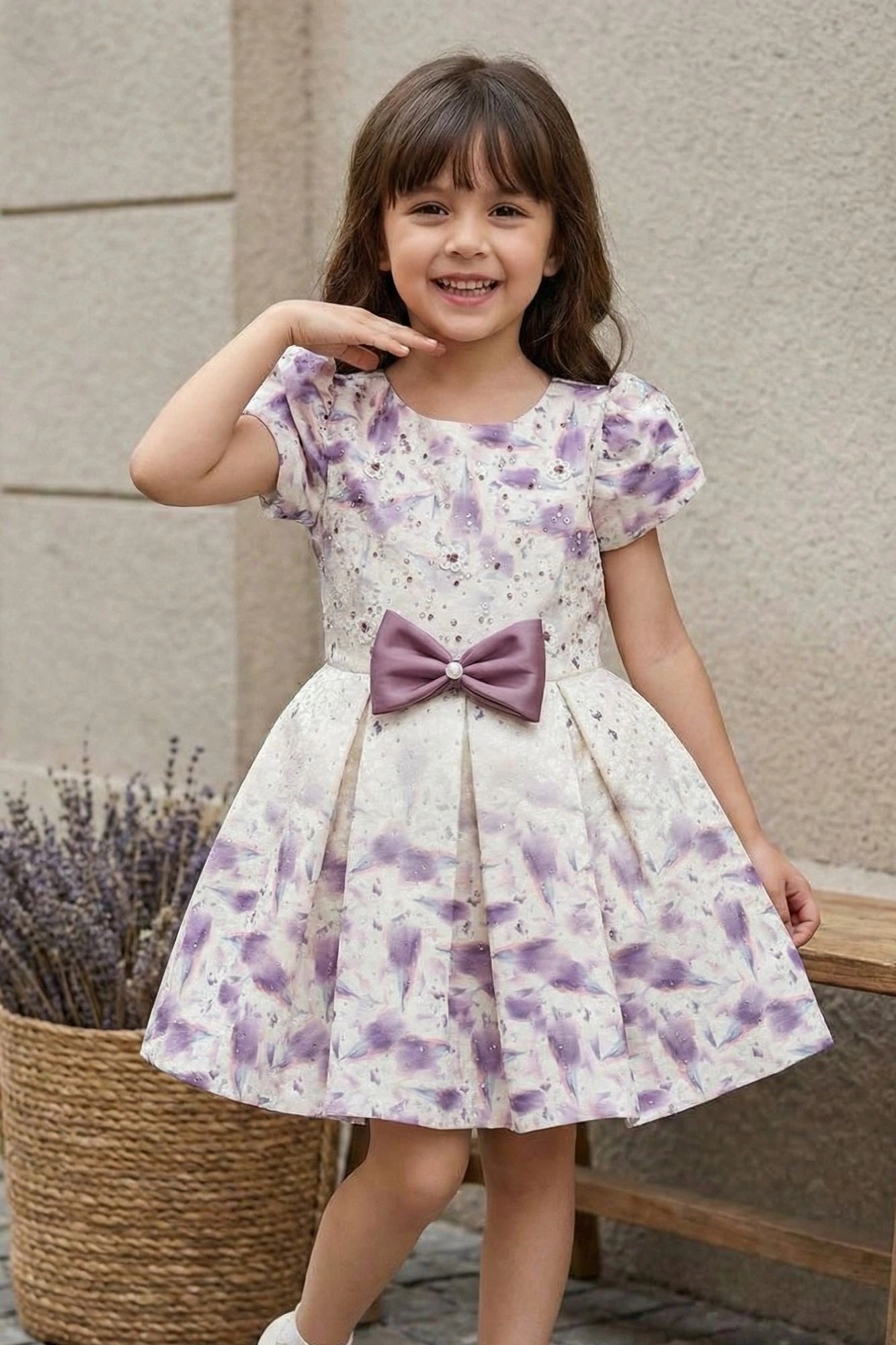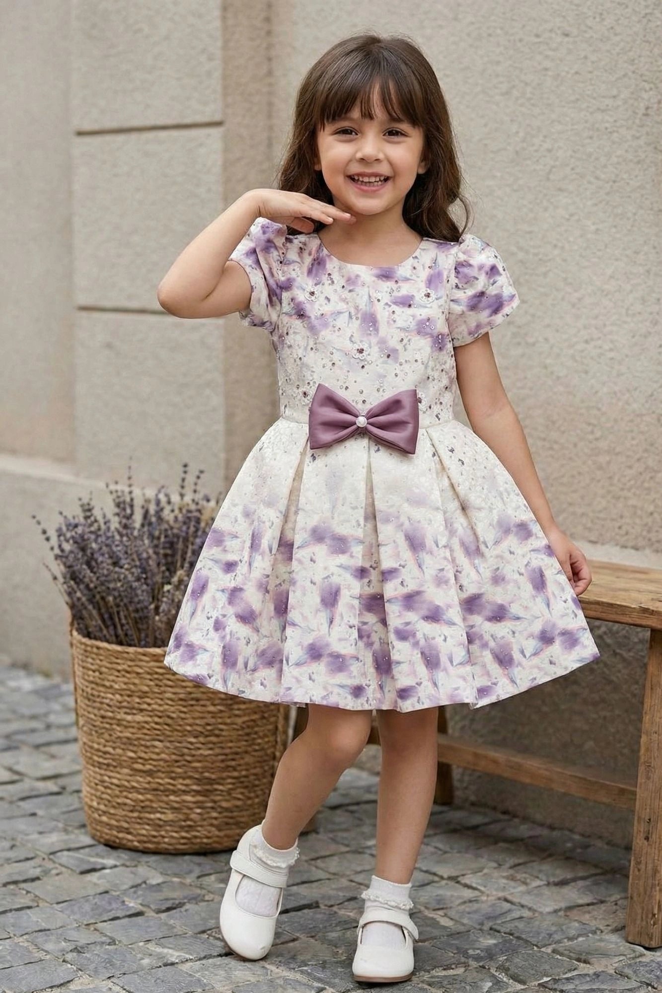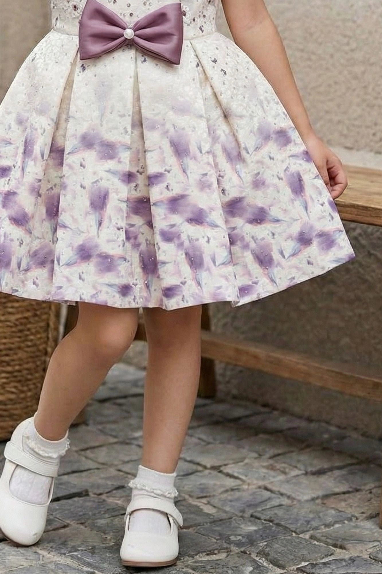 Cream With Lavender Floral Print Party Frock with Satin Bow Waist Accent For Girls