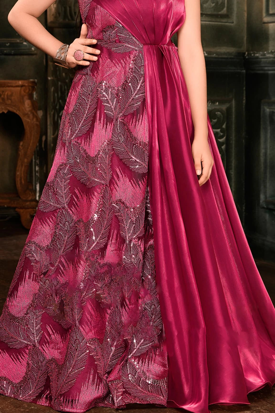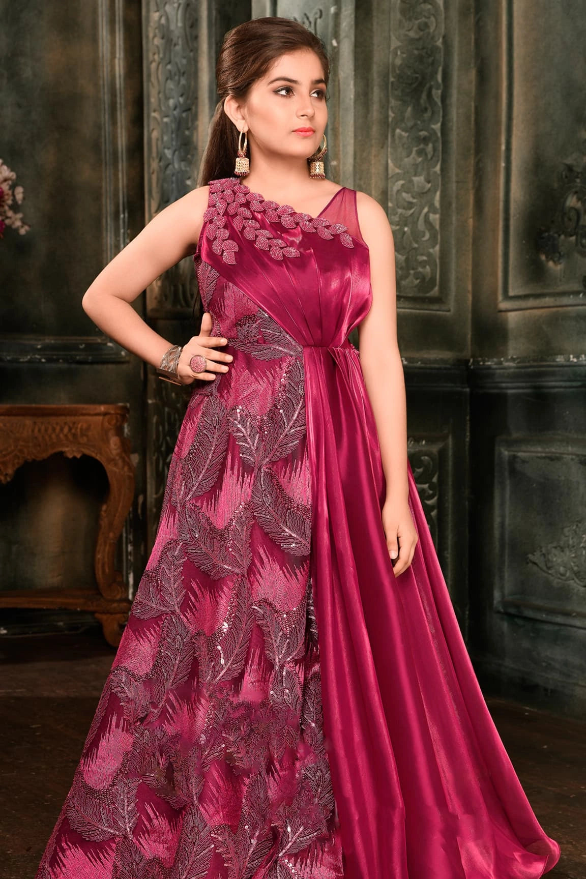 Designer Crimson Red Sequin Embellished Feather Party Gown For Girls