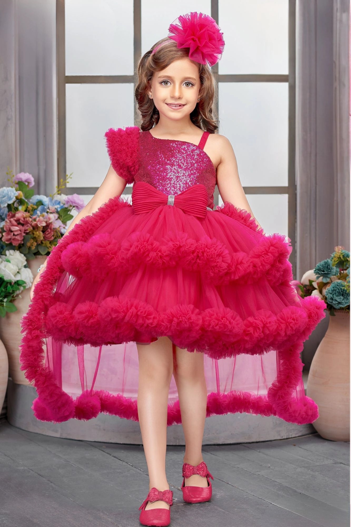 Rani Pink Sequin High-Low Party Dress with Layered Ruffle Hem For Girls