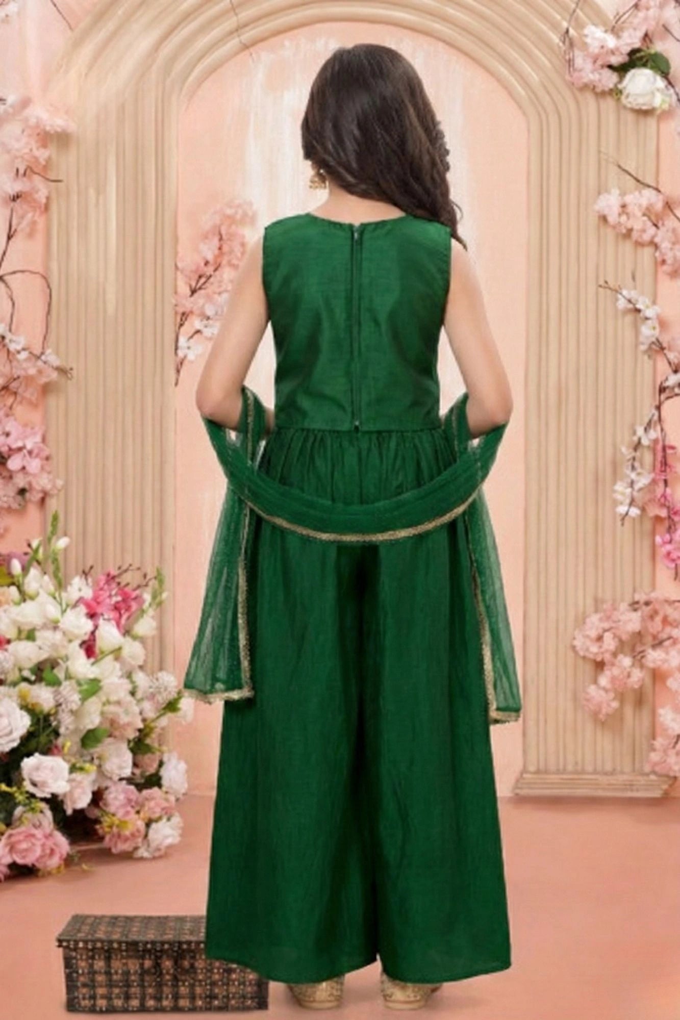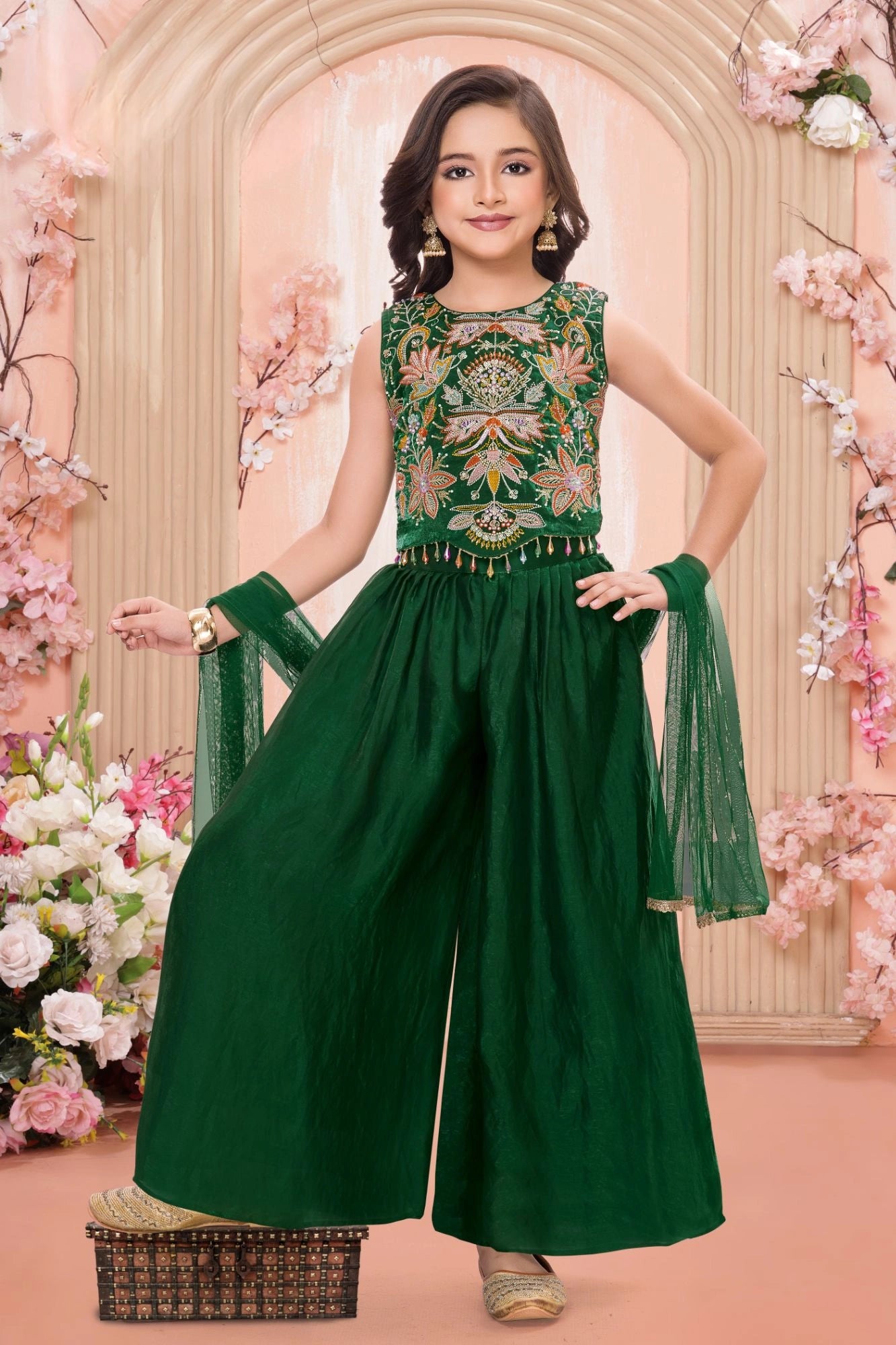 Brown & Gold Peacock Embroidered Palazzo Set with Dupatta For Girls