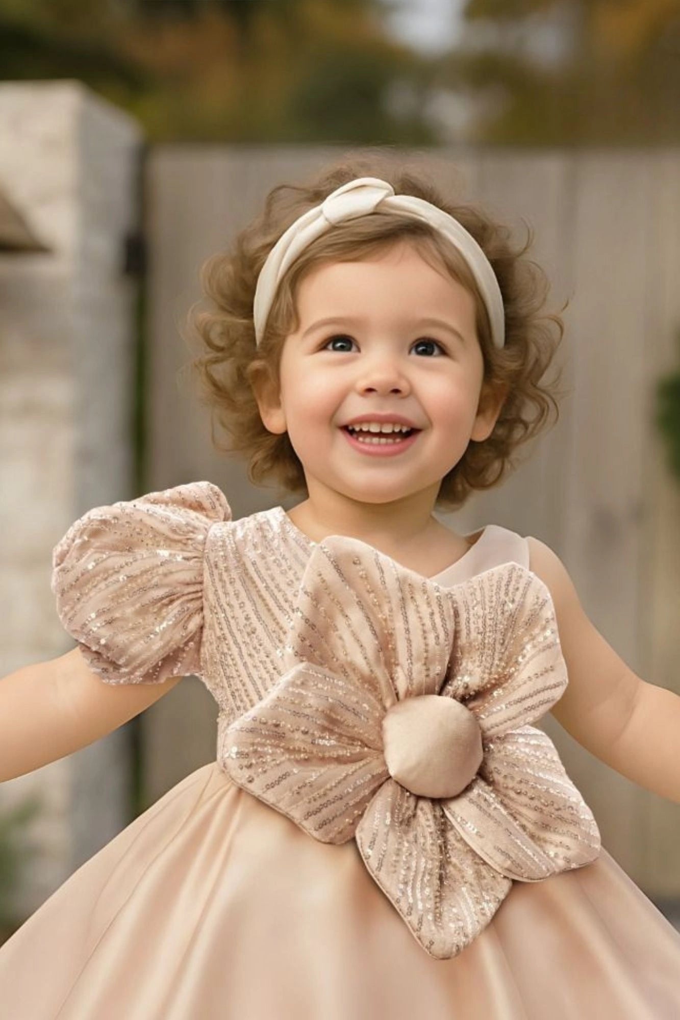 Fawn Party Frock With Sequins And Floral Embellishment For Girls