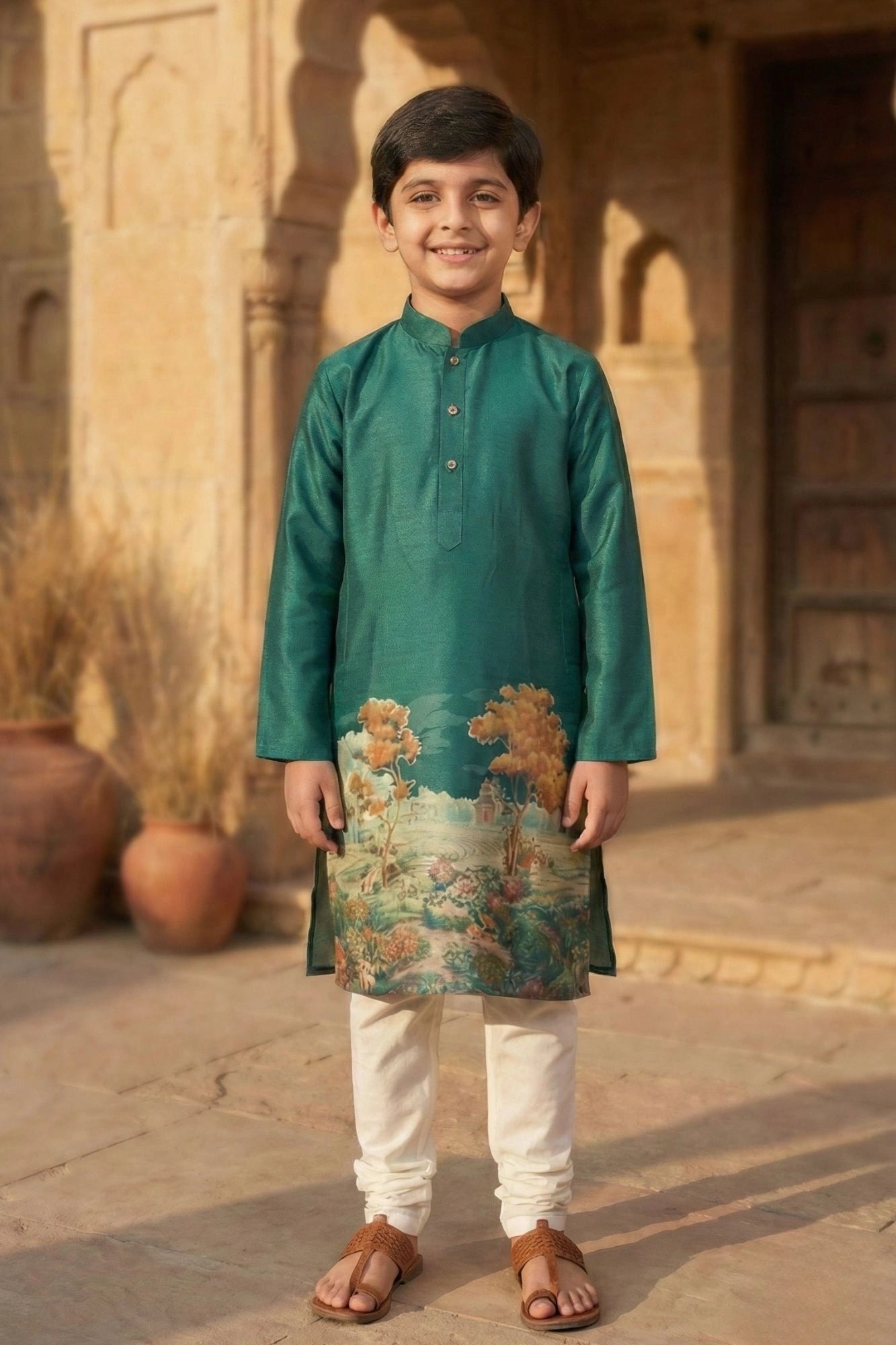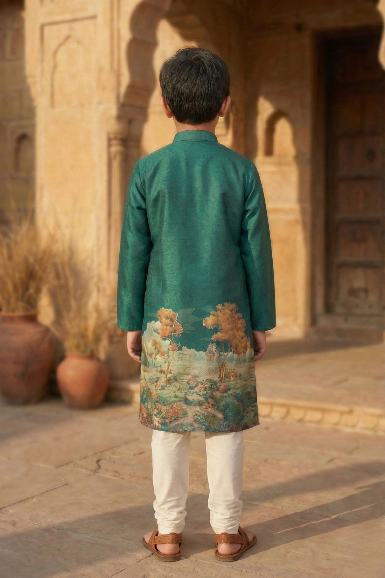 Green Scenic Print Kurta with Cream Pajama Set For Boys