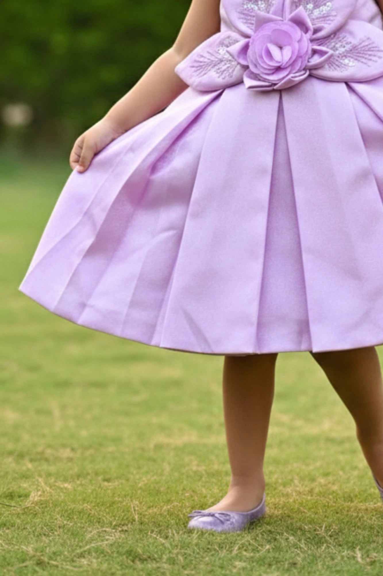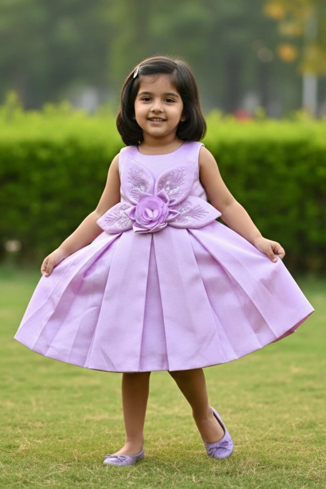 Lavender 3D Floral Appliqué With Embroidery Party Wear Frock For Girls