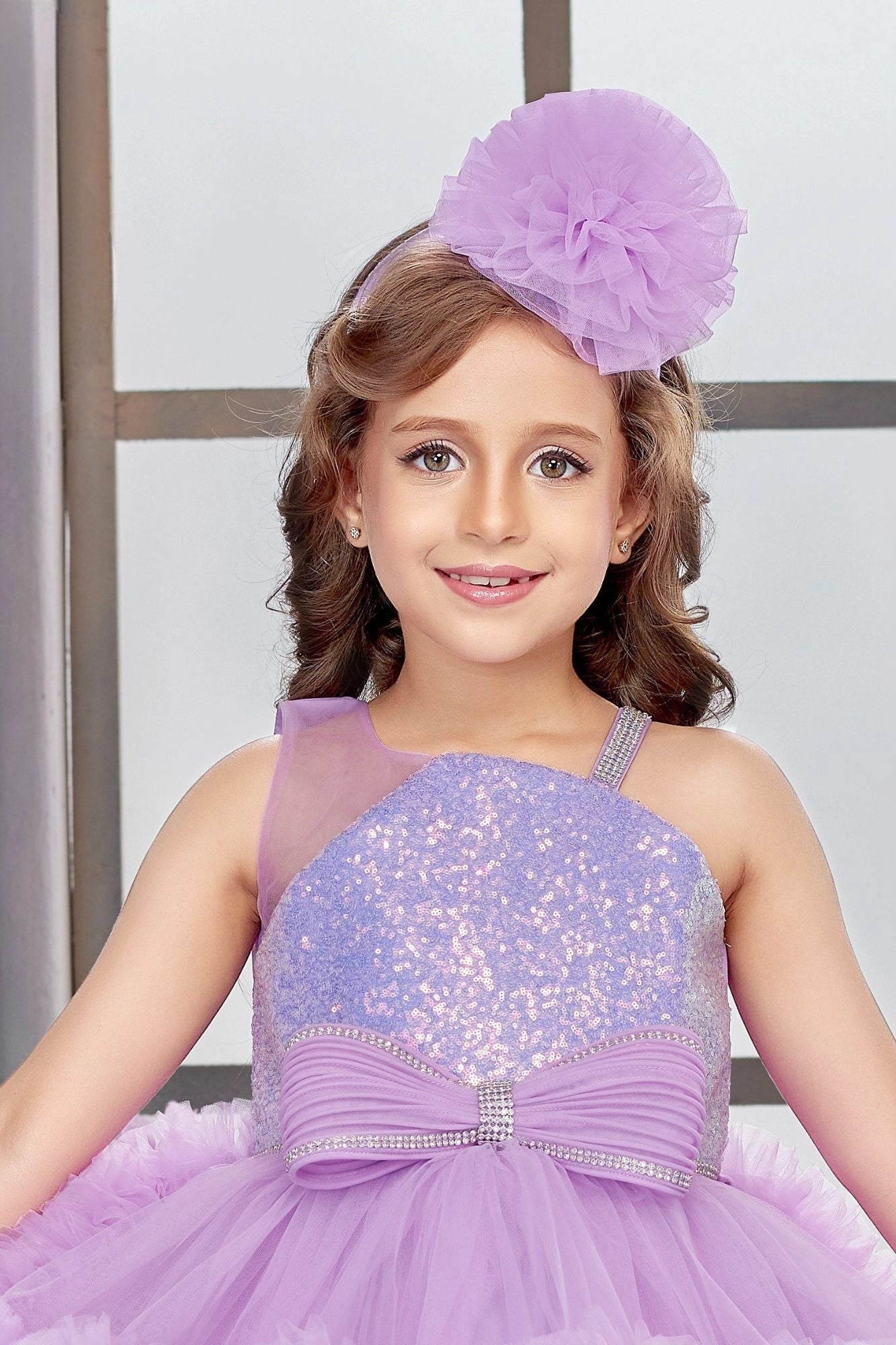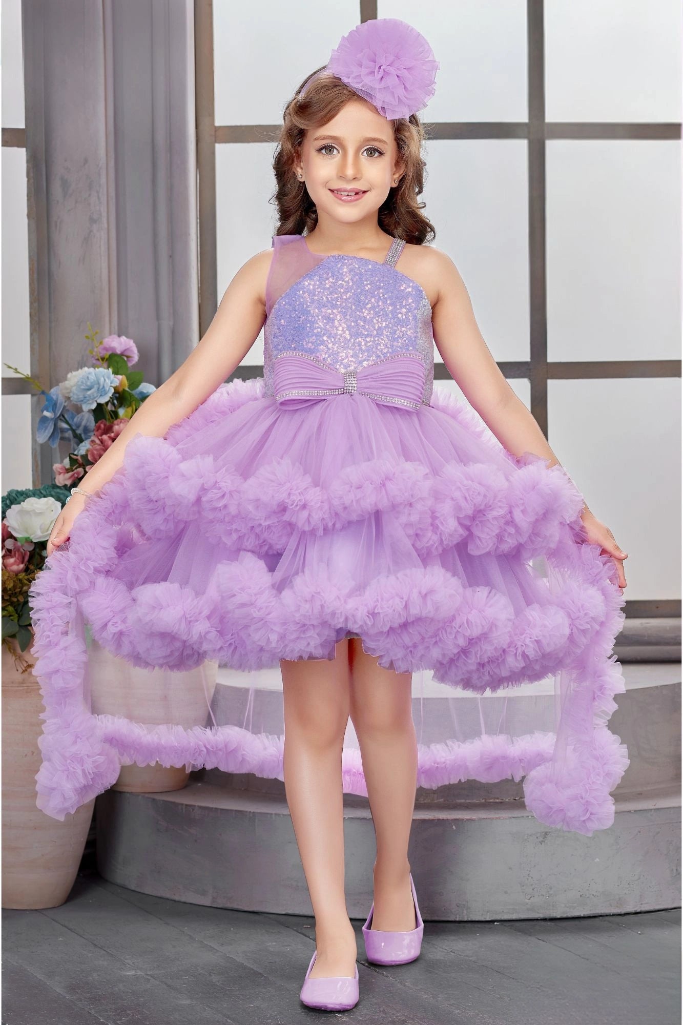 Lavender Sequin Embellished High-Low Party Dress with Ruffle Hem For Girls
