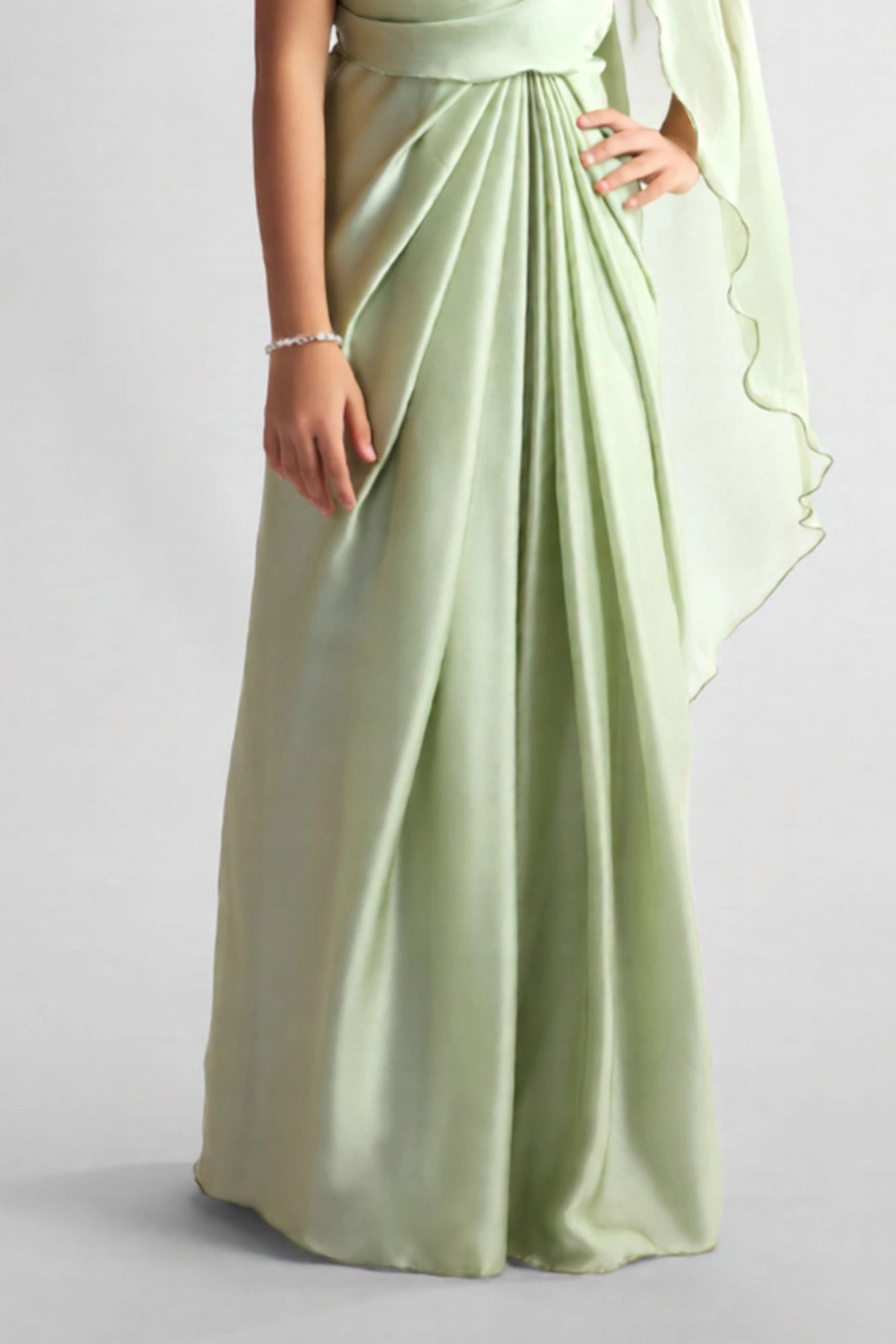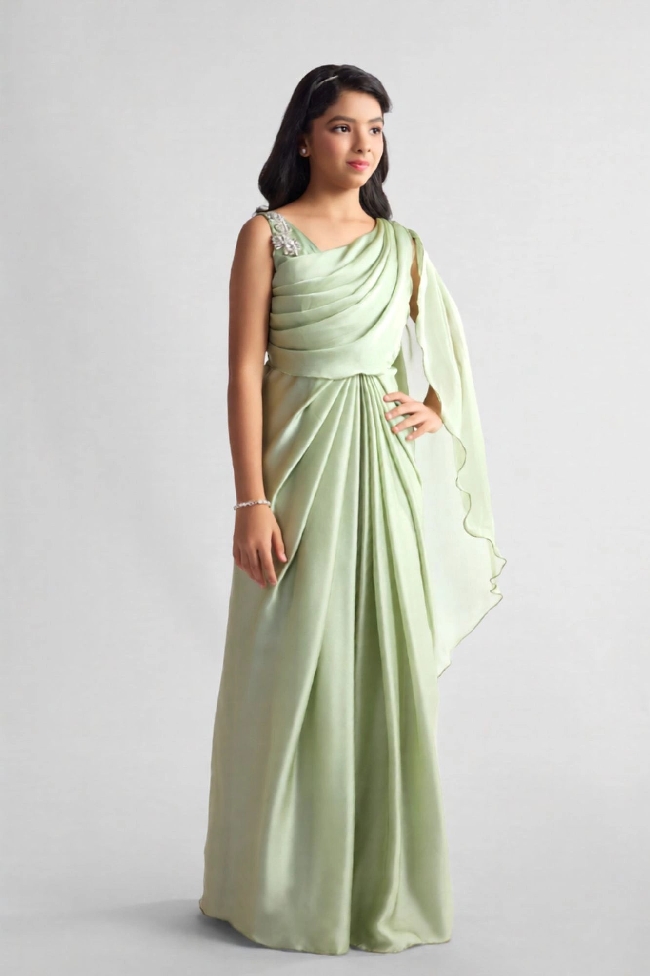 Light Green Pre-Draped Saree Gown with Embellished Strap For Girls