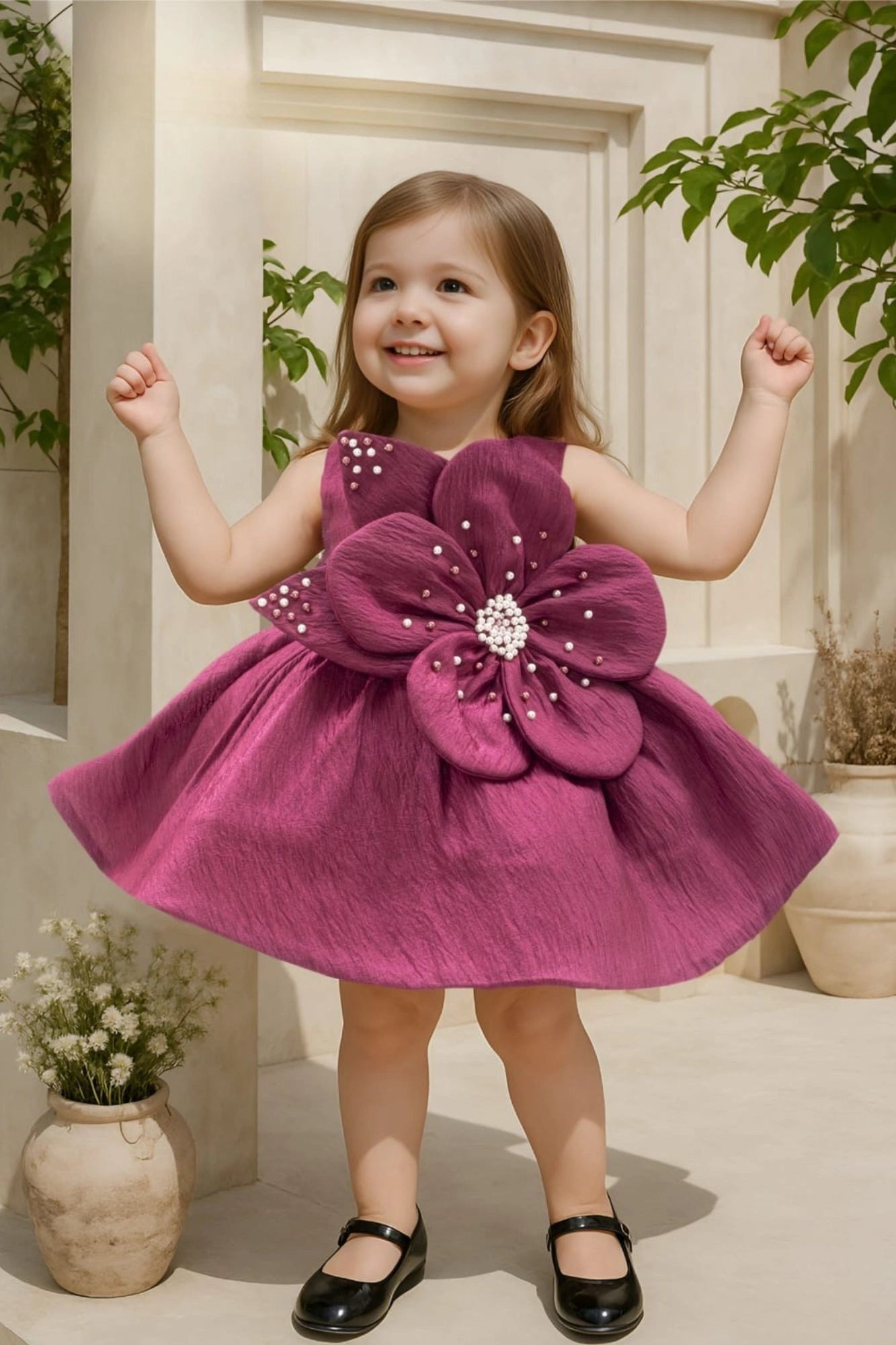Magenta Embellished 3D Floral Appliqué Party Frock For Girls
