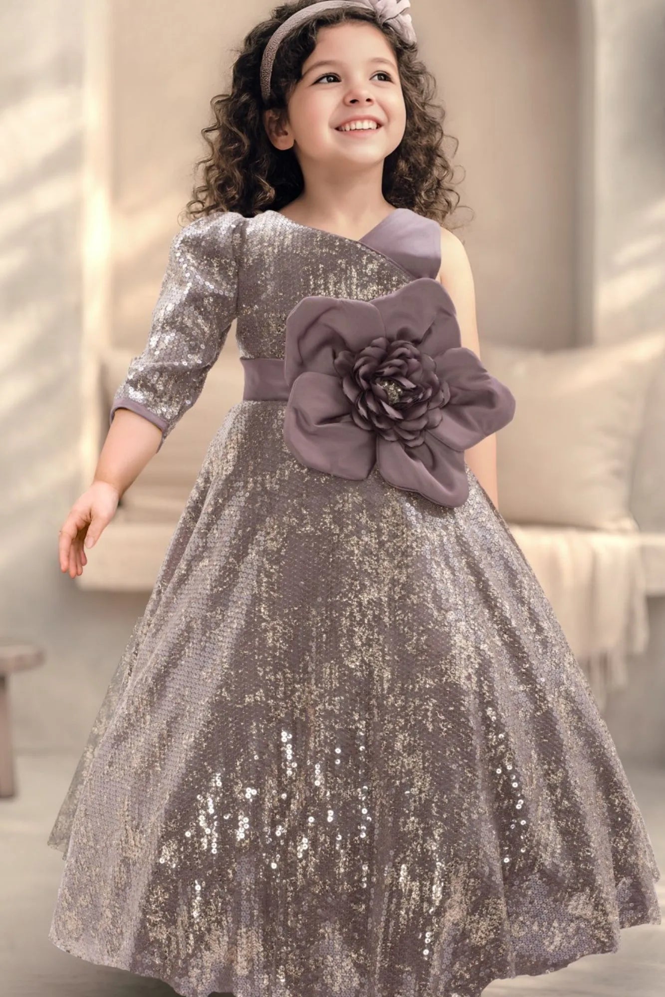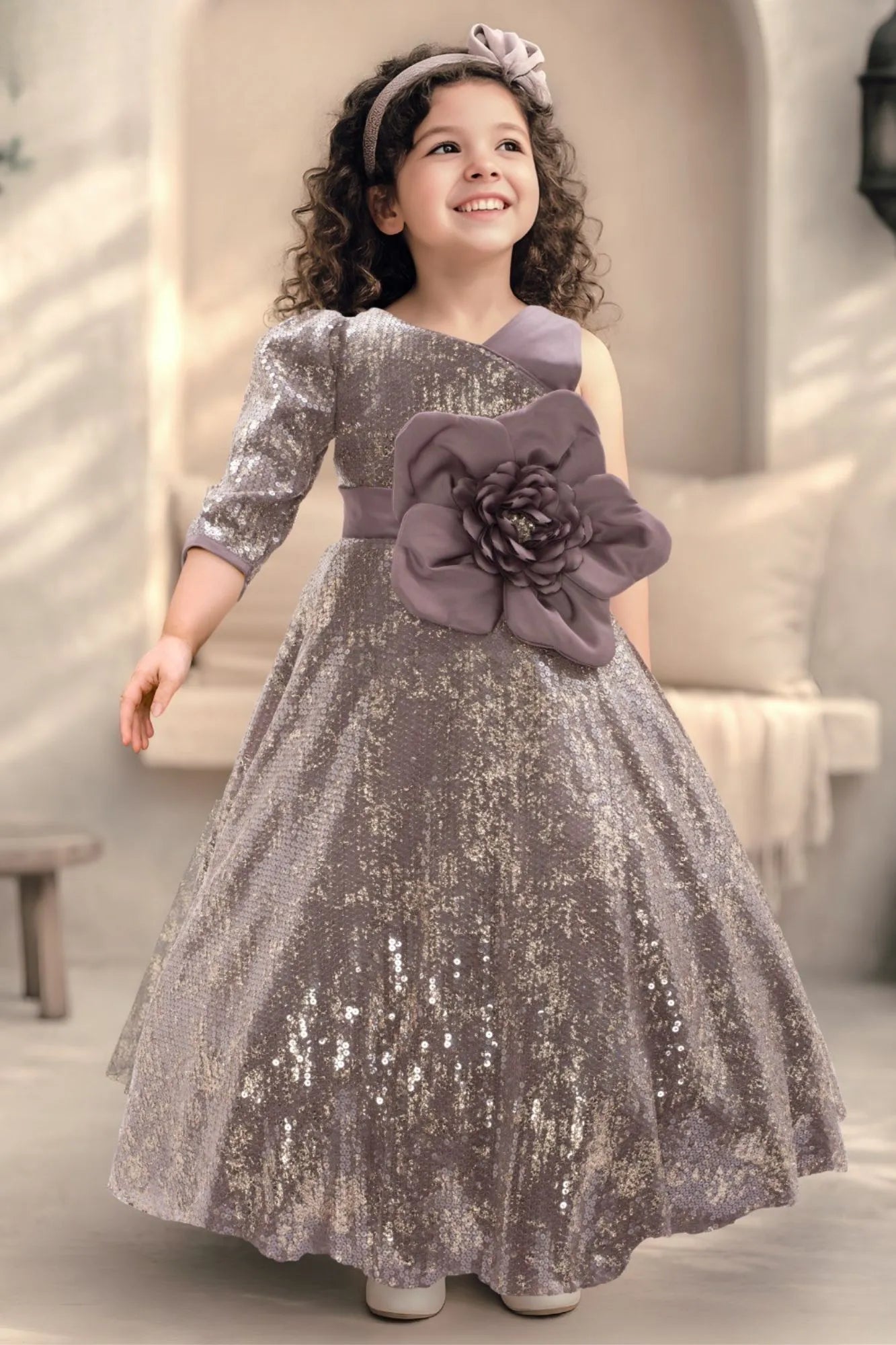 Mauve Sequin Party Frock with Oversized Floral Bow For Girls