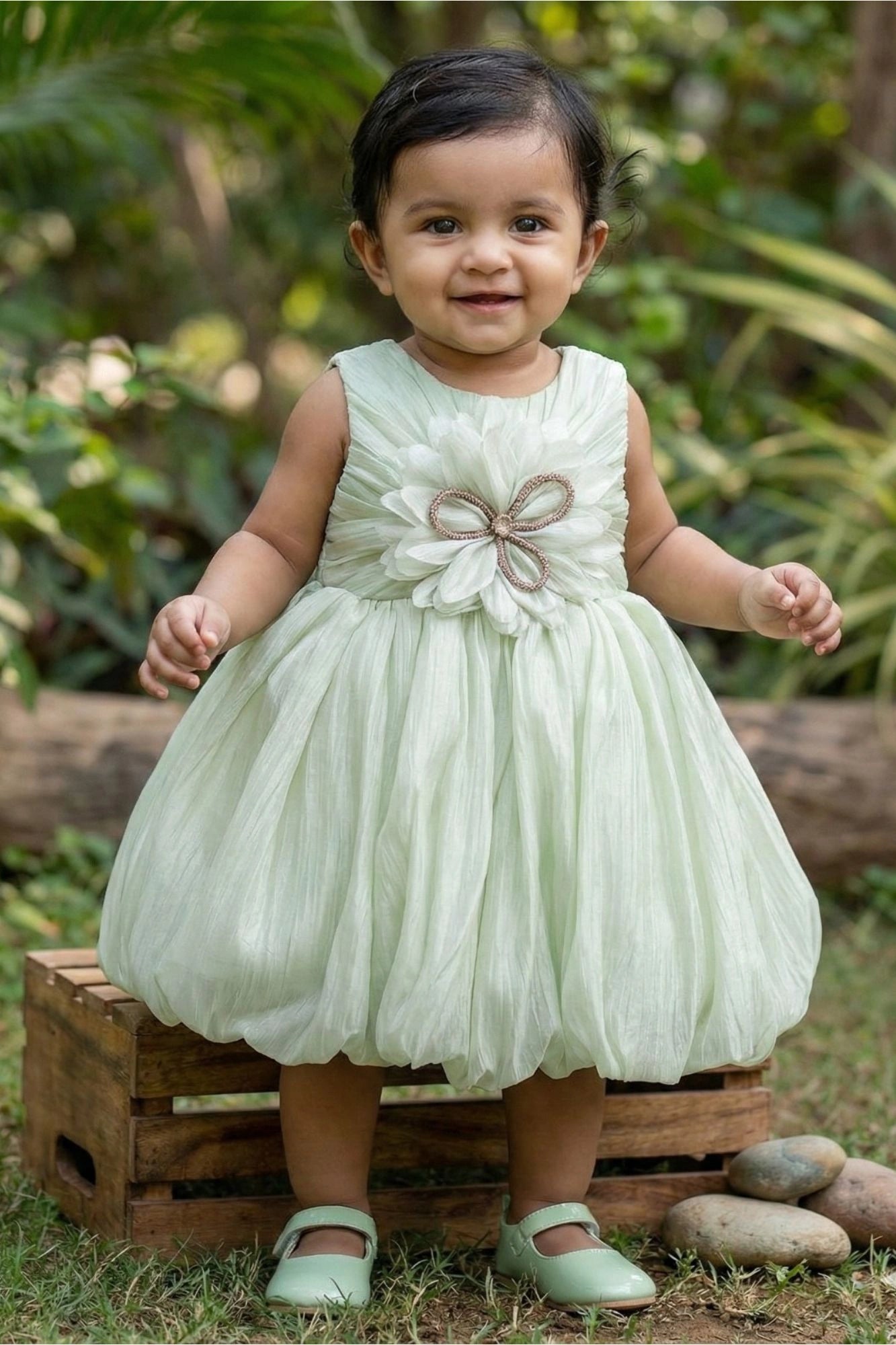 Mint Green Party Frock with Oversized Floral Appliqué and Pleated Shine Finish For Girls