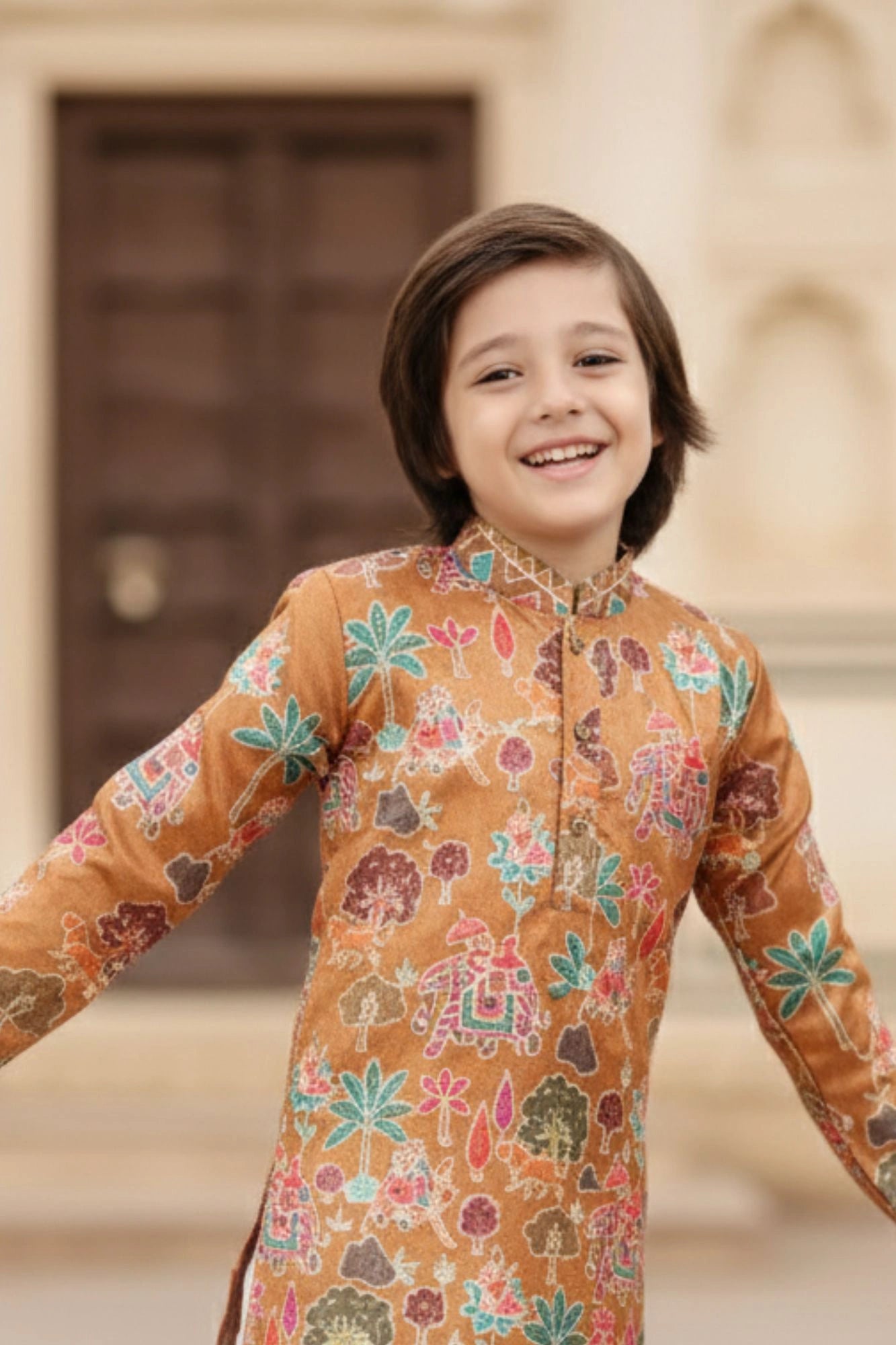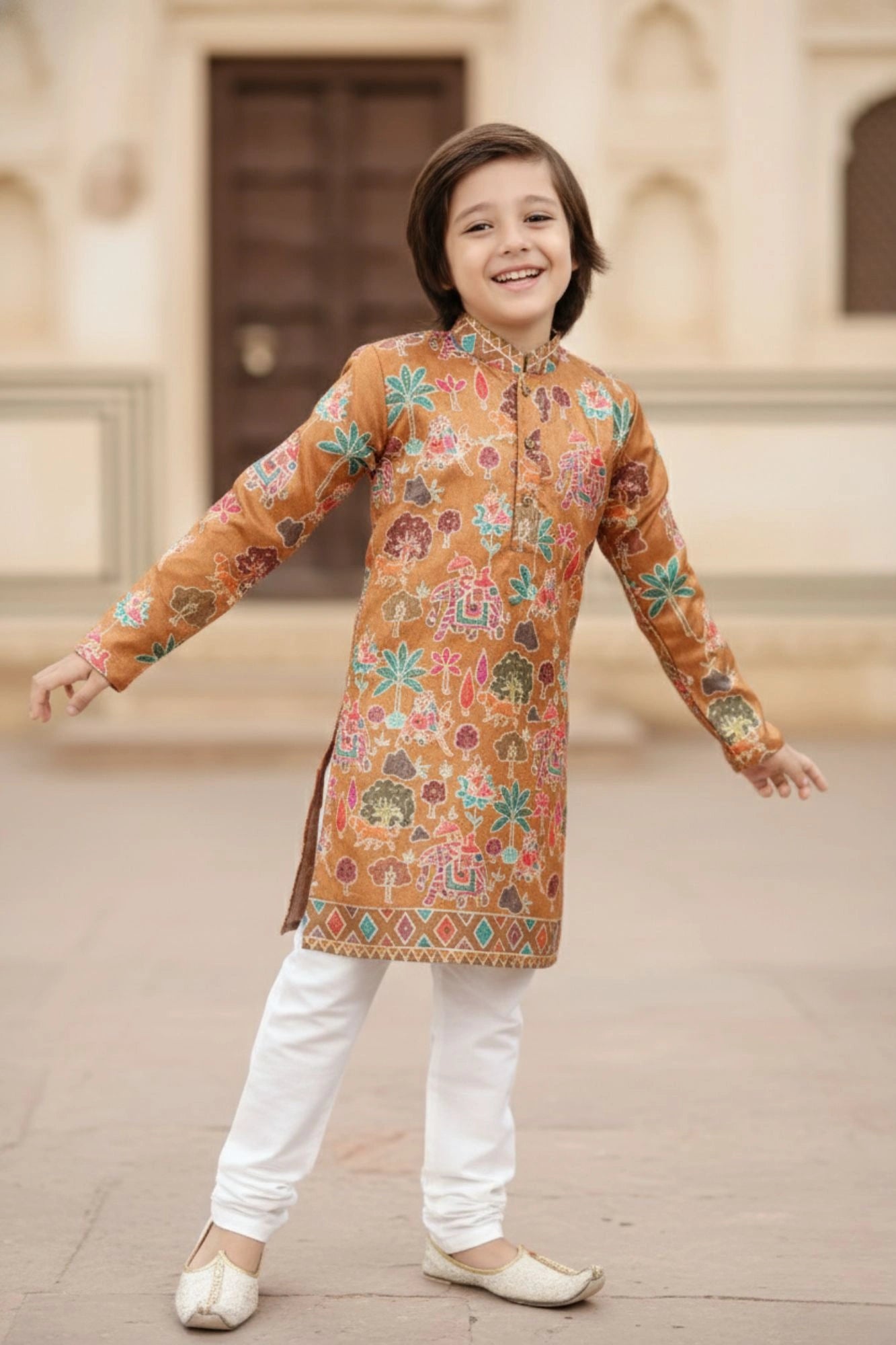 Mustard Printed Ethnic Kurta with White Pyjama Set For Boys