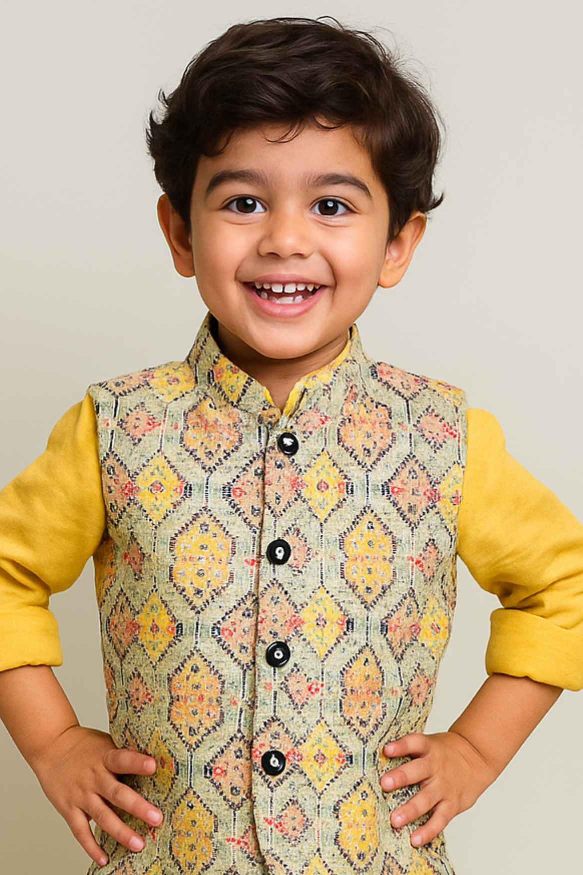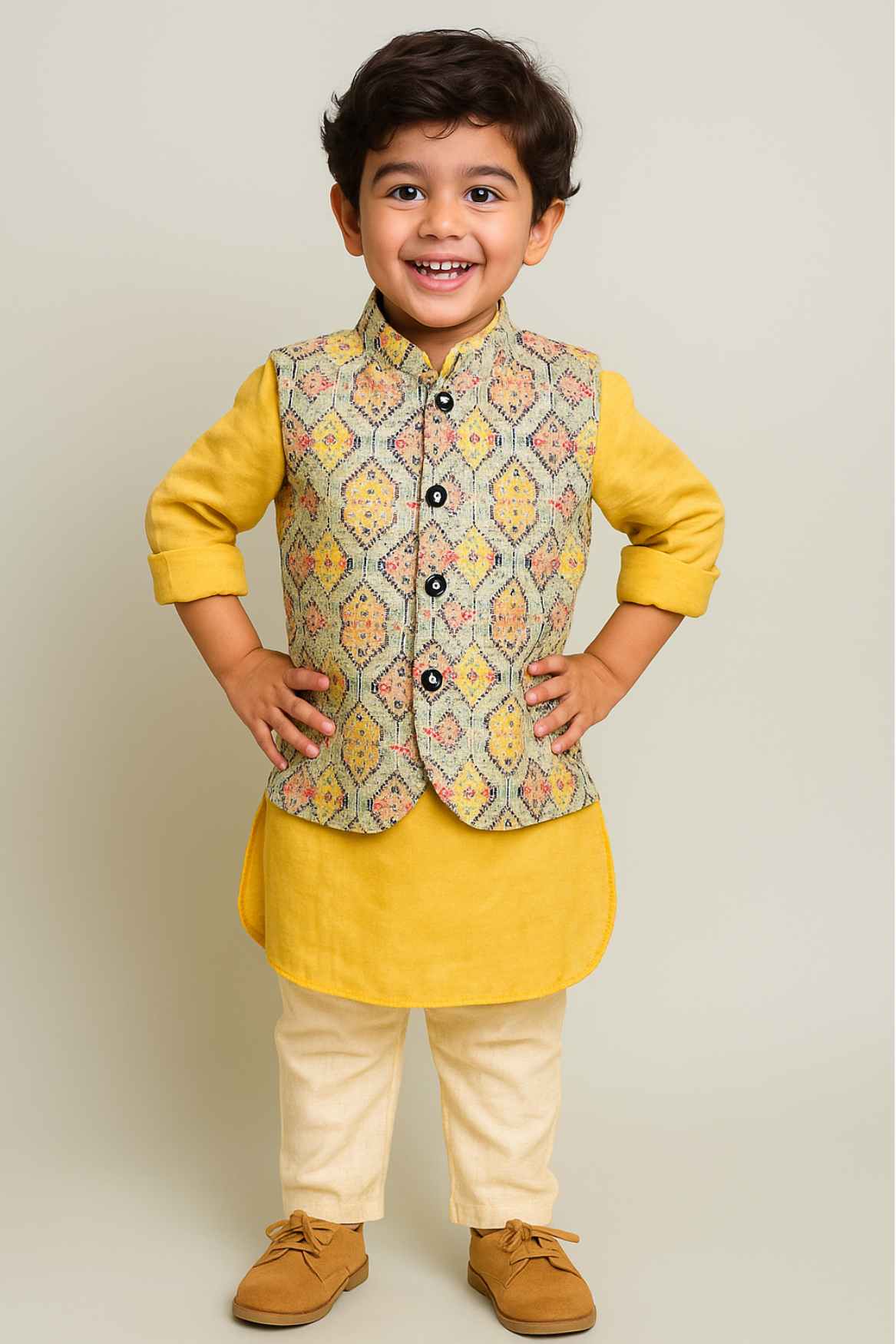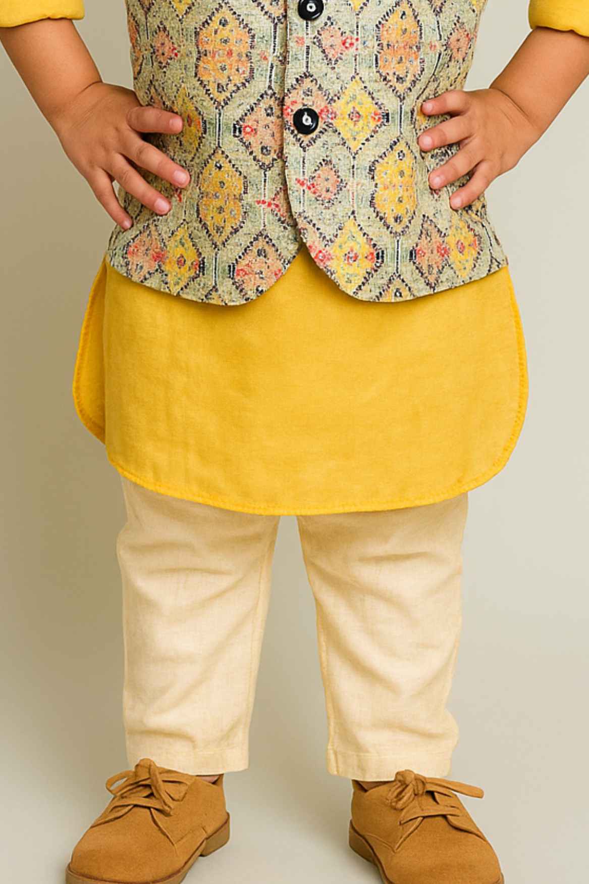 Mustard Yellow Kurta Pyjama Set With Printed Waist Coat For Boys