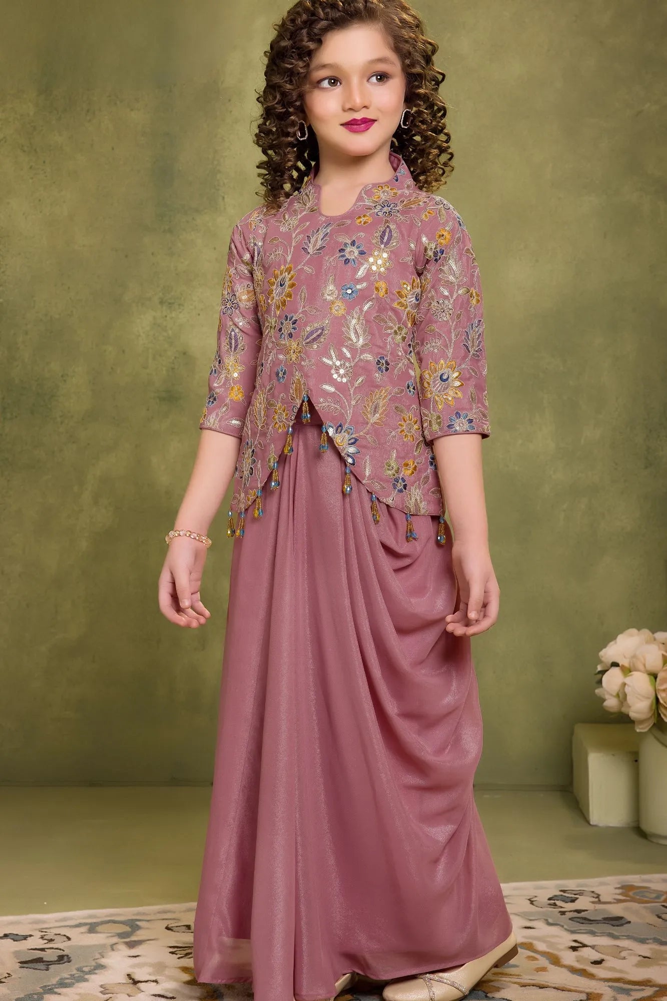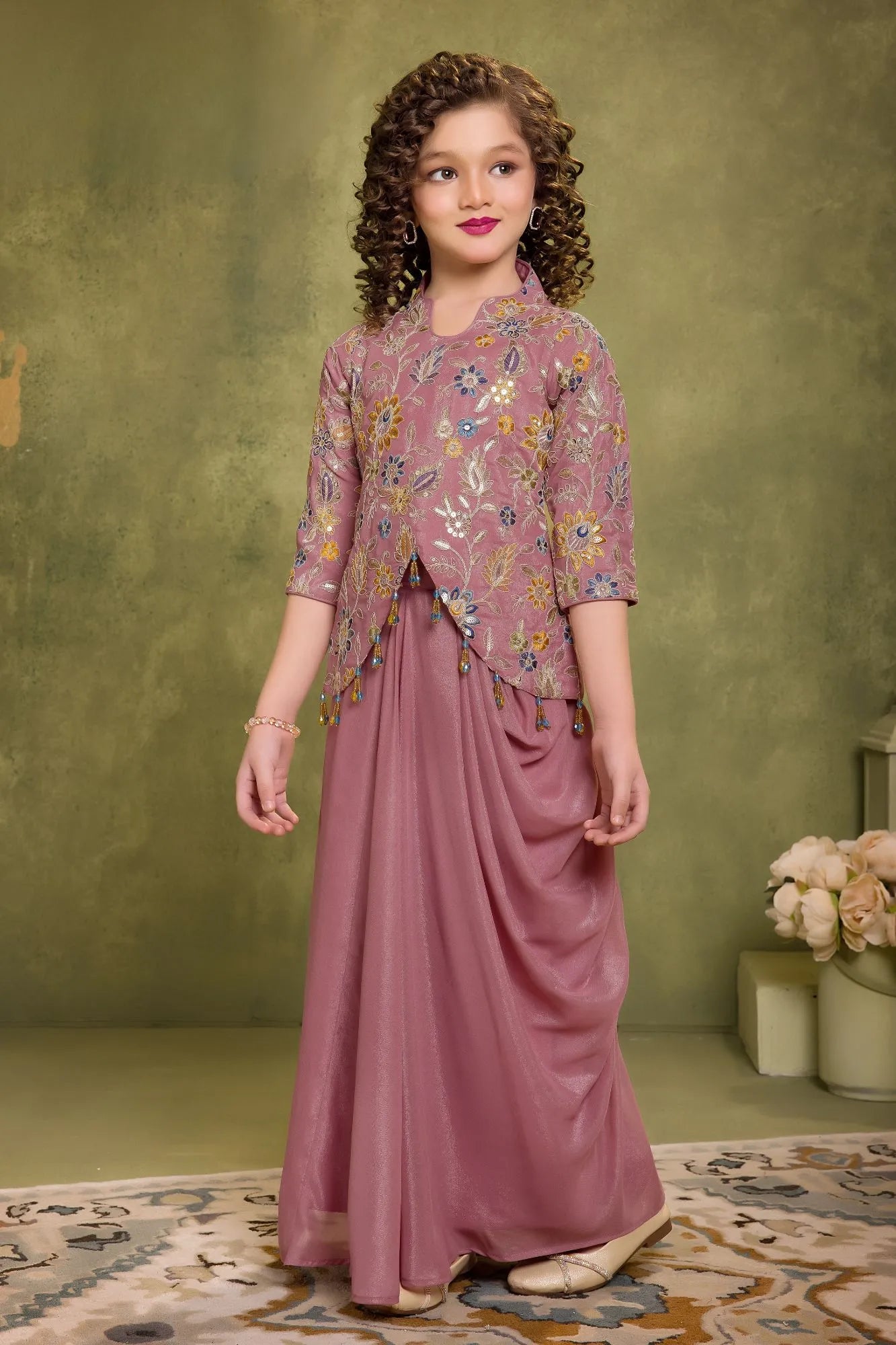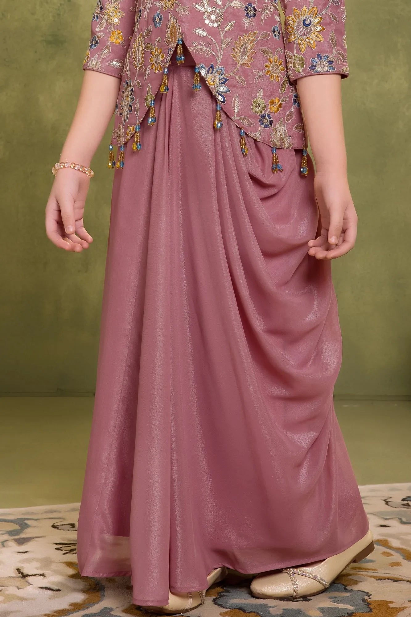 Onion Pink Draped Indo-Western Dhoti Set with Floral Embroidered Top For Girls