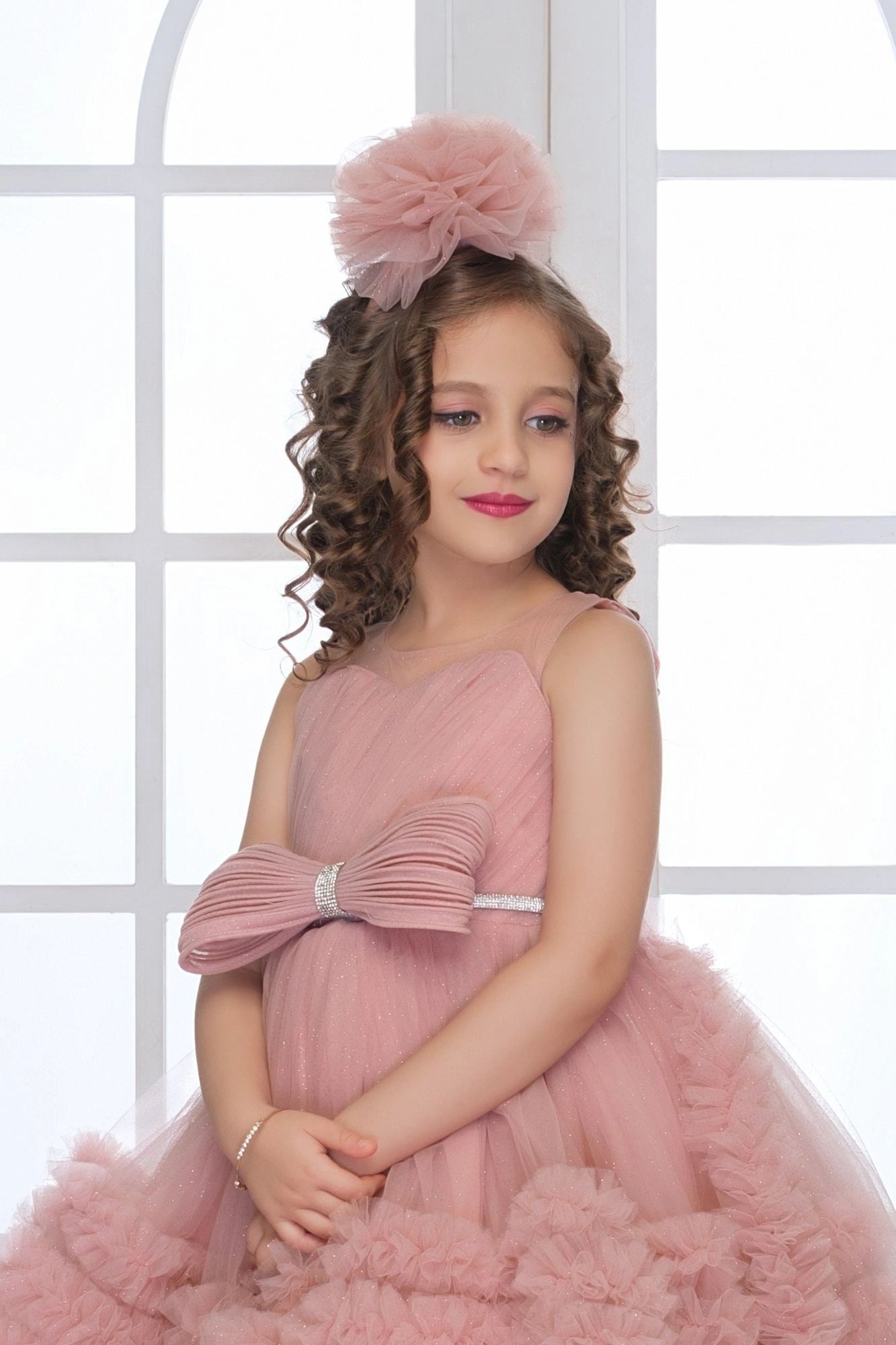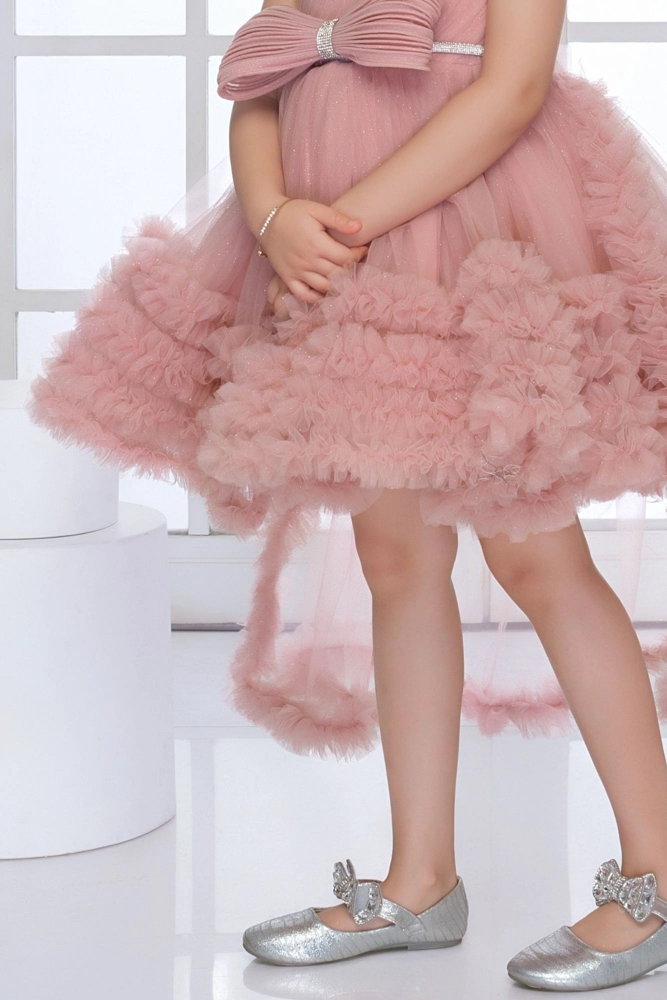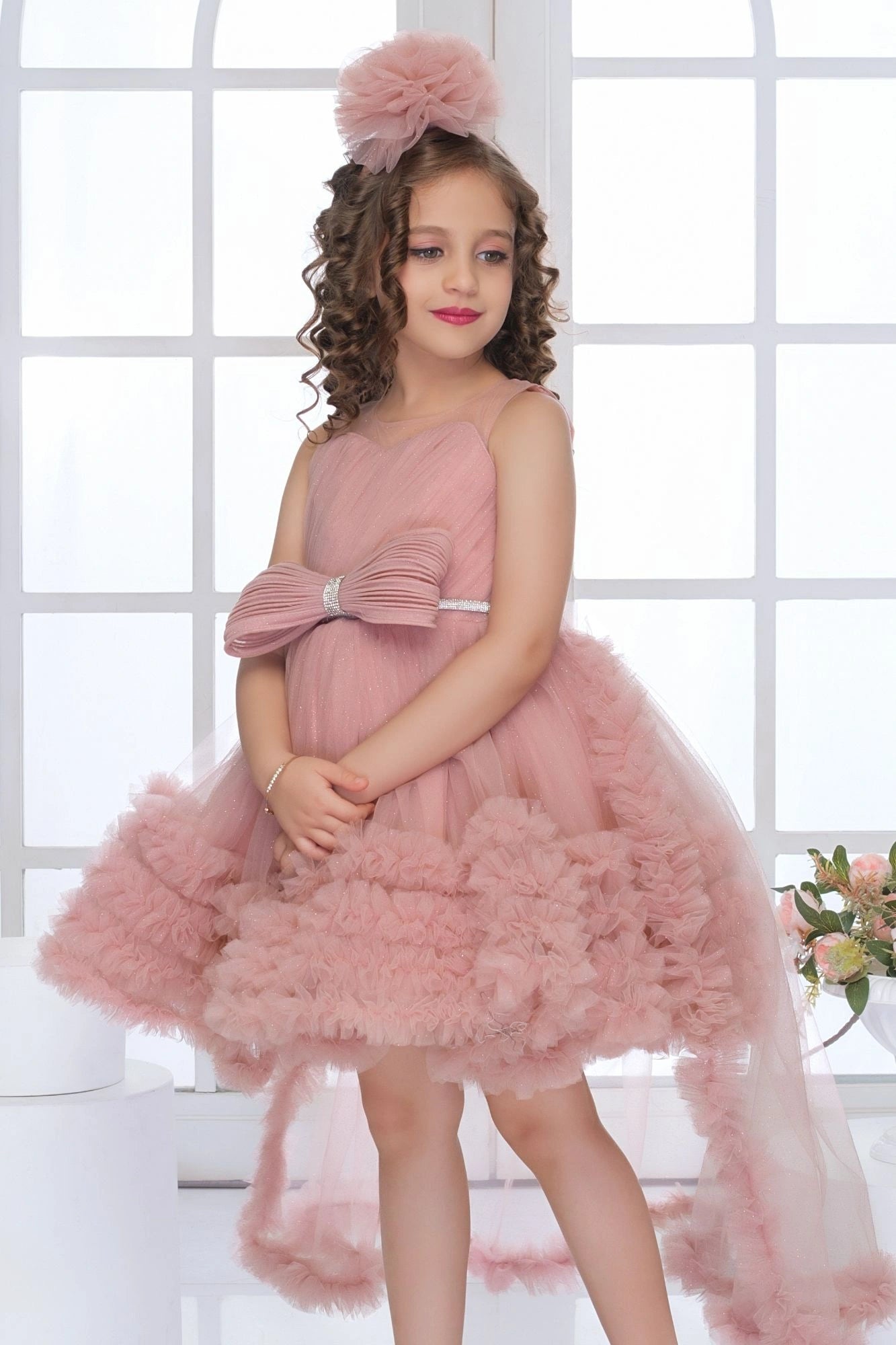 Onion Pink High-Low Tulle Party Frock with Oversized Bow For Girls