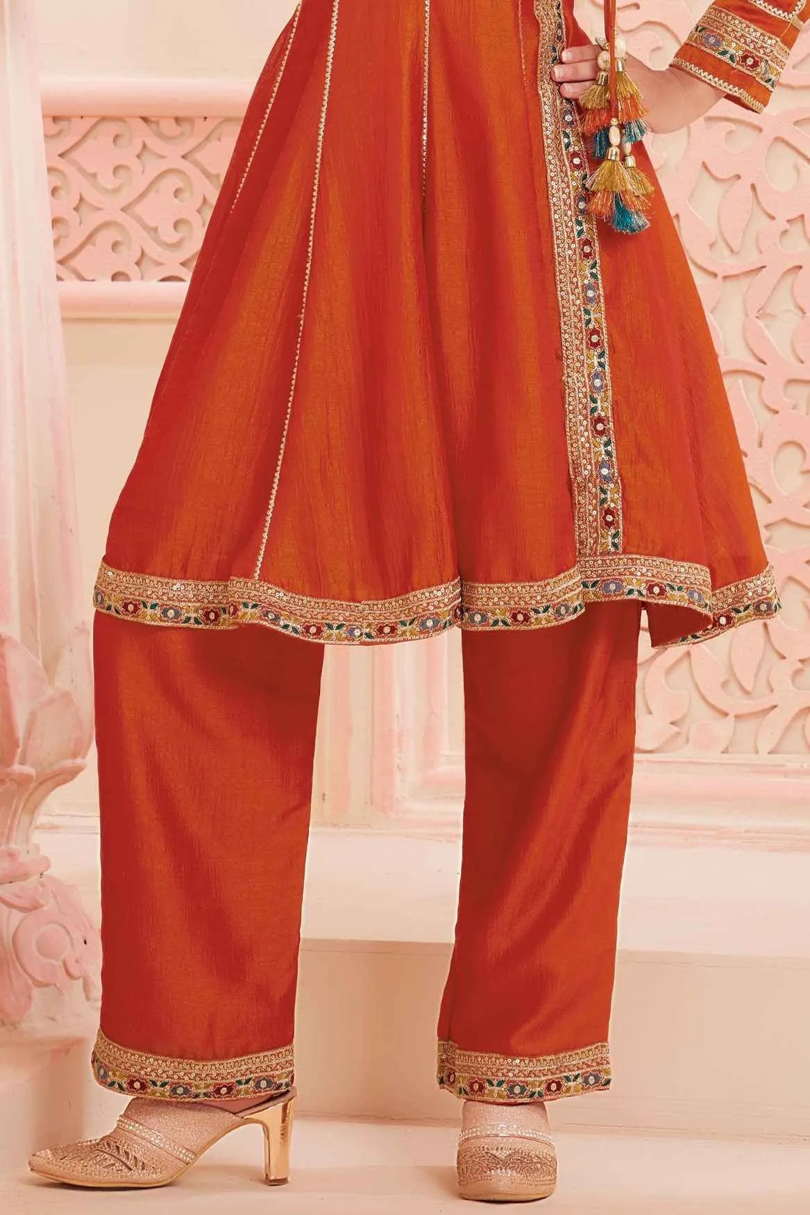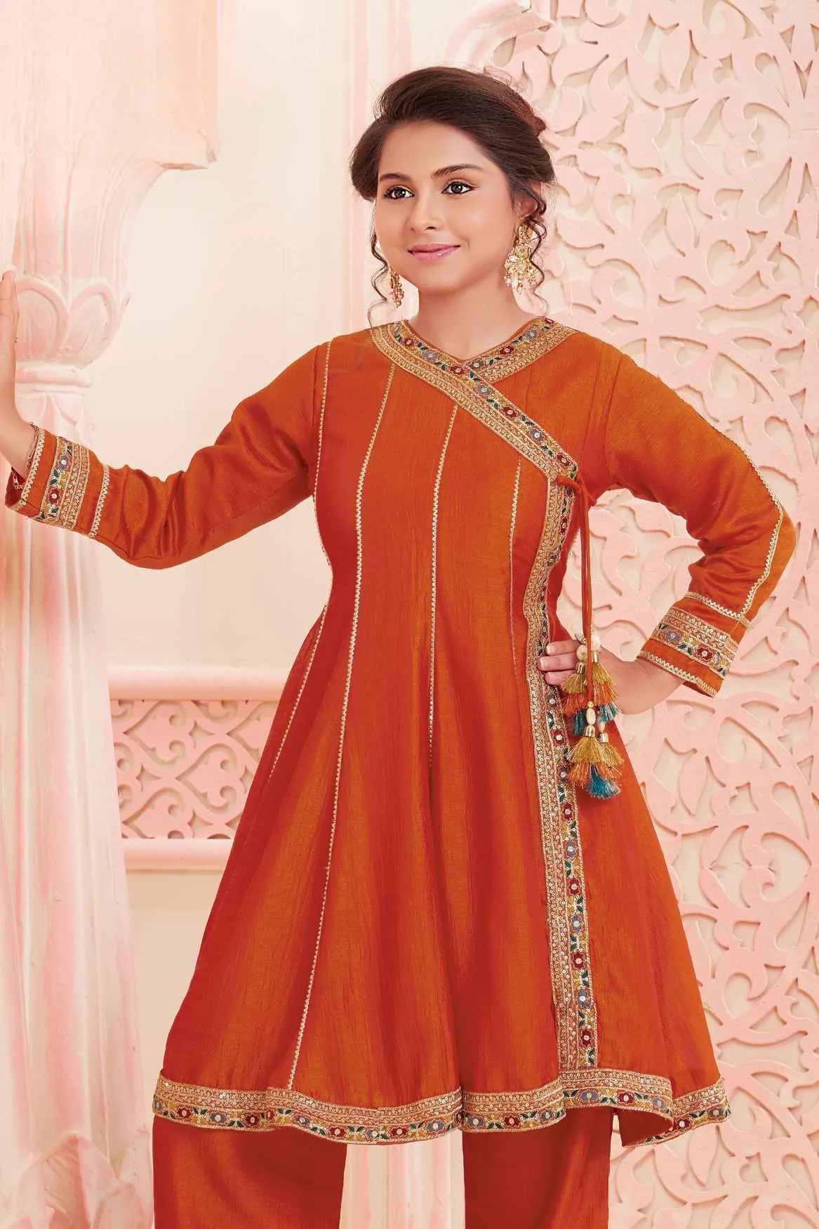Orange Angrakha Kurti & Straight Pant Set For Girls