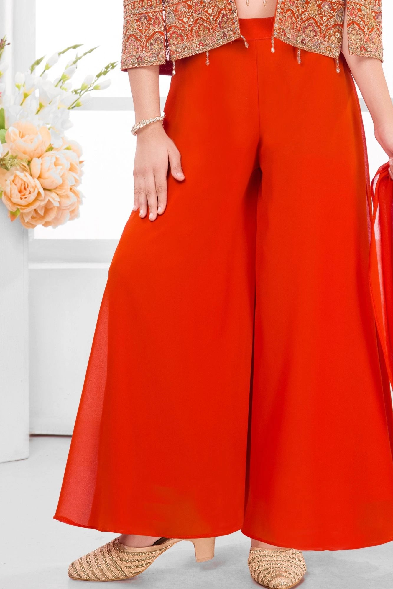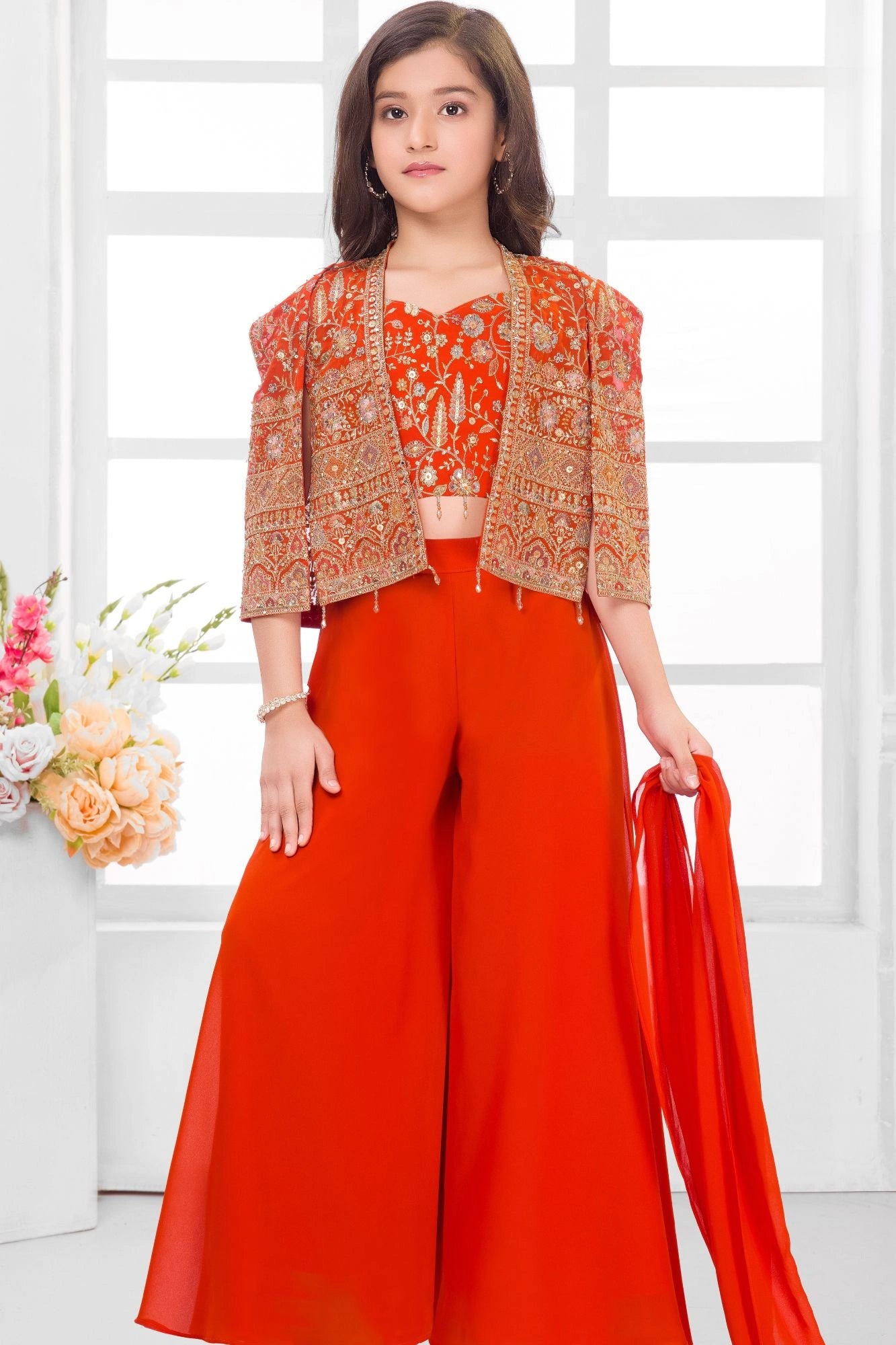 Orange Embroidered Crop Top with Jacket and Palazzo Set For Girls