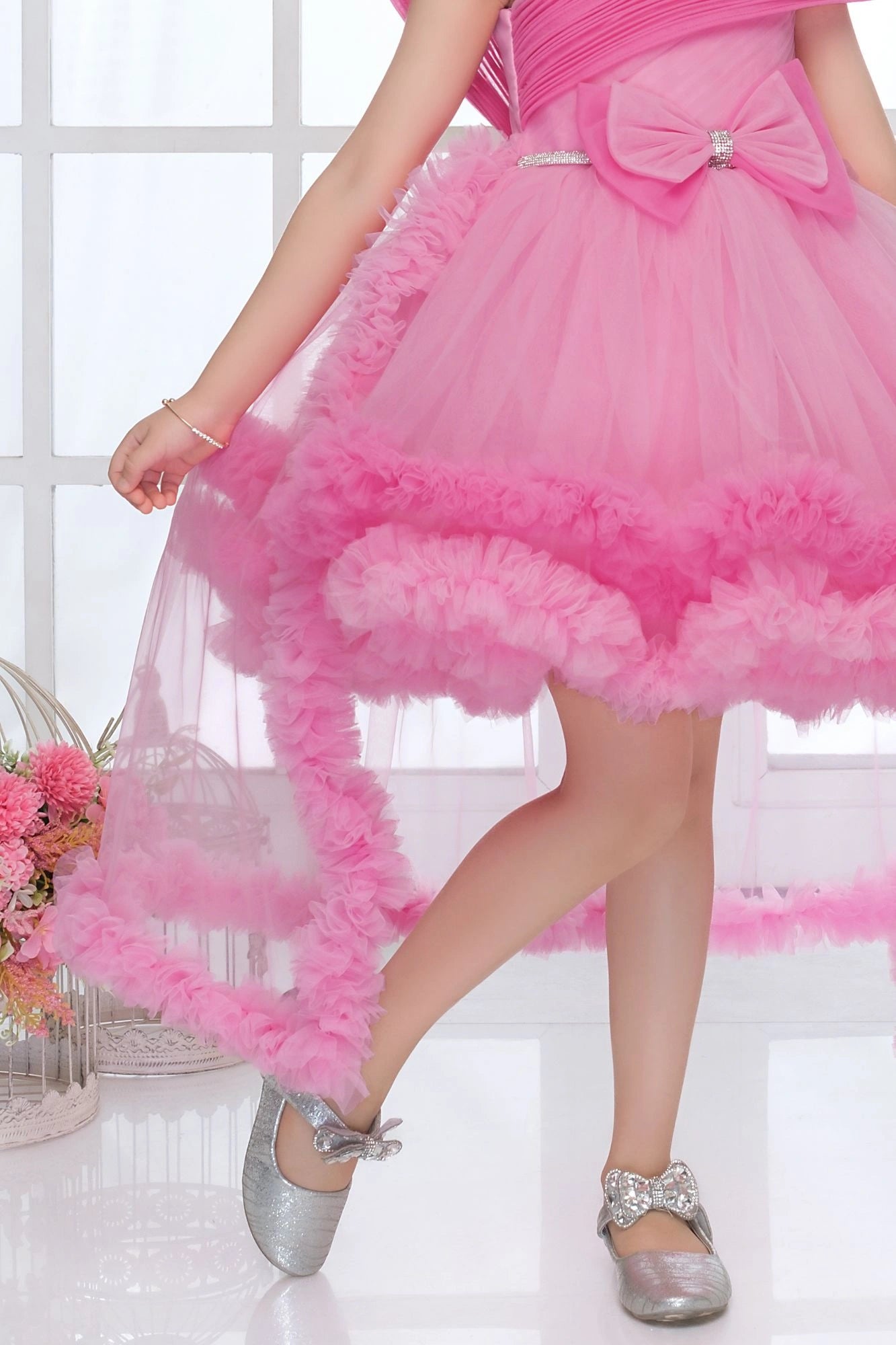 Pink Layered High-Low Tulle Party Frock with Shoulder Pleats For Girls