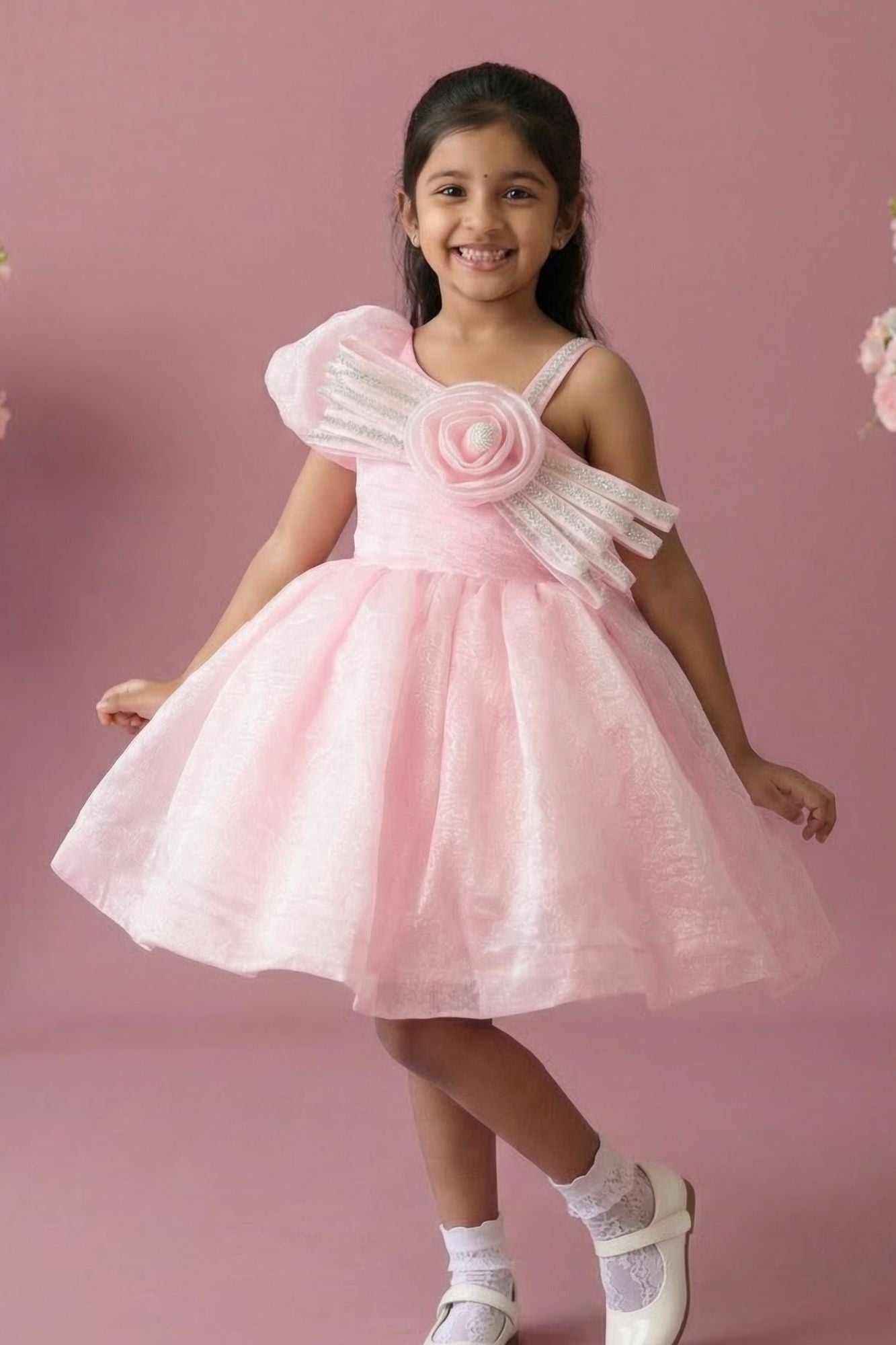 Pink One-Shoulder Party Frock with 3D Floral Bow For Girls