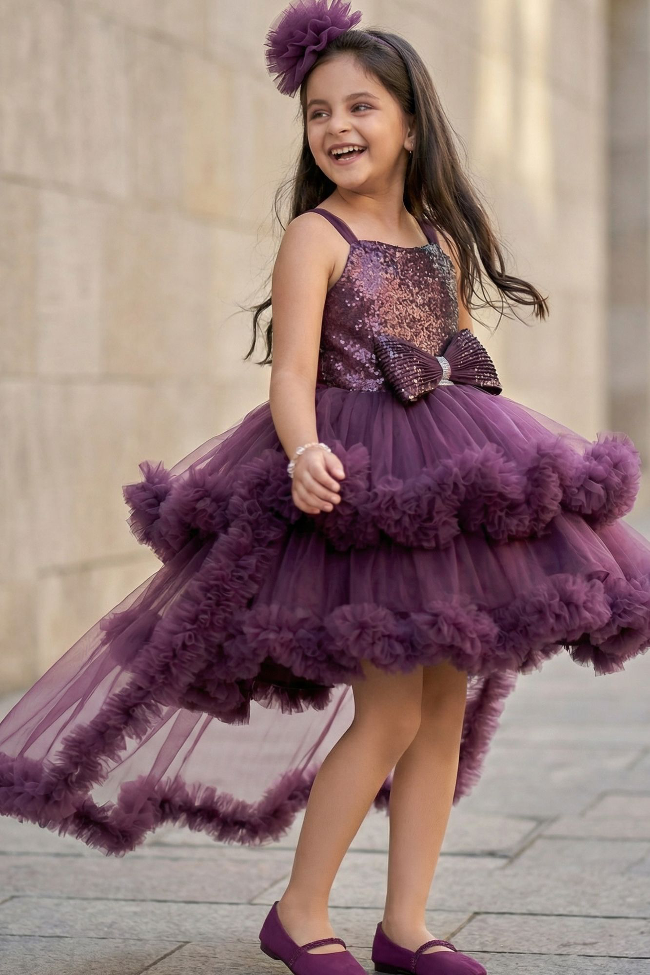 Plum Purple High-Low Party Wear Tulle Frock With Floral Embellishment For Girls