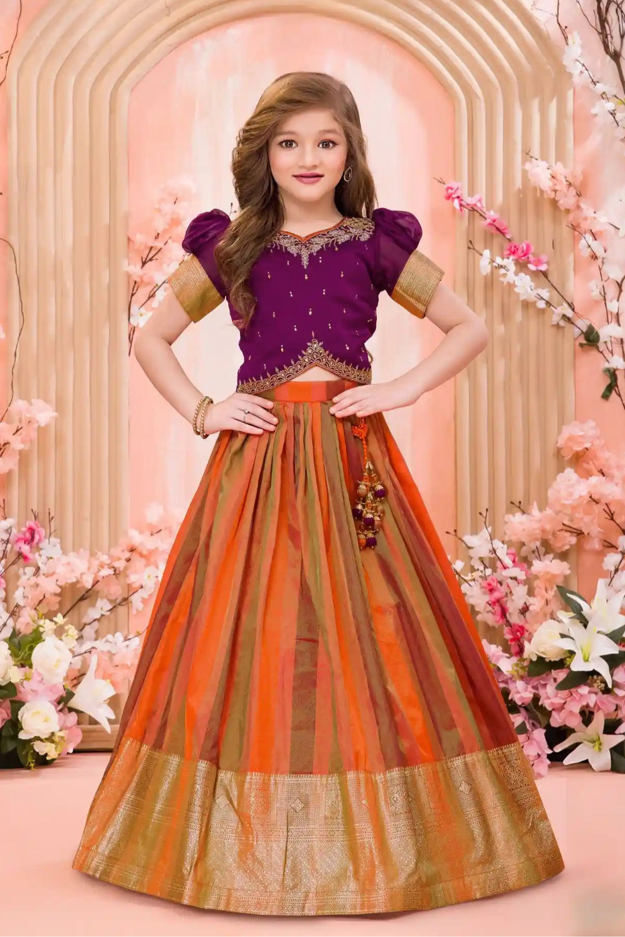 Purple And Rust Silk Pattu Pavadai with Puff Sleeves For Girls