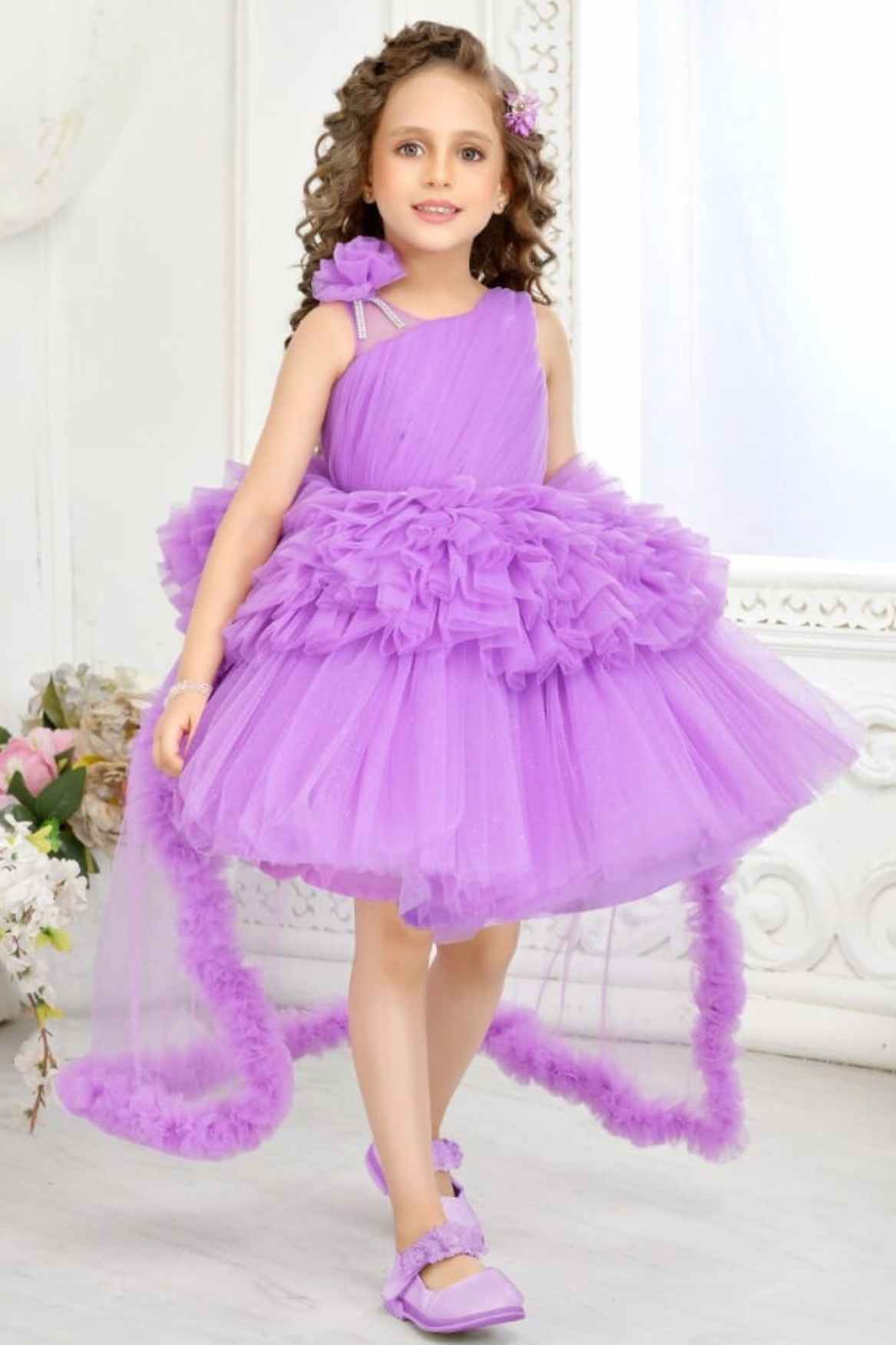 Lavender Floral Embellished Party Wear Frock With Sequin Detailing For Girls