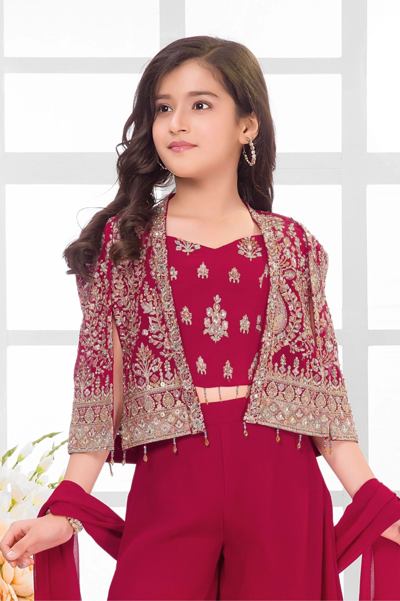 Rani Pink Embroidered Crop Top with Jacket and Palazzo Set For Girls