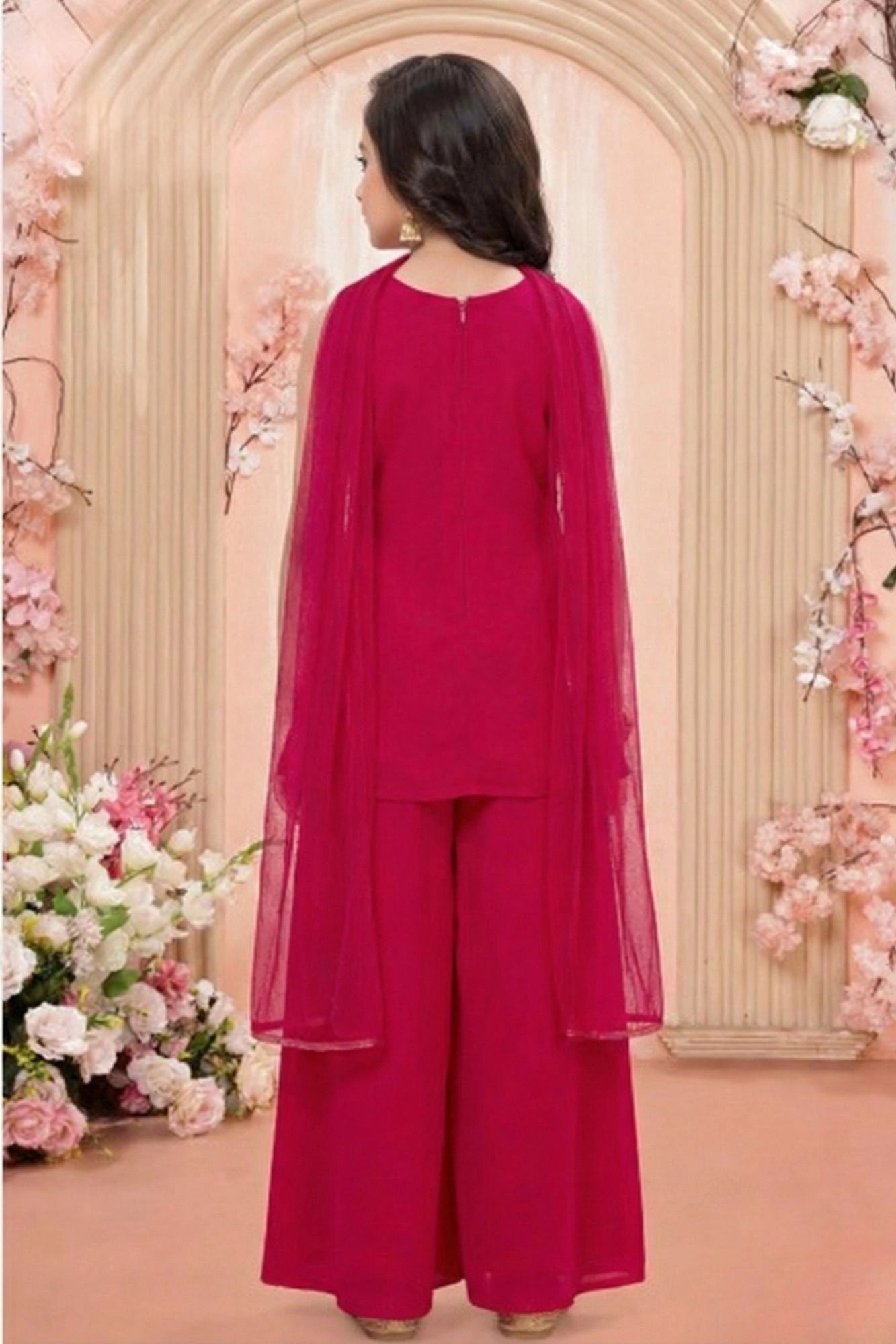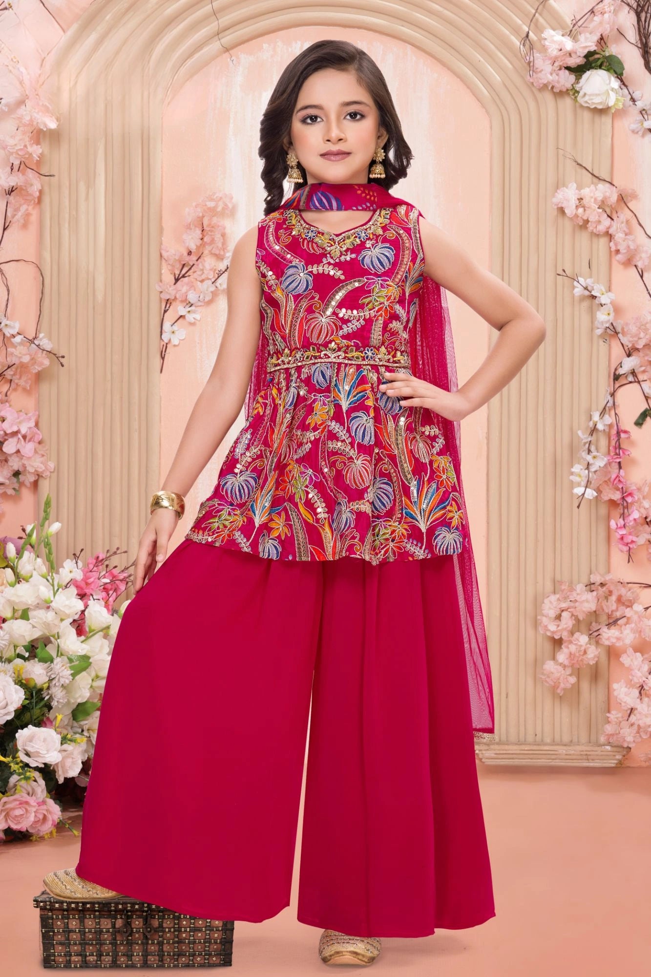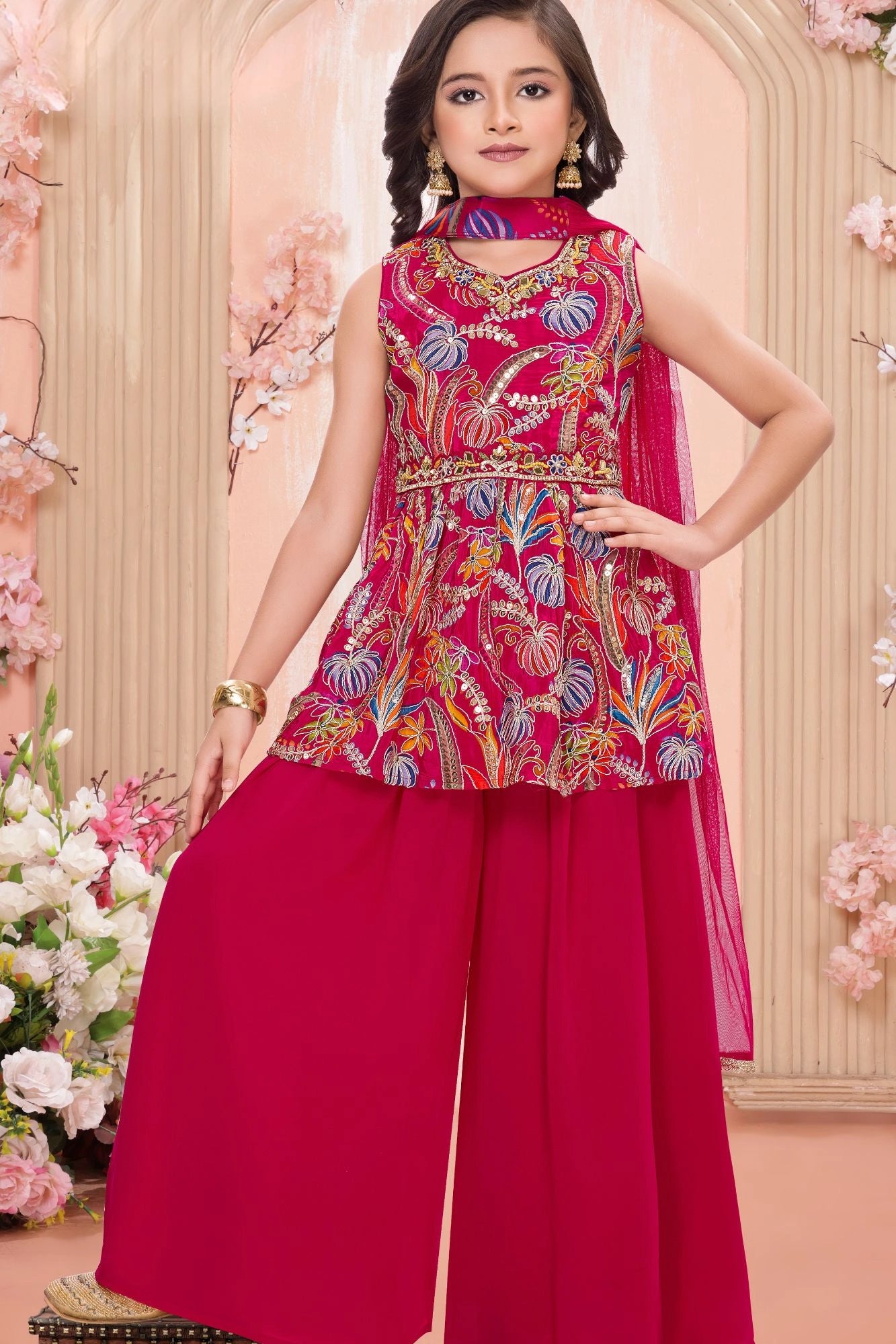Rani Pink Palazzo Set With Embroidered Multicolor Peplum Top For Girls