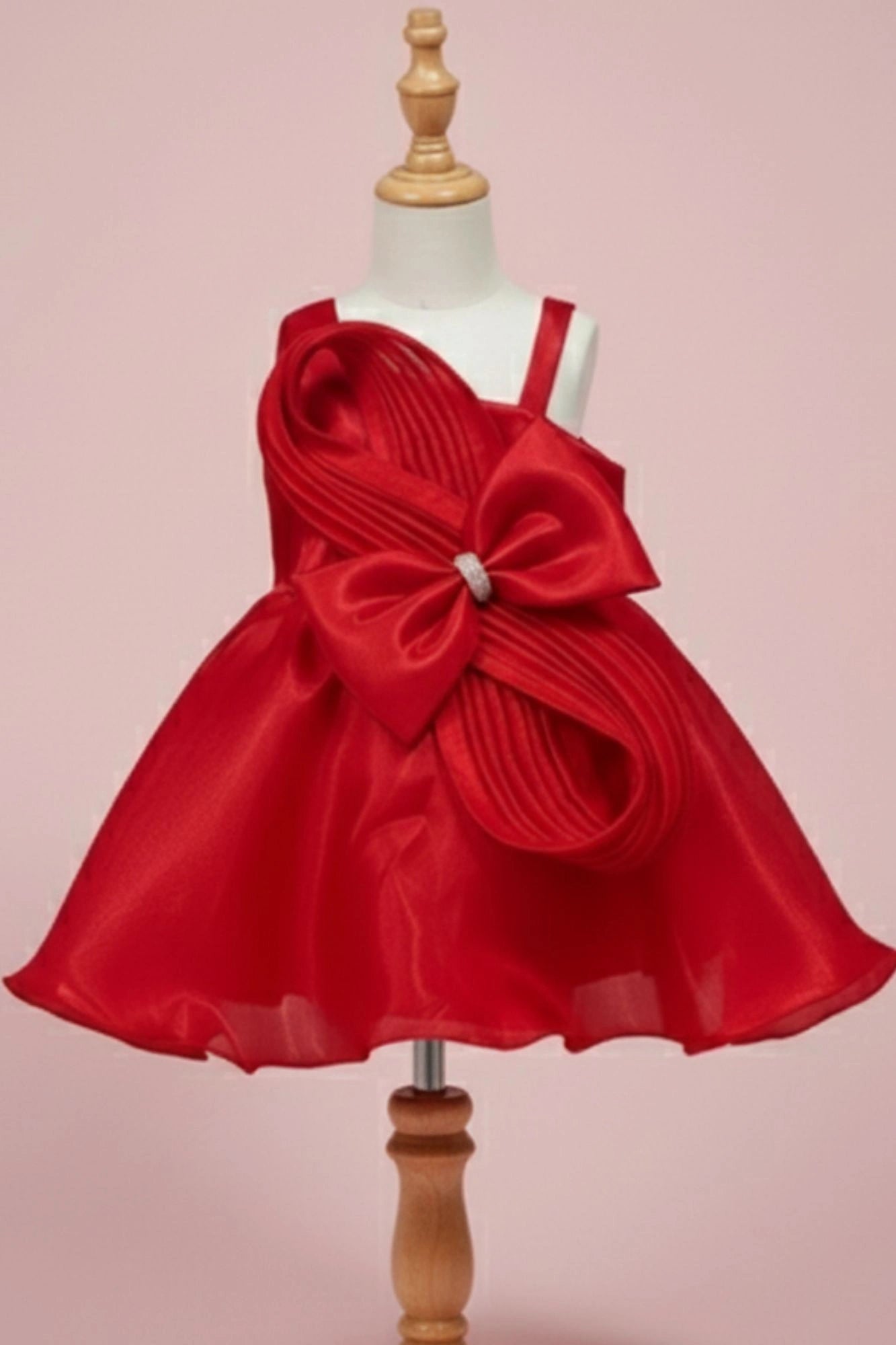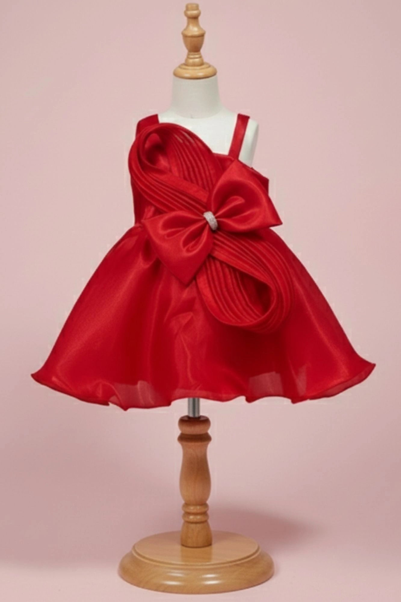 Red Embellished Party Frock with Pleated Petal Bow For Girls