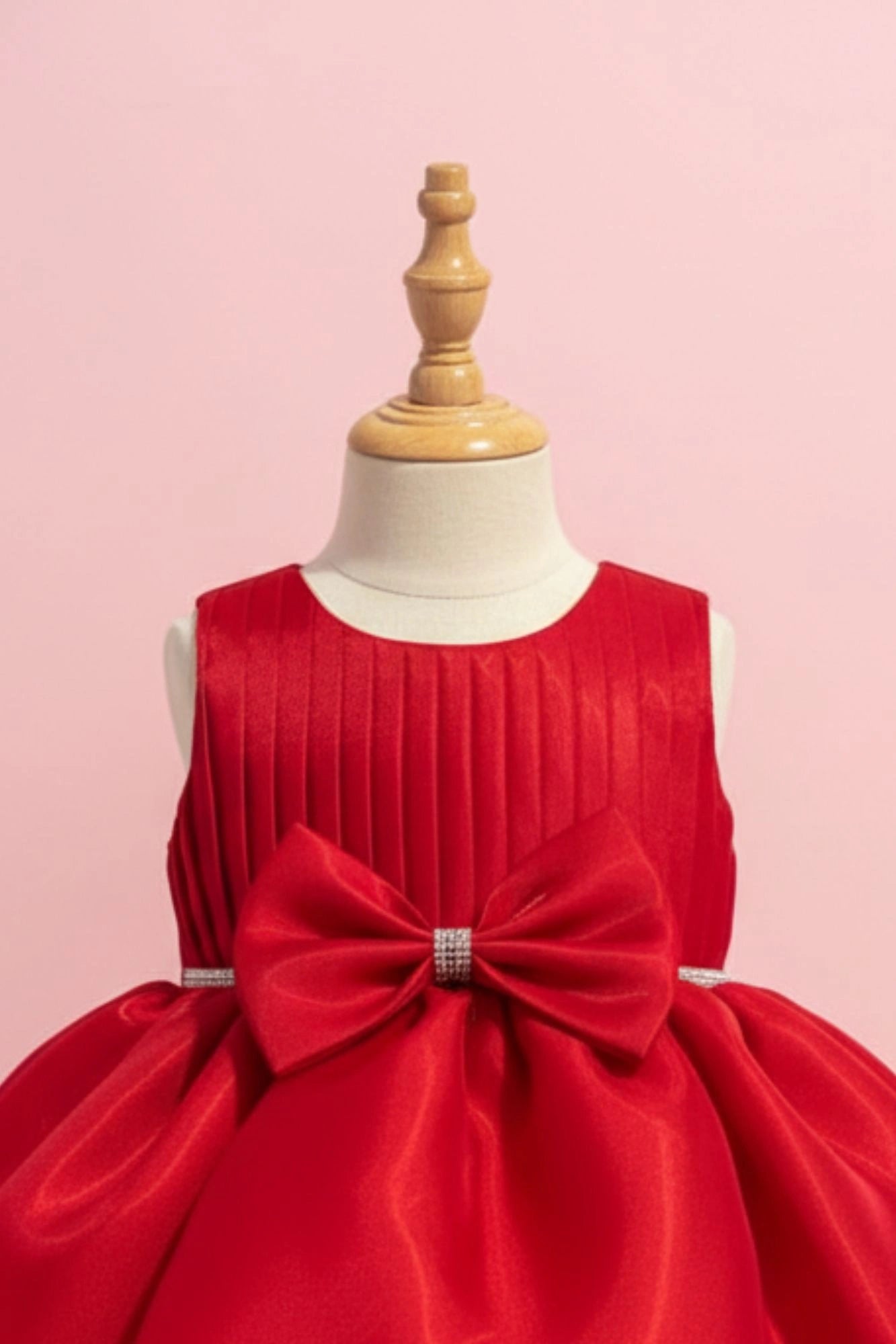Ruby Red Party Frock with Pleated Bodice and Bow Belt For Girls