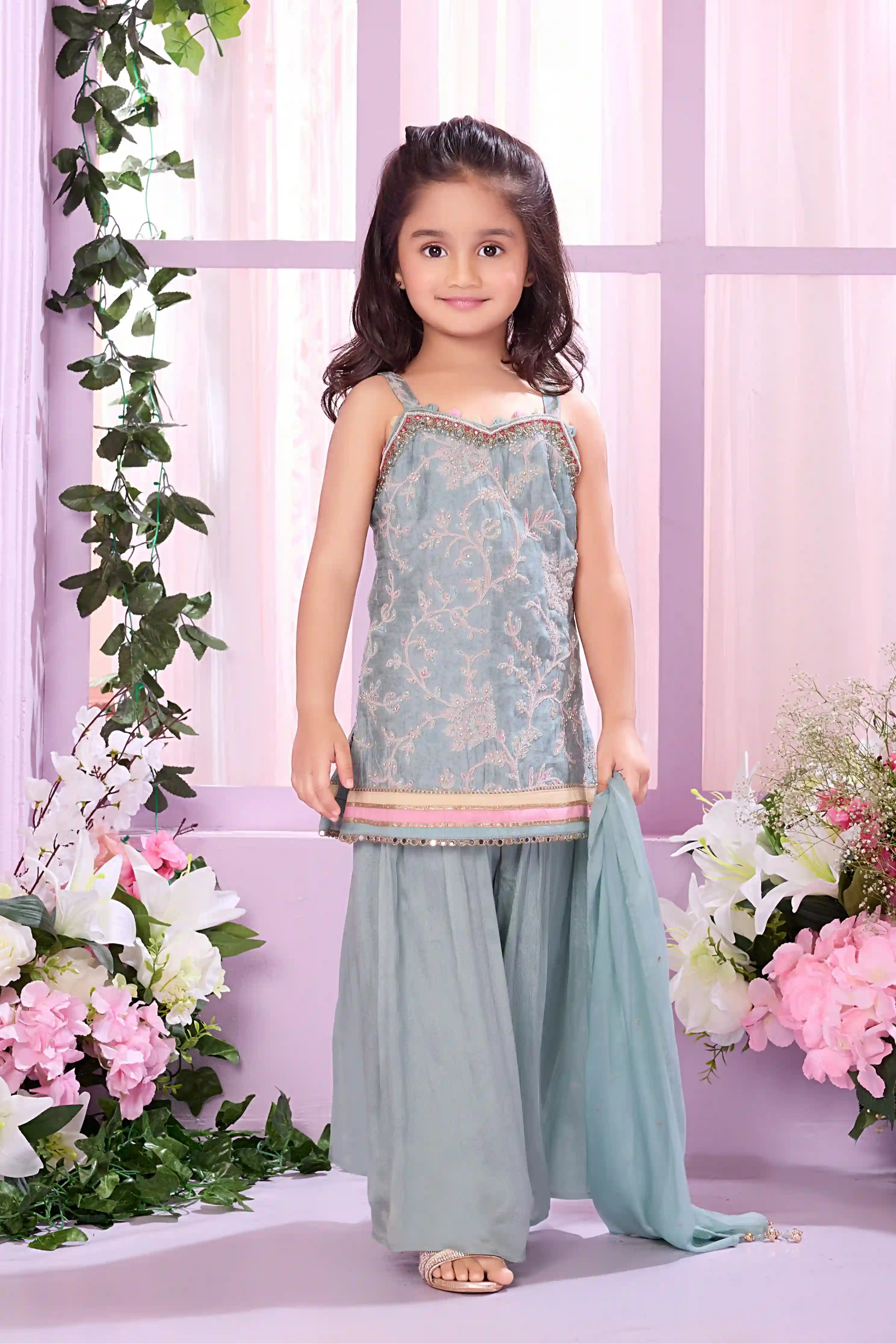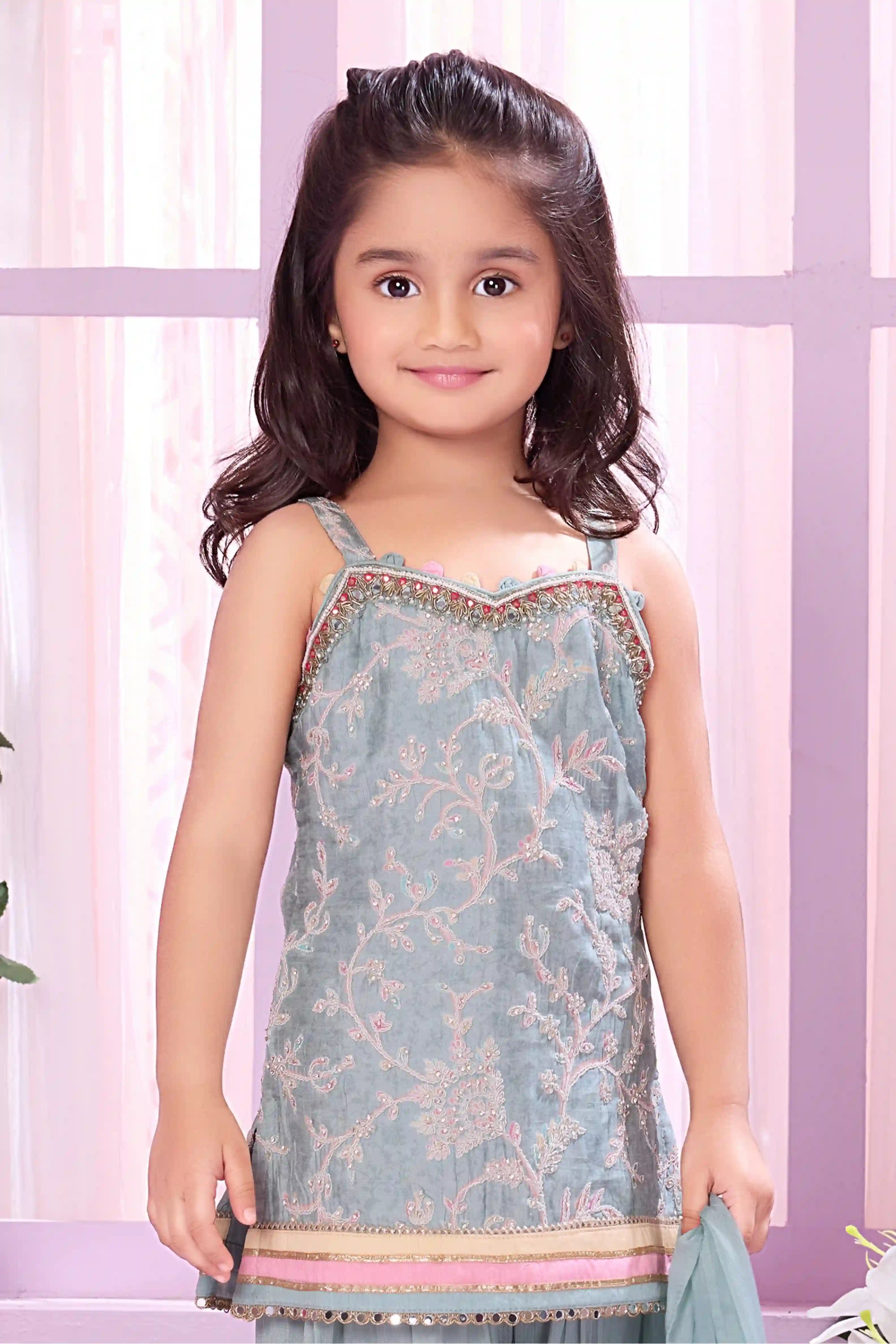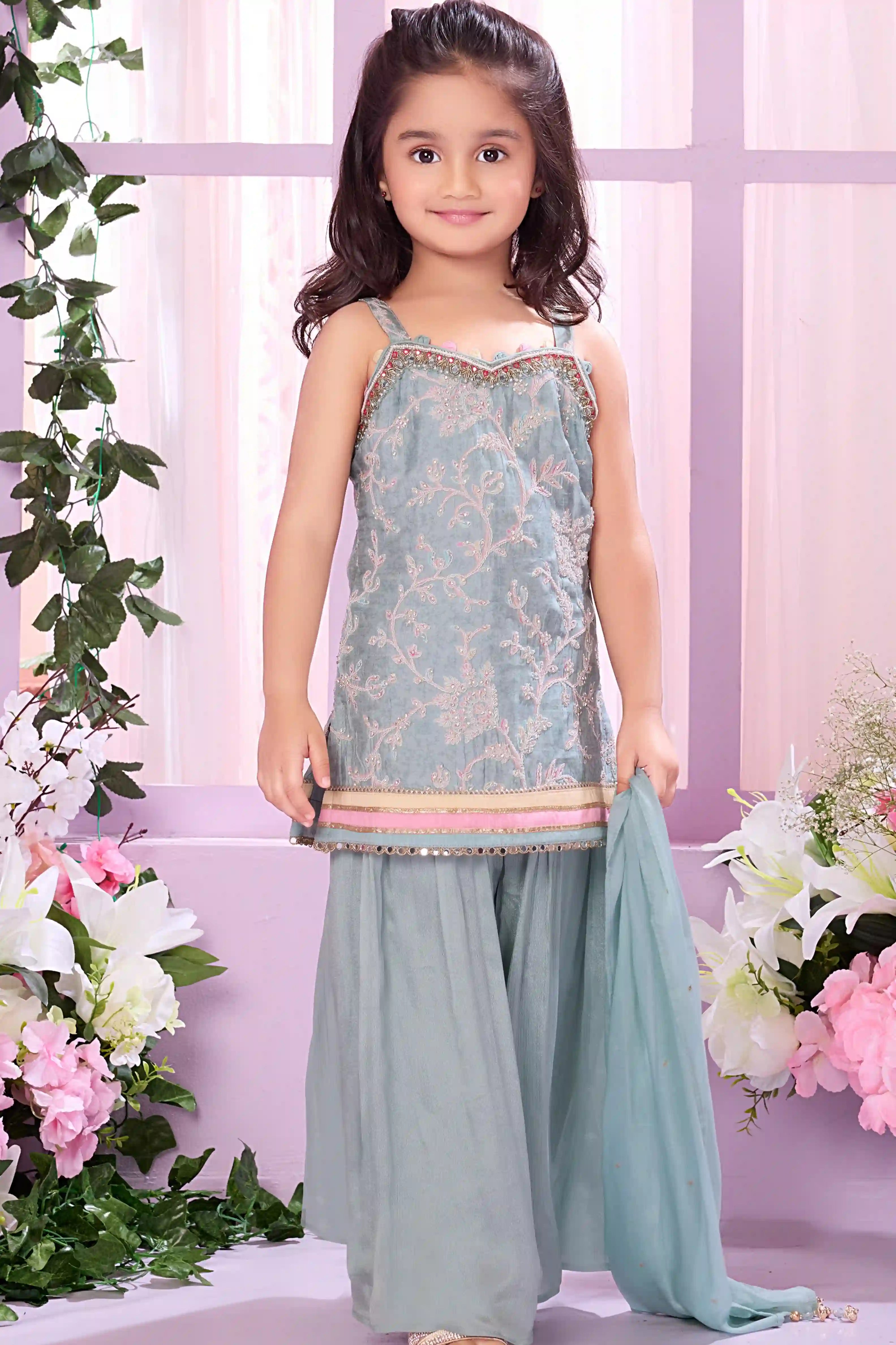 Teal Blue Floral Embroidered Ethnic Lehenga Choli for Girls