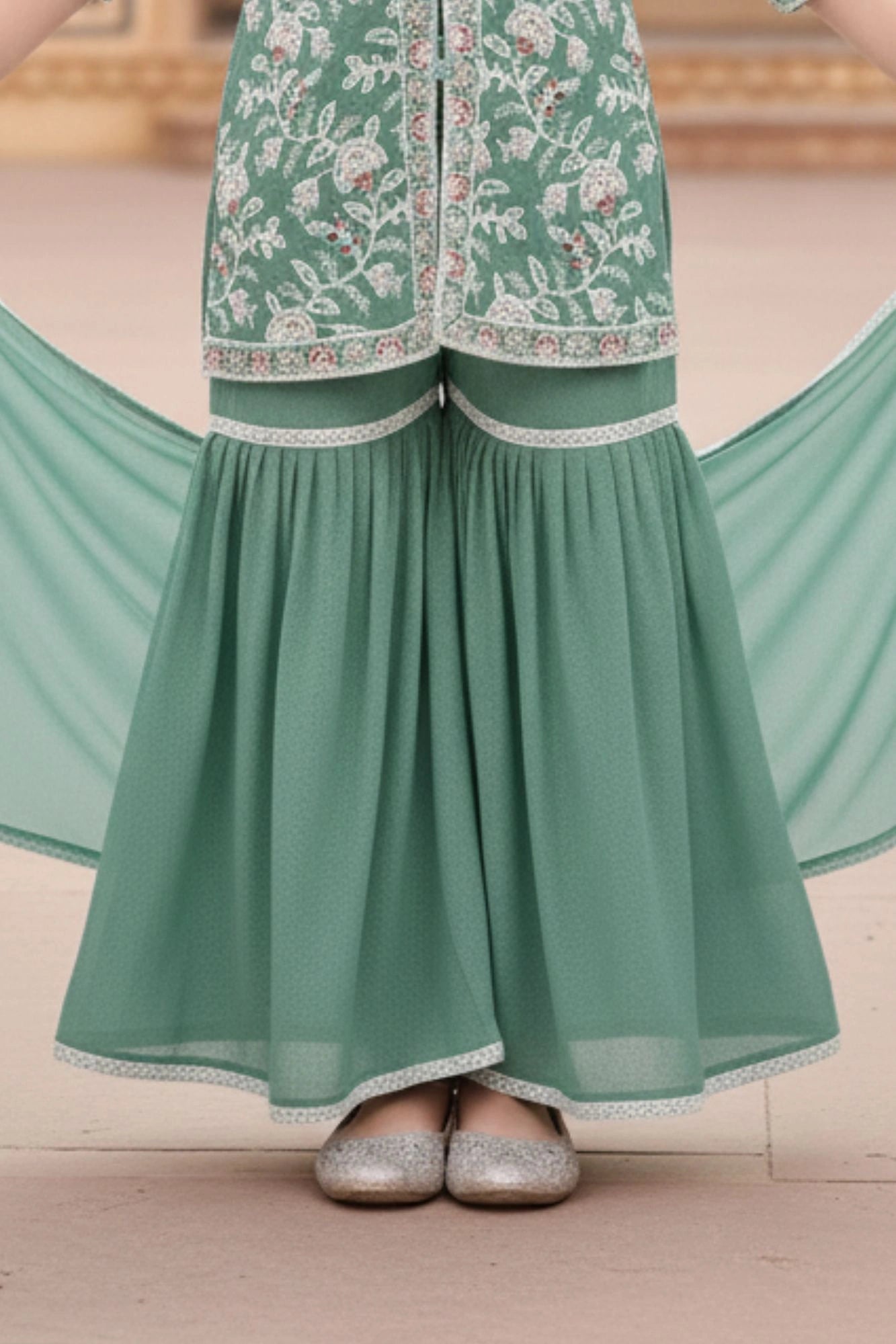 Sea Green Thread Embroidered Short Kurti with Sharara and Dupatta For Girls