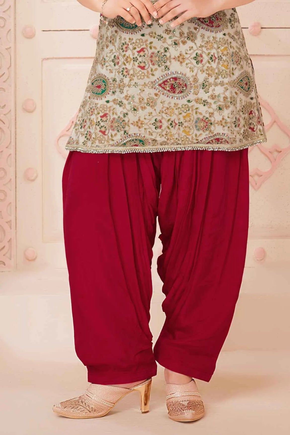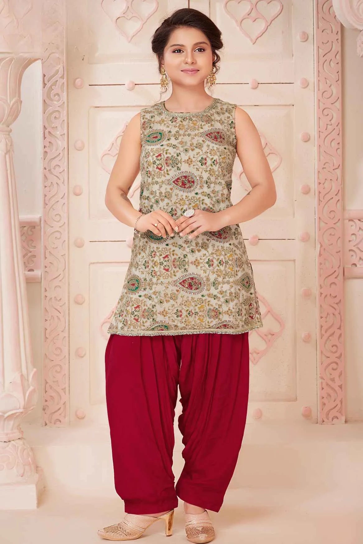 Cream Embroidered Kurti with Orange Patiala Set for Girls
