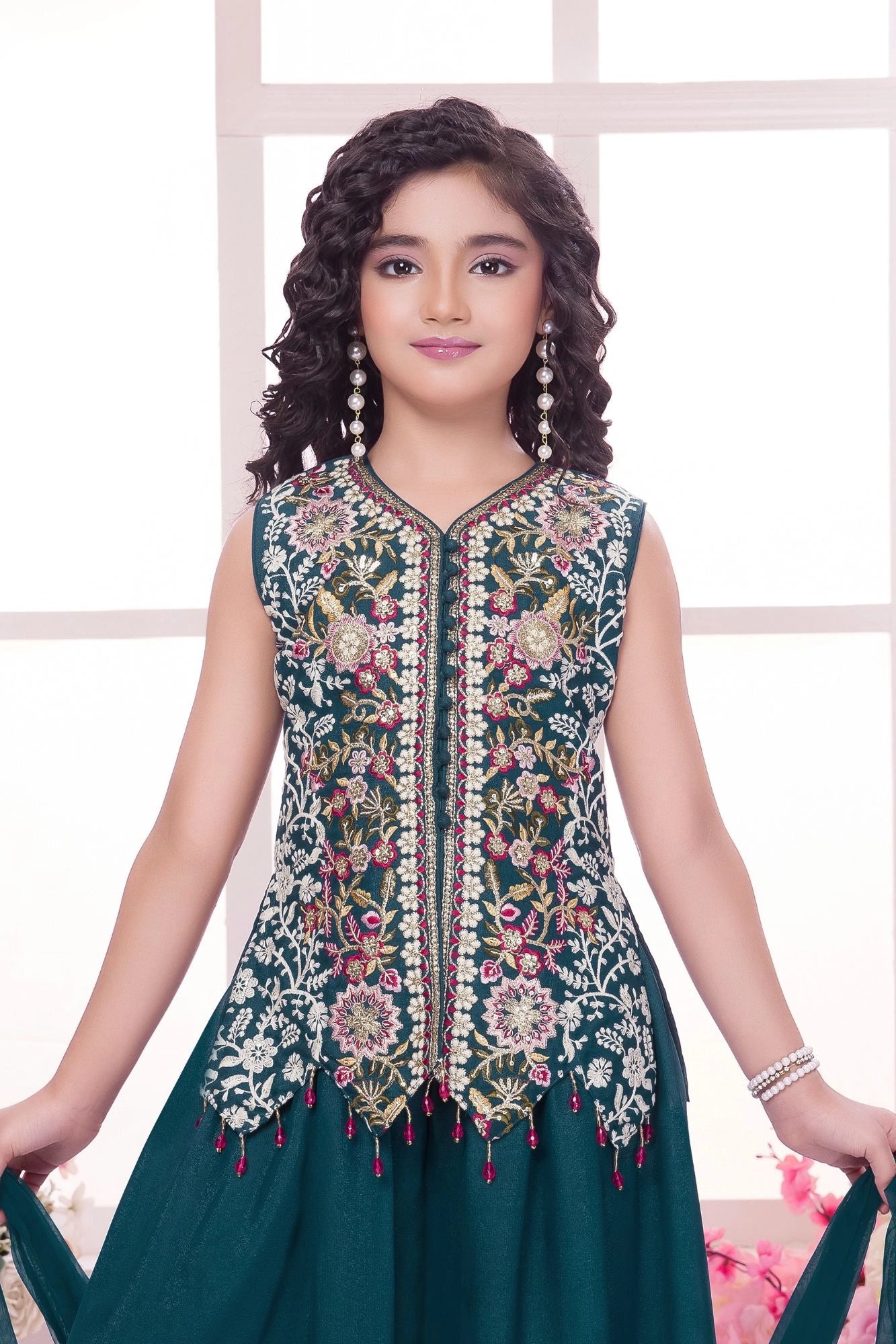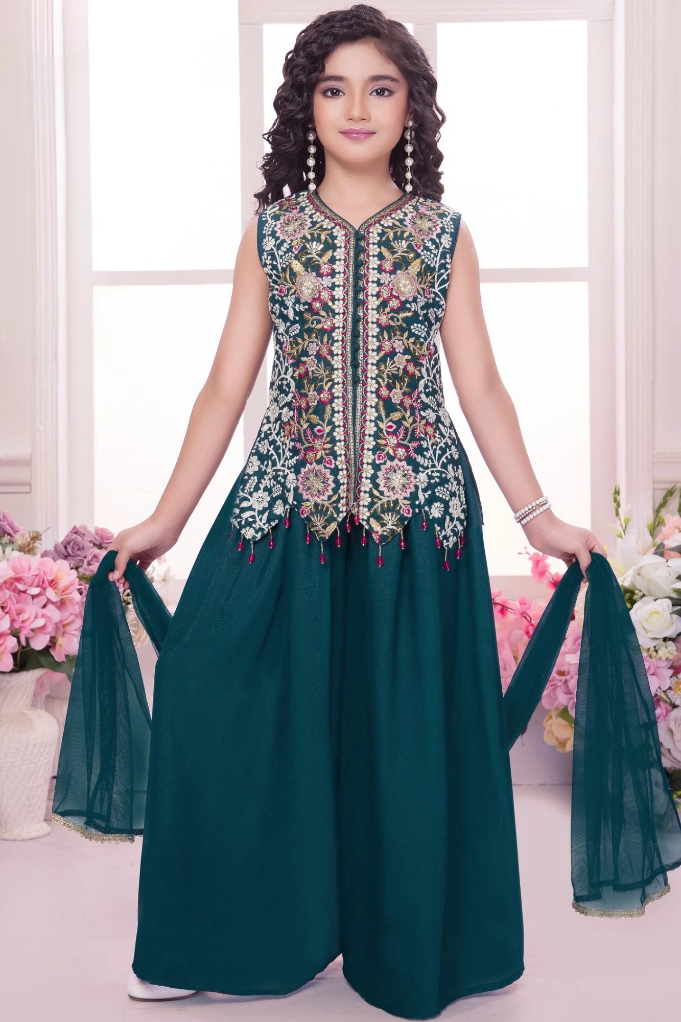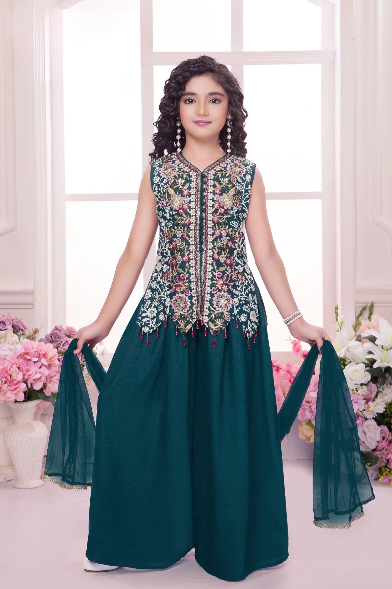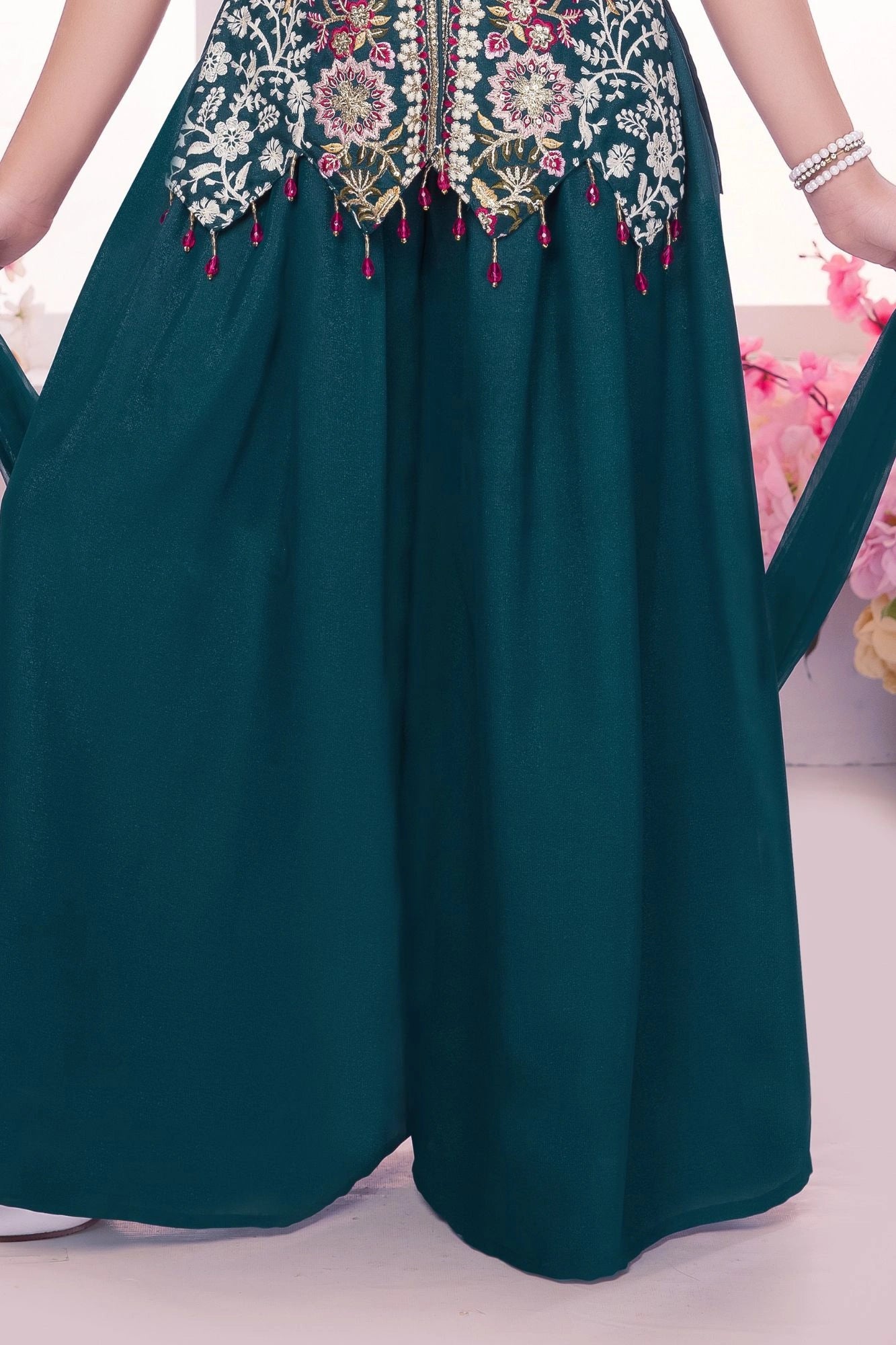 Teal Blue Heavy Embroidered Palazzo Set for Girls