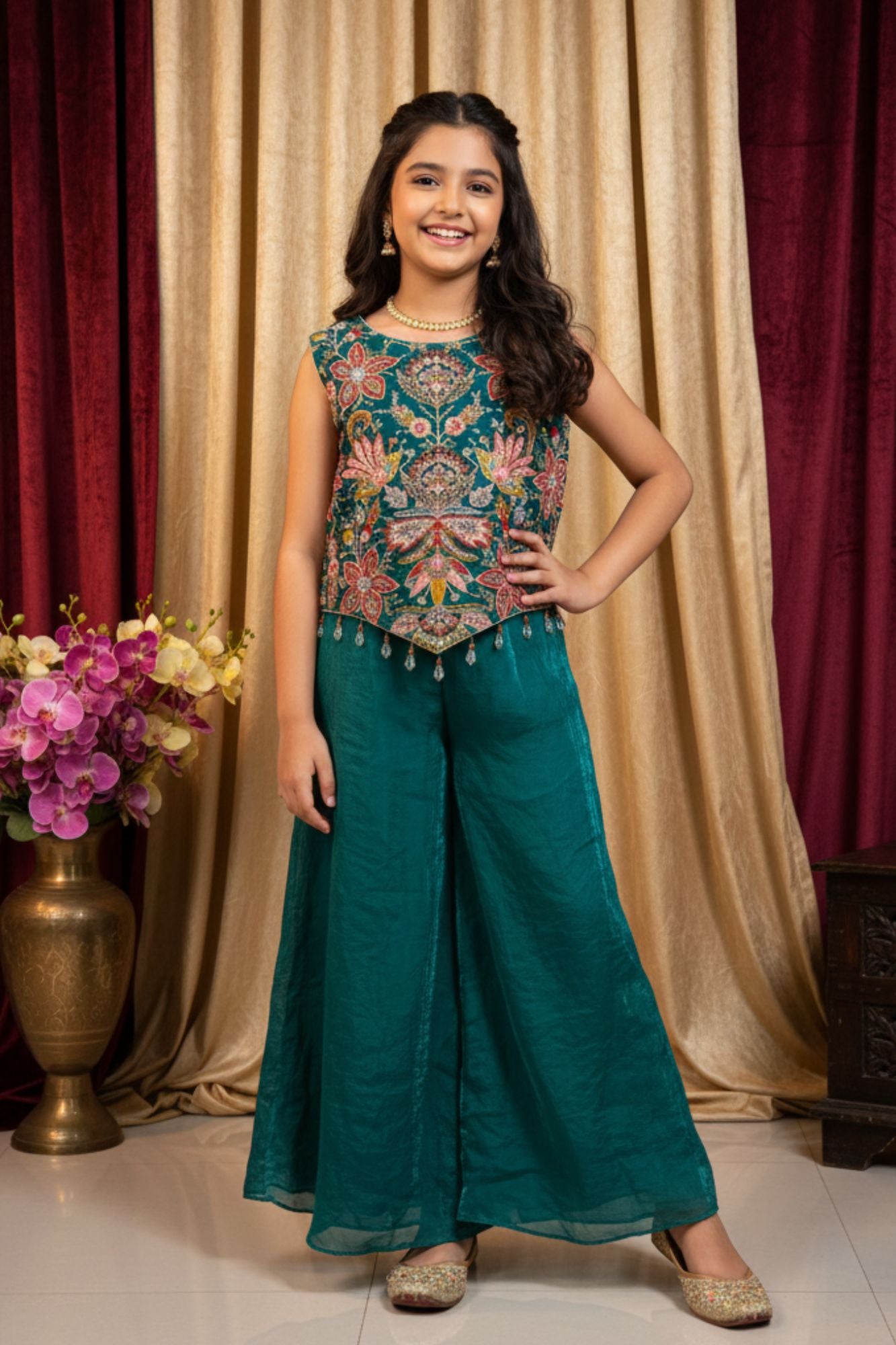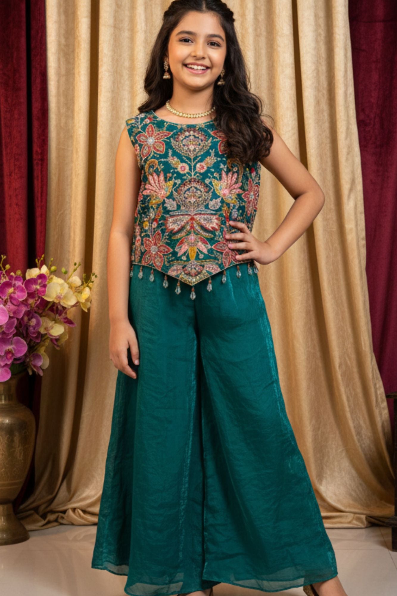 Teal Green Embroidered Palazzo Set For Girls