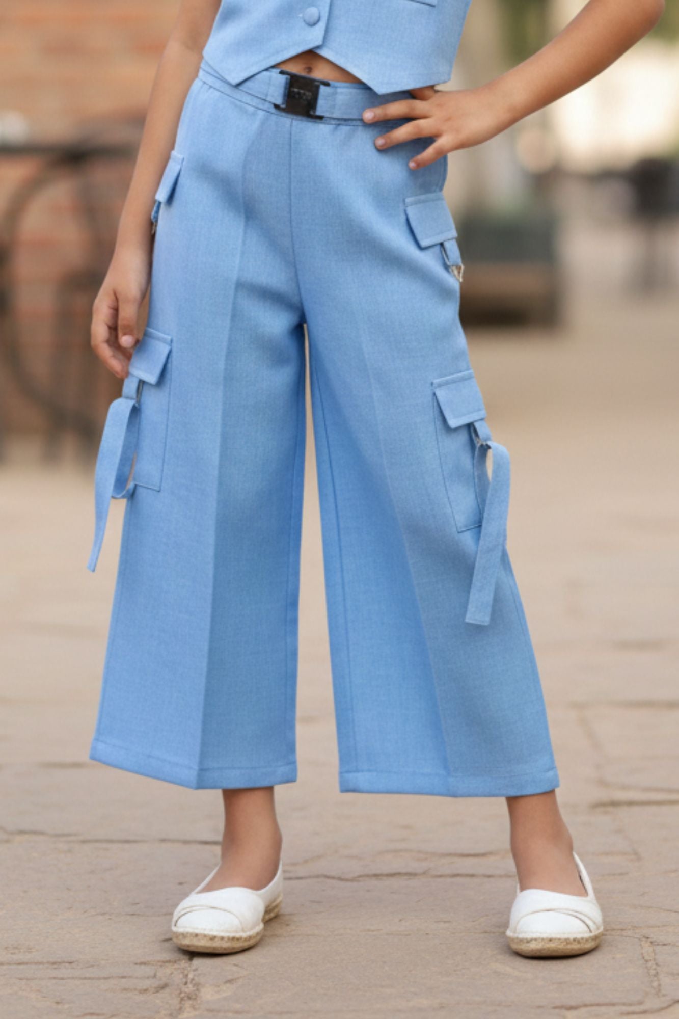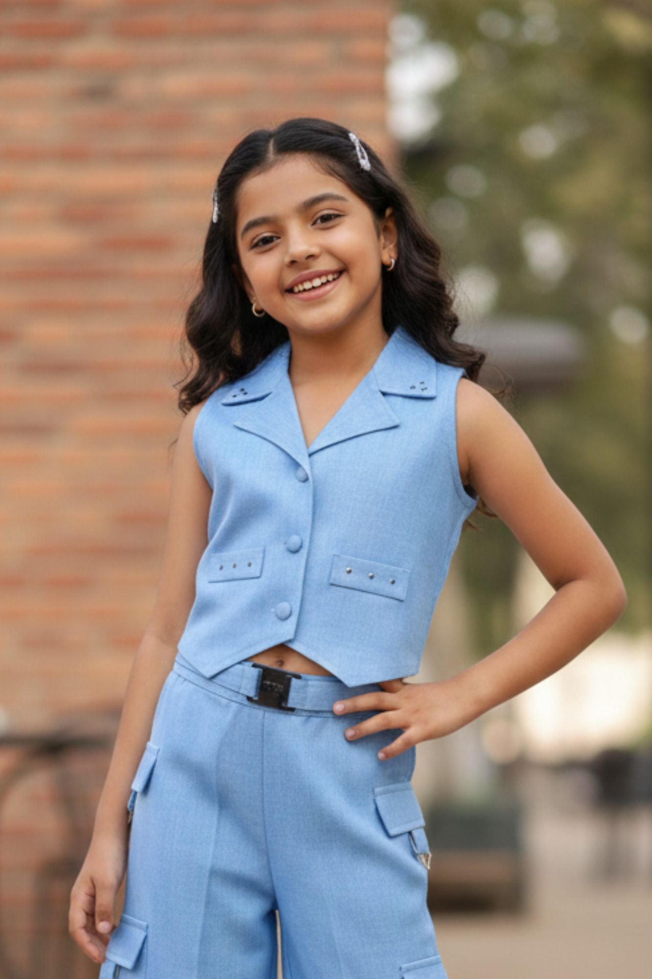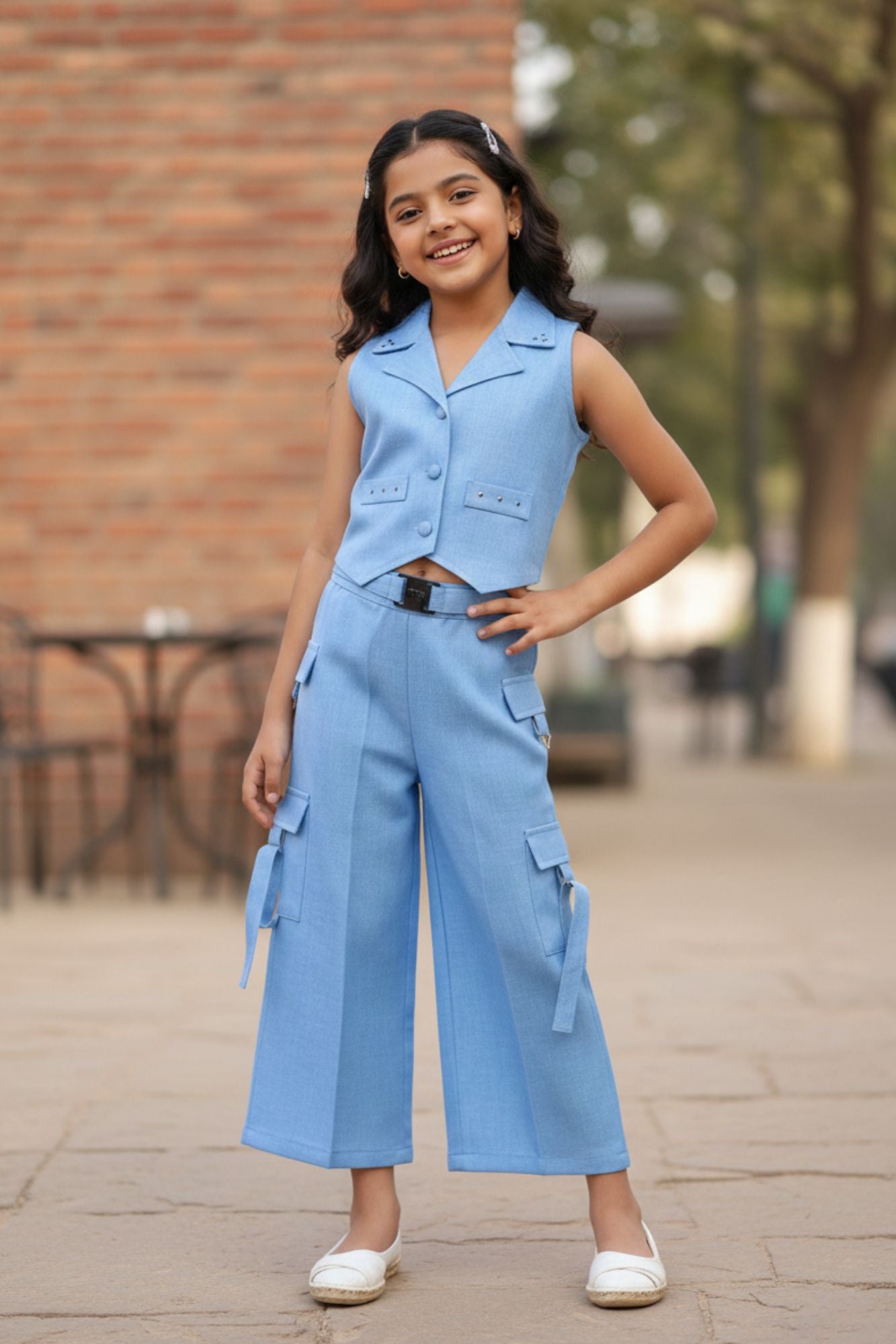طقم عصري من جاكيت وبنطلون أزرق سماوي بدون أكمام للبنات