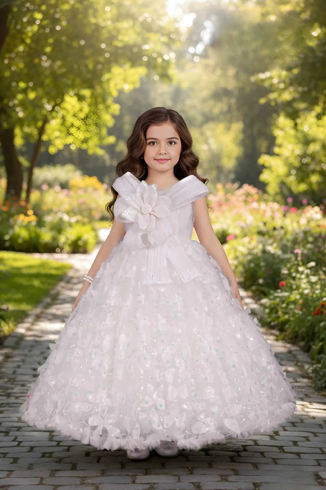 Designer Peach Shimmer Printed Party Wear Gown With Pearl Work For Girls
