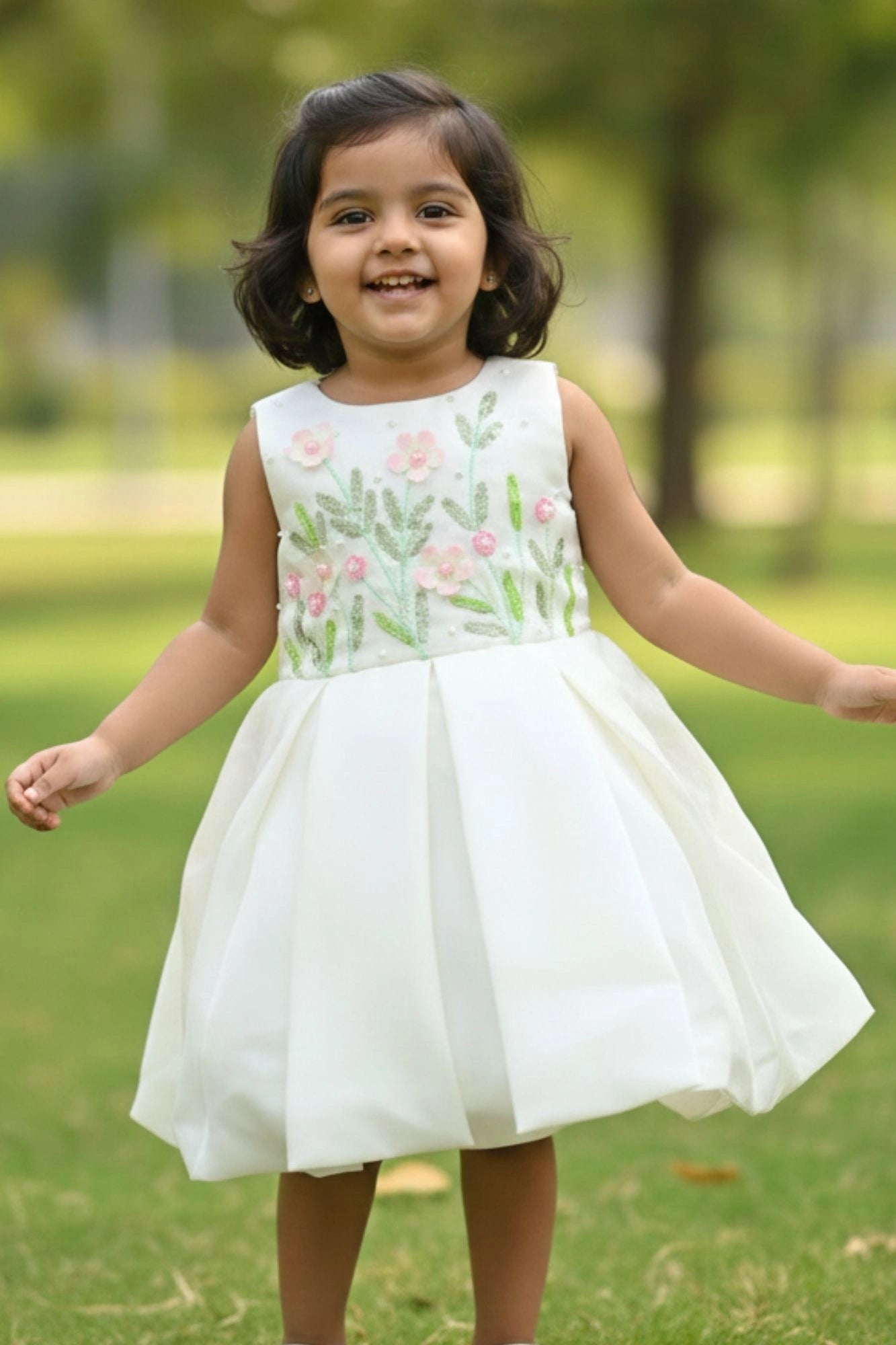 White Floral Sequins Embroidered Party Wear Frock For Girls