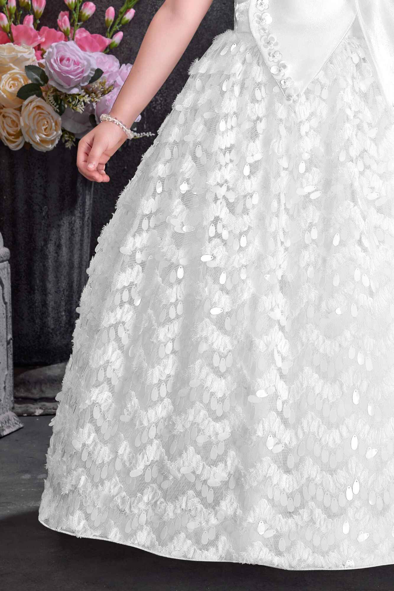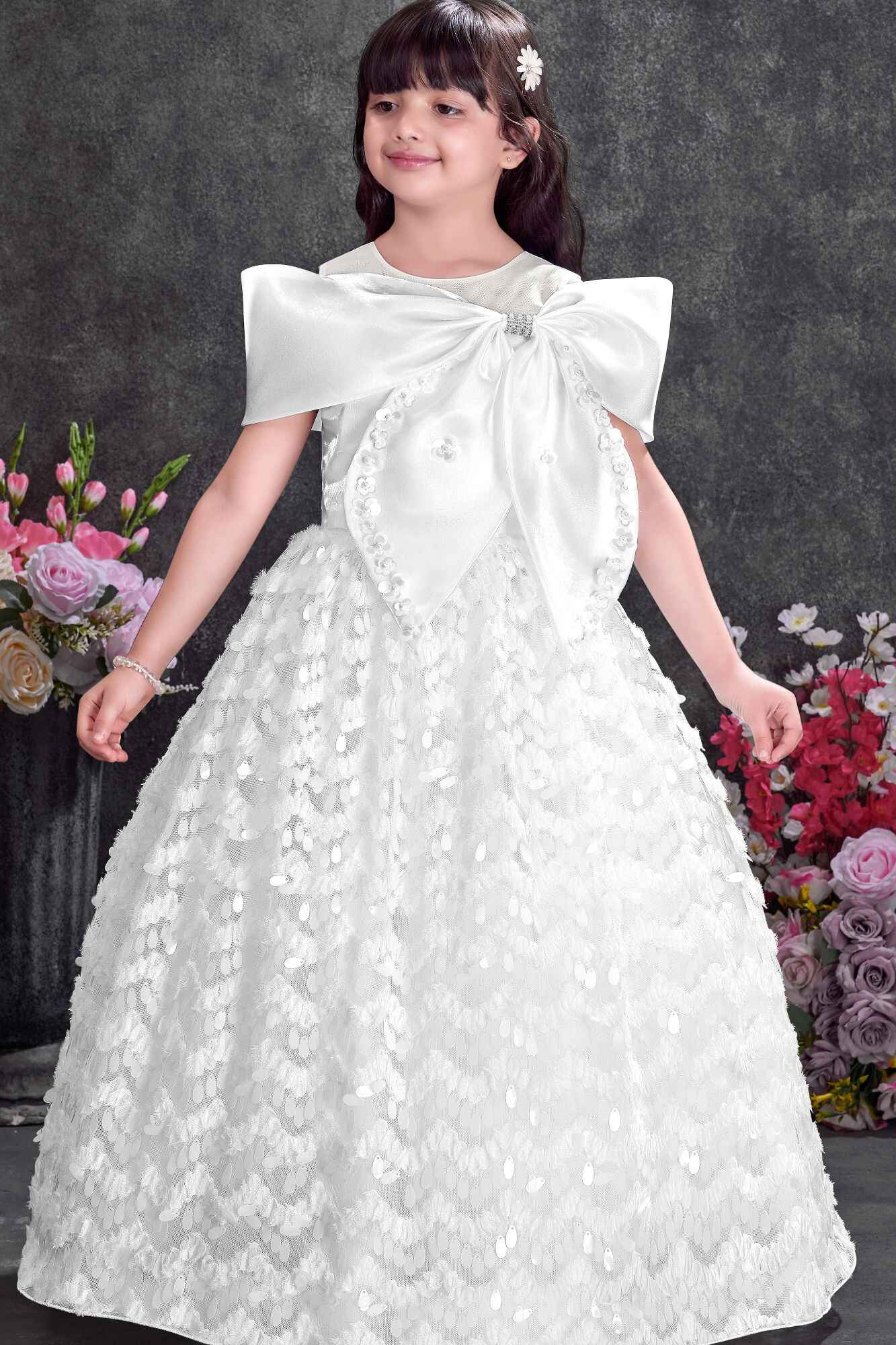 White Party Wear Gown with Statement Bow And Textured Skirt For Girls