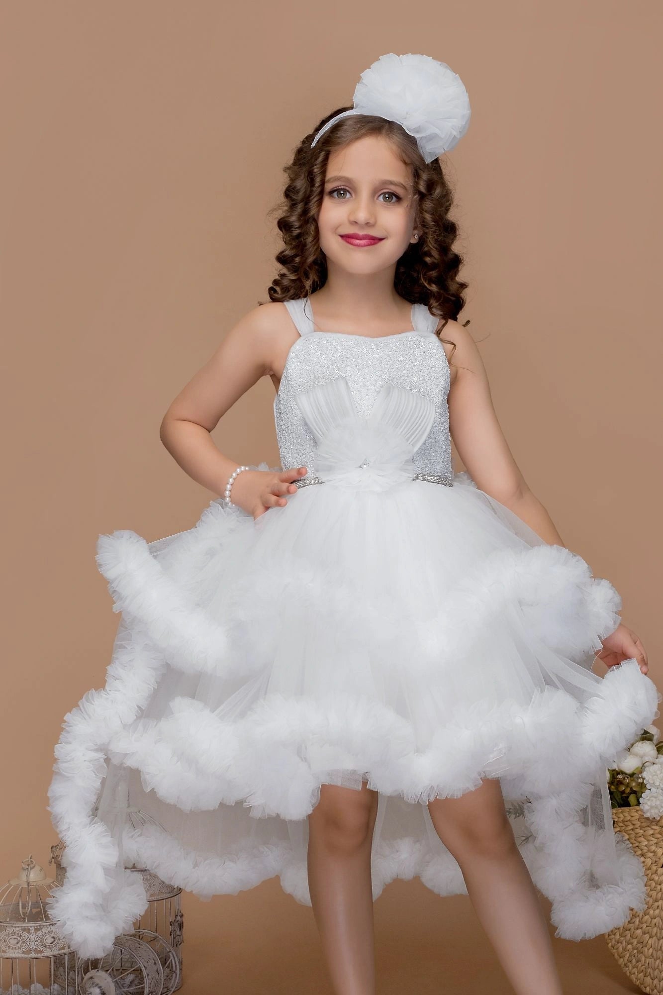White Sequin High-Low Layered Party Frock with Bow For Girls