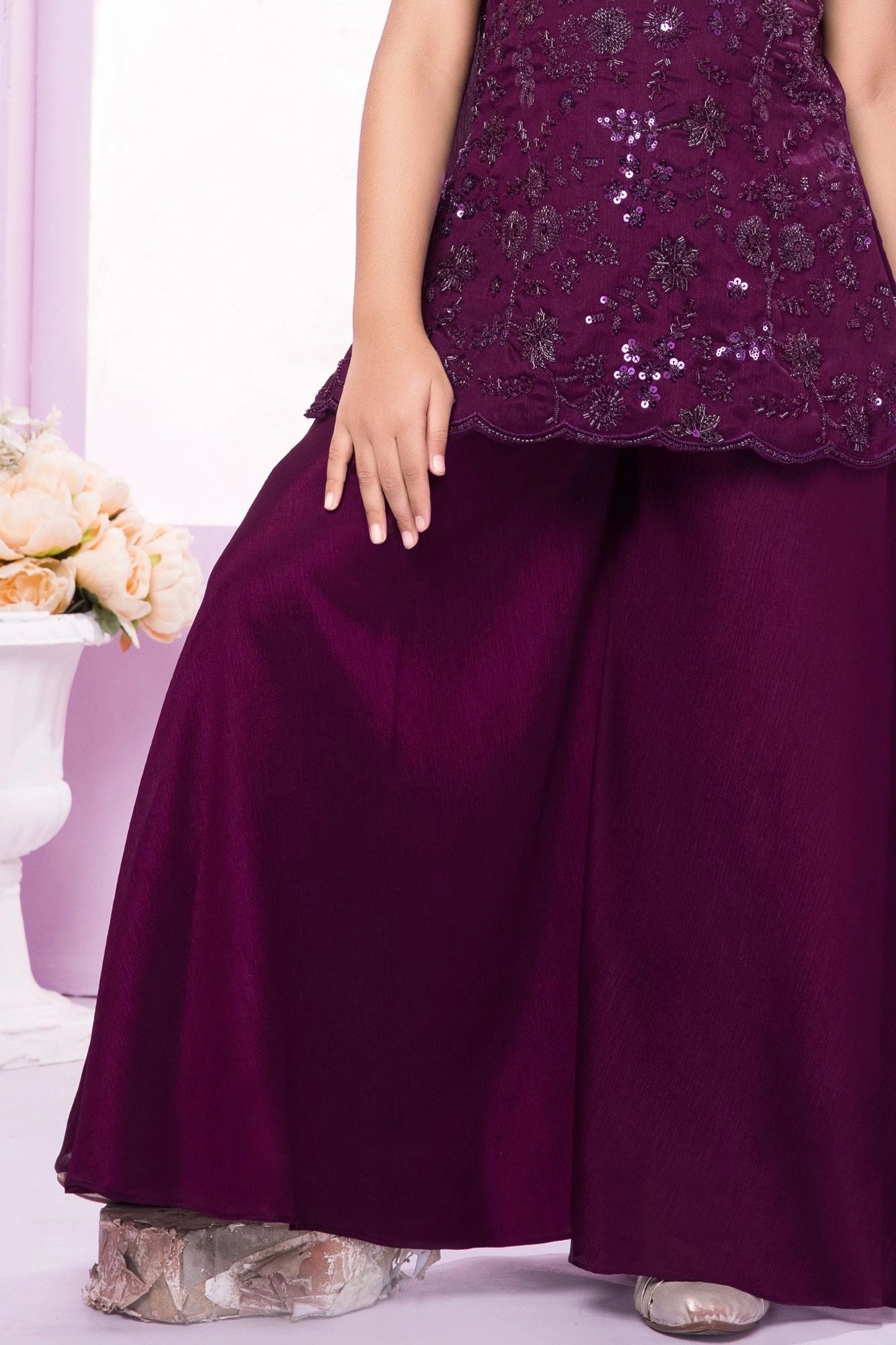 Wine Sequin Embroidered Palazzo Set with Dupatta For Girls