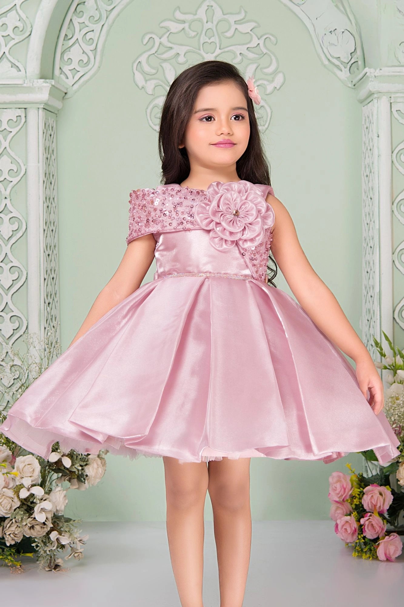 Baby Pink Embellished Party Frock With 3D Flower For Girls