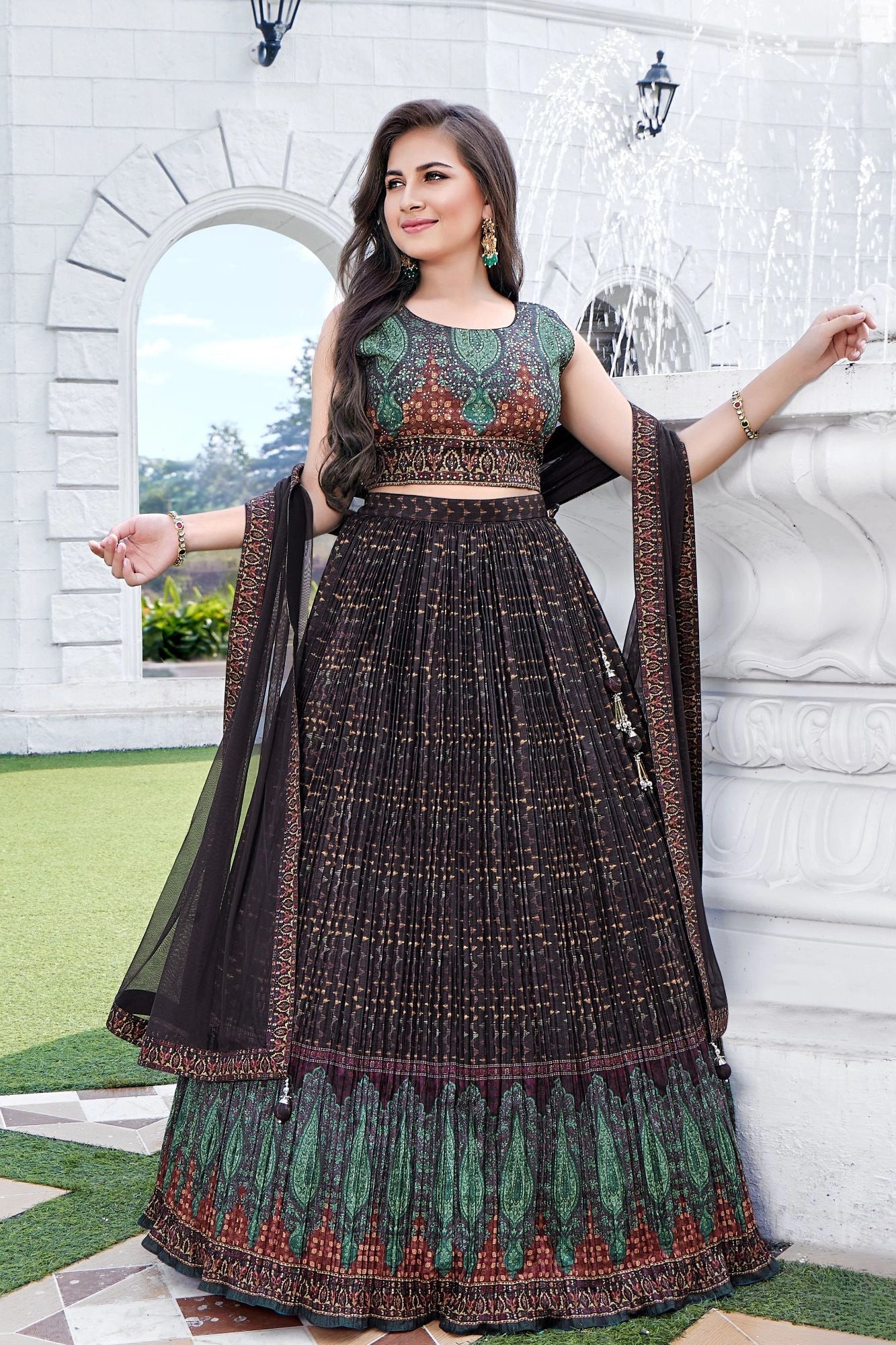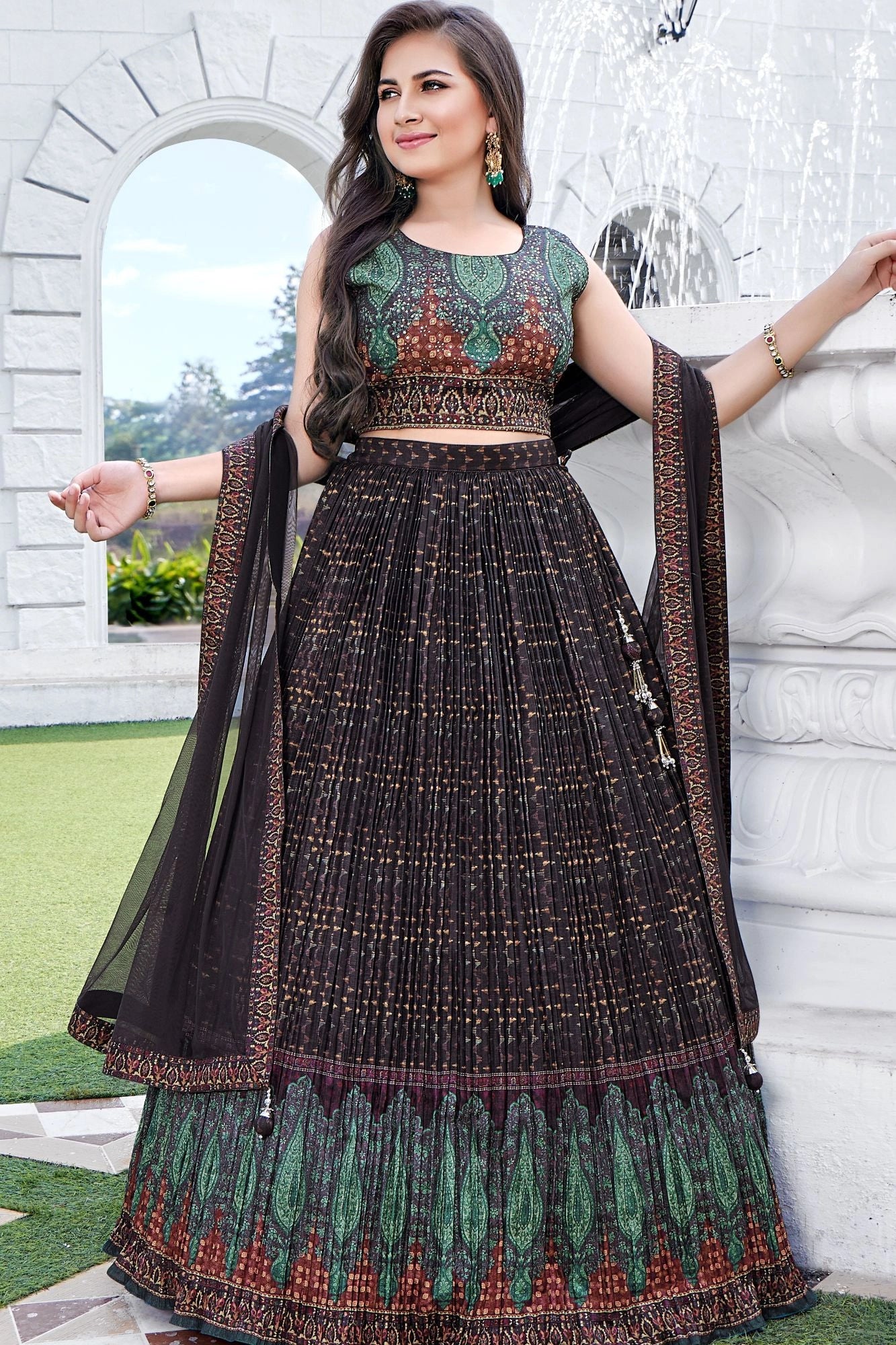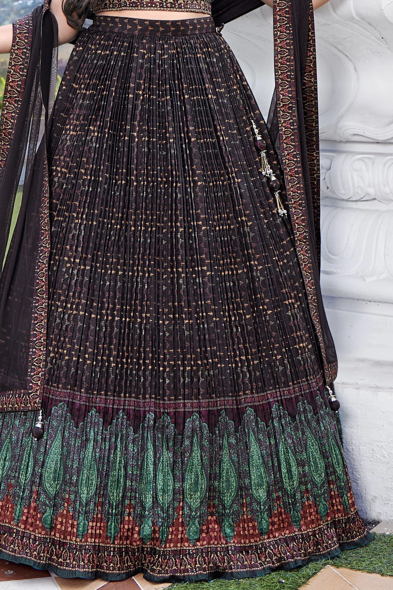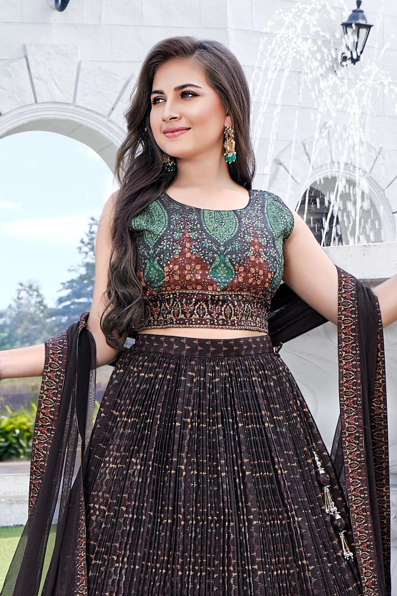 Black and Green Printed Crop Top with Pleated Lehenga and Dupatta For Girls