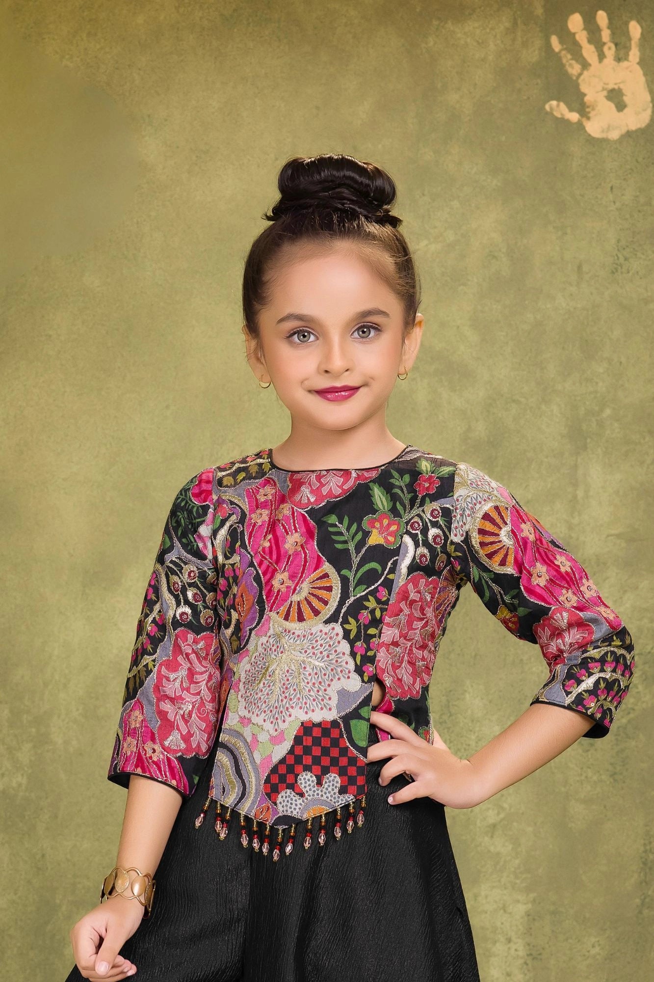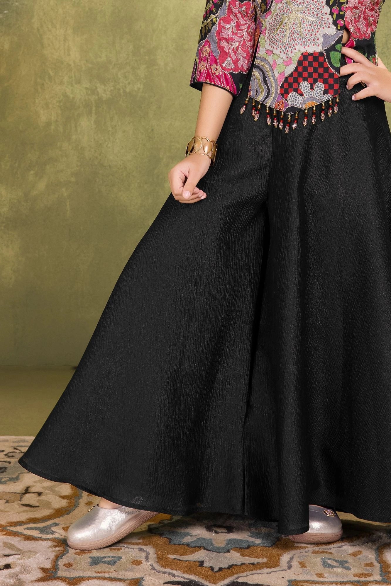 Black & Multicolor Embroidered Palazzo Set For Girls